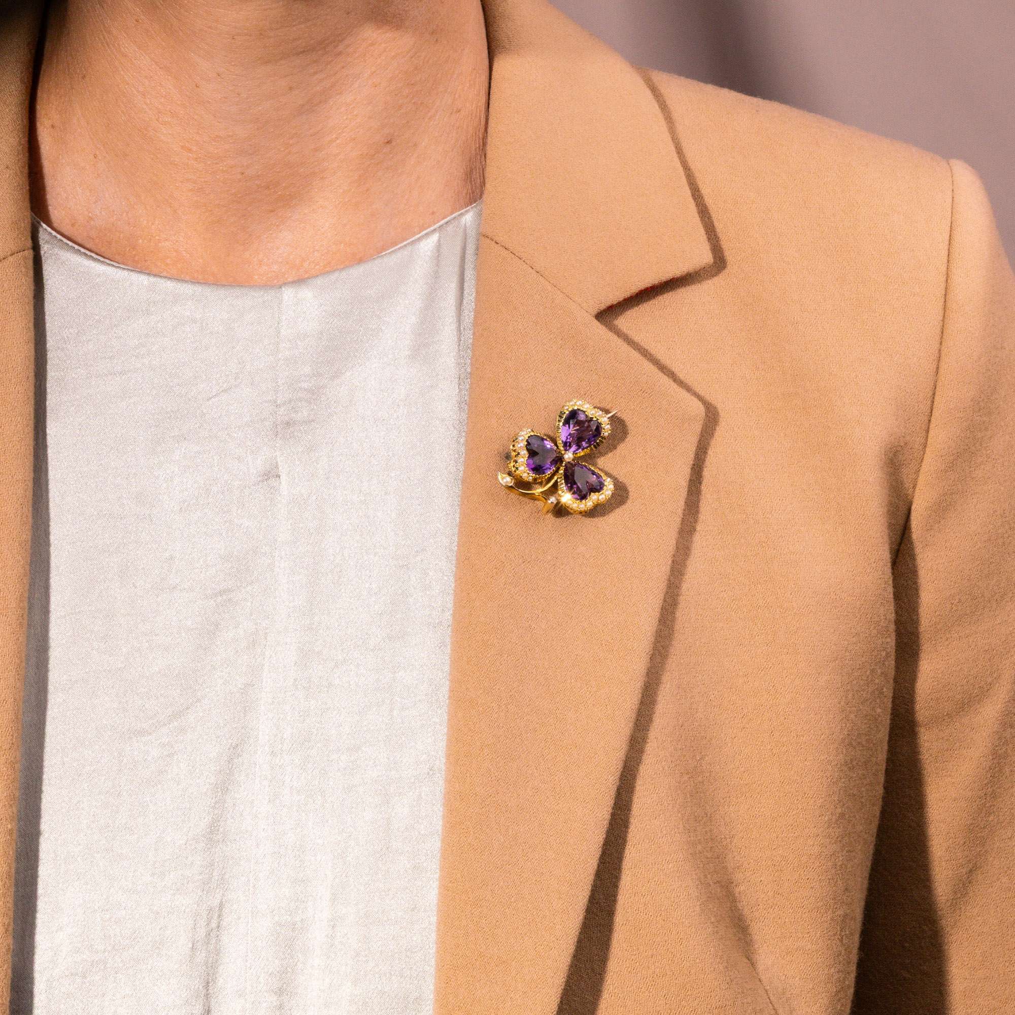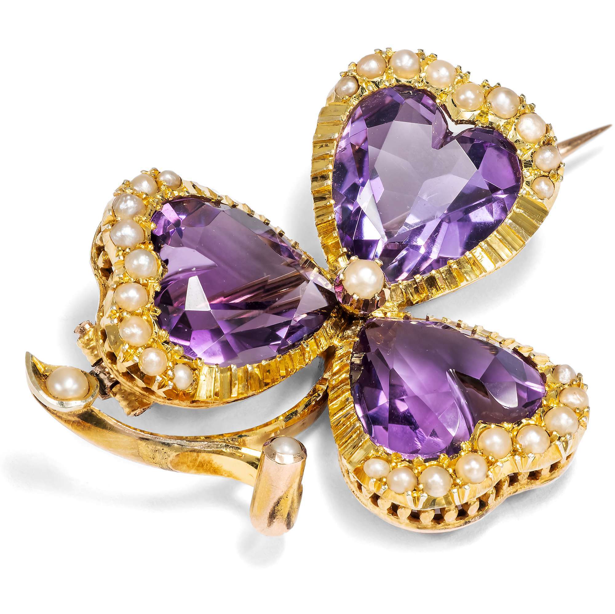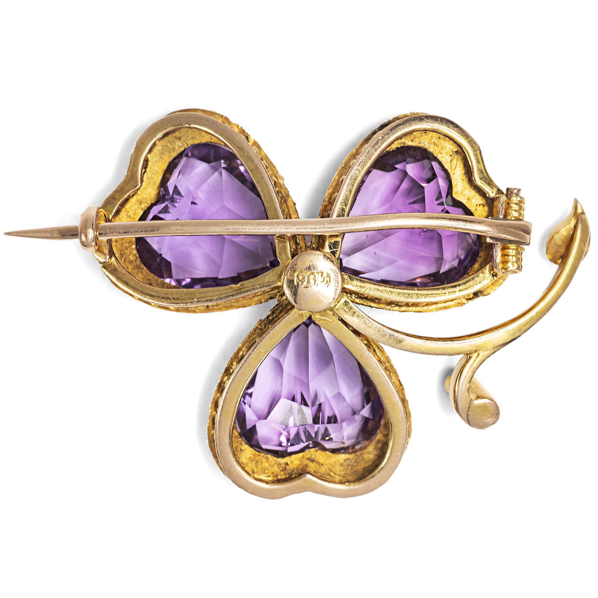 Die vorliegende Brosche aus der Zeit um die vorletzte Jahrhundertwende greift dieses alte Sinnbild auf. Das Schmuckstück ist aus 9-karätigem Gold gefertigt und in Form eines dreiblättrigen Kleeblatts gestaltet. Die Blätter zieren violette Amethyste im Herzschliff, ergänzt durch kleine Perlen.