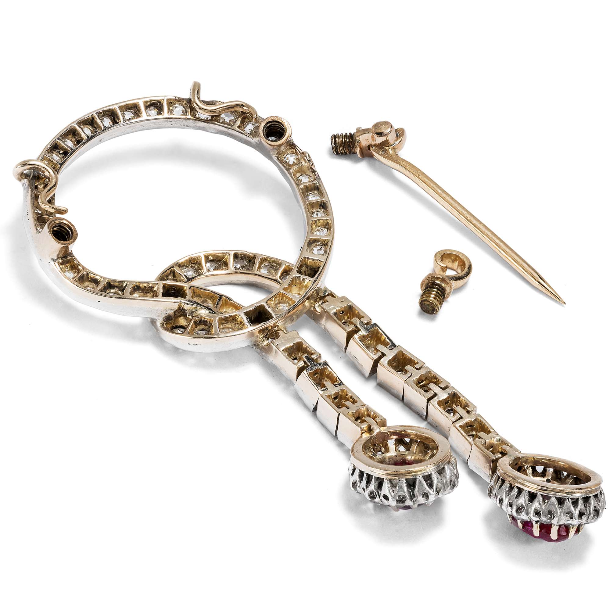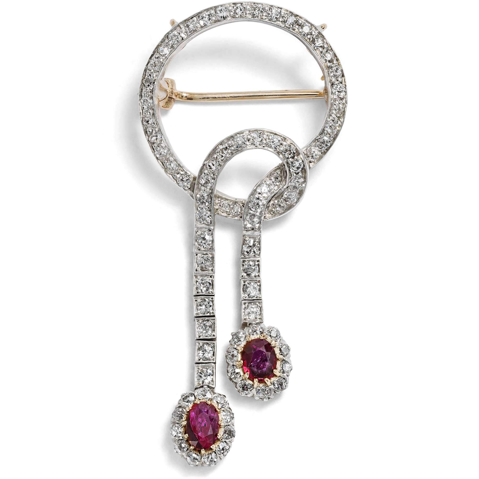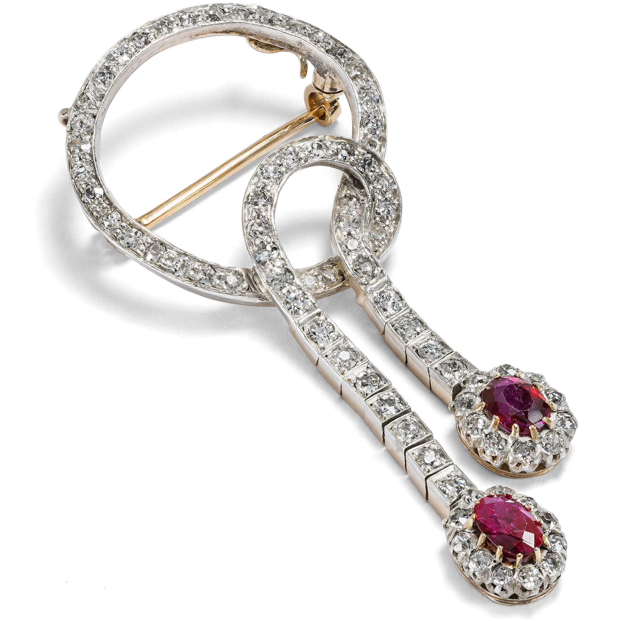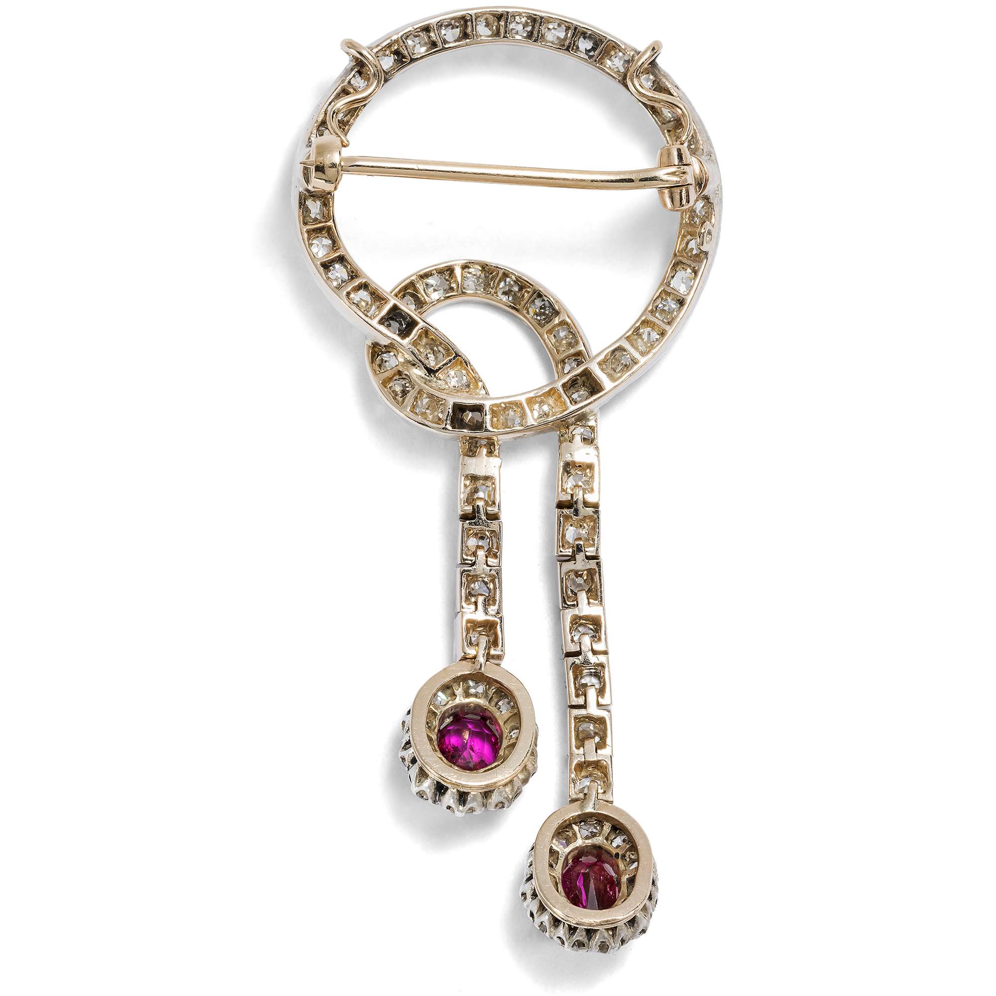Das hier vorliegende Schmuckstück aus den ersten Jahren nach 1900 zeigt, wie das Verbundenheitsmotiv im leichten, heiteren Geschmack der Belle Époque aussehen konnte: Hell leuchtende Diamanten bilden dabei ein weißes Band, an dessen Enden zwei Burma-Rubine in der Farbe der Liebe leuchten. Die Diamanten sind in Silber gefasst, die Rückseite des Schmuckstücks besteht aus Roségold. Besonders schön ist, dass die Pendel, mit vielen Gelenken versehen, ganz weich herabfließen.
