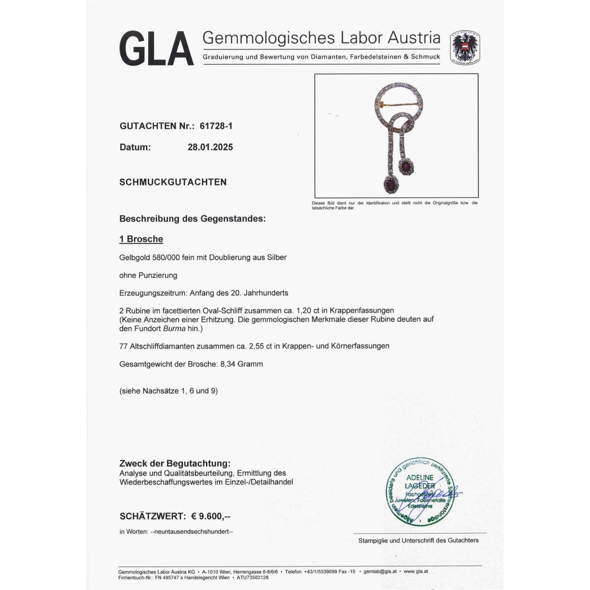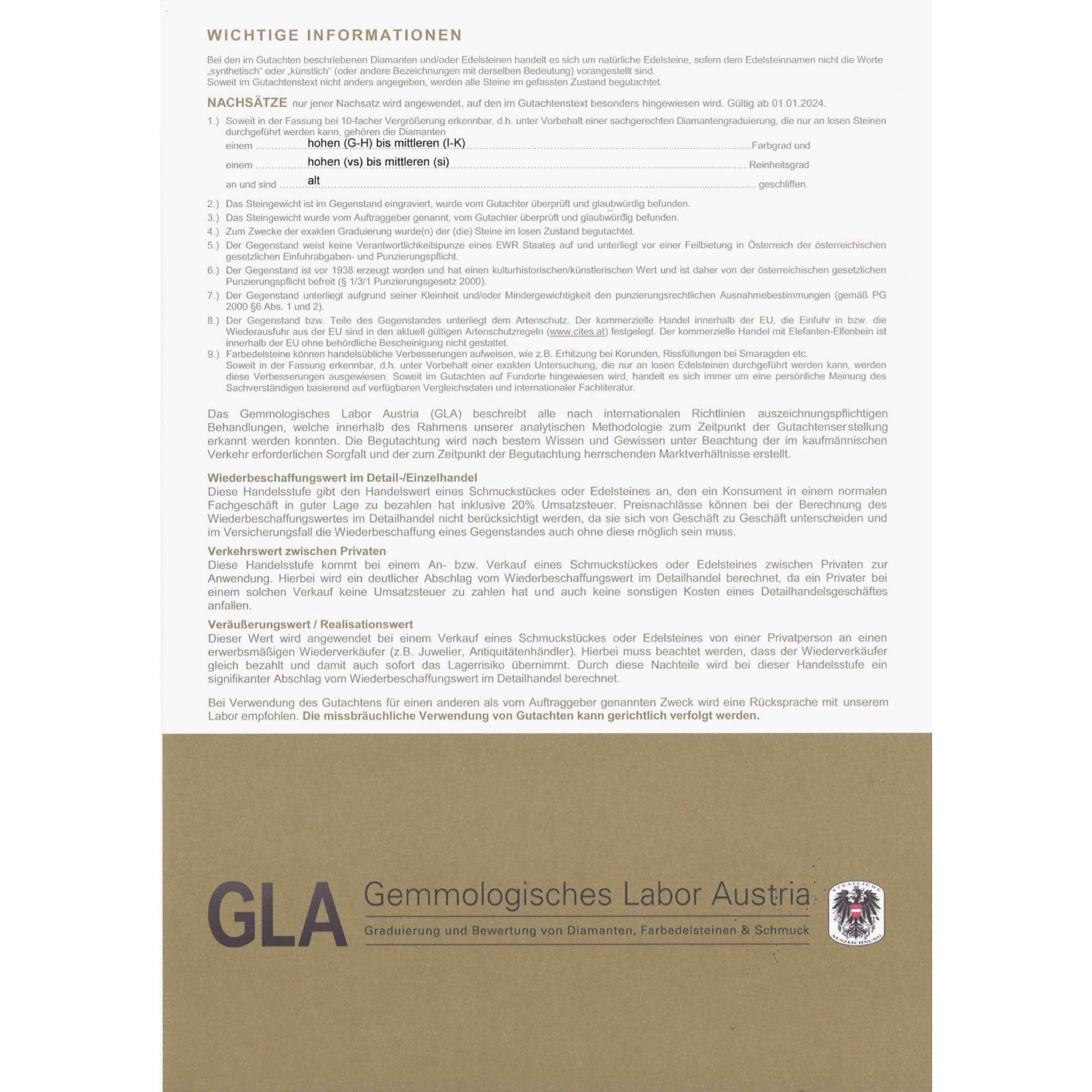 | Zertifikat: | Lieferung mit einem detaillierten Gutachten des Gemmologischen Labor Austria, Wien, vom 28. Januar 2025. Festgestellter Wiederbeschaffungswert: 9.600,- Euro. |