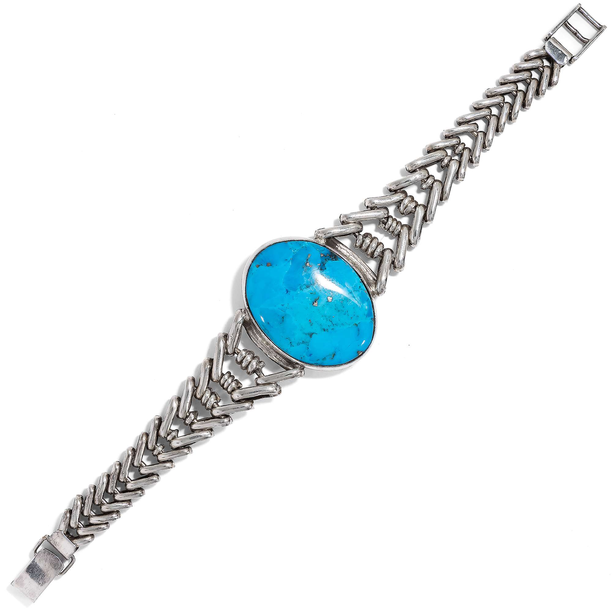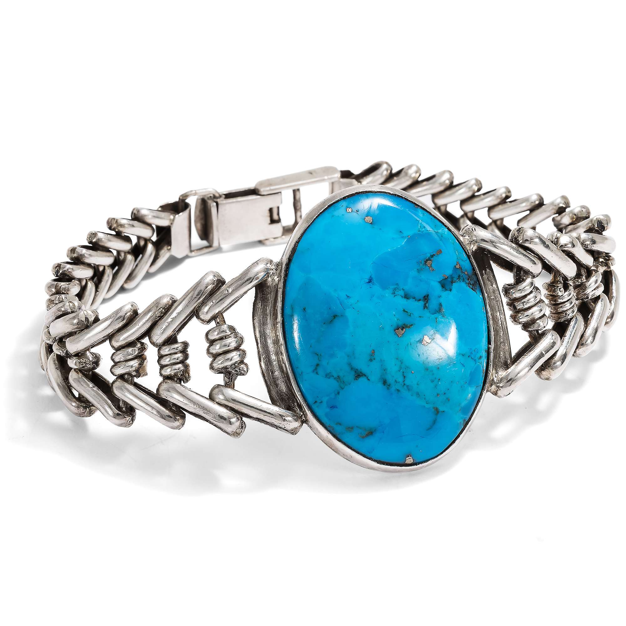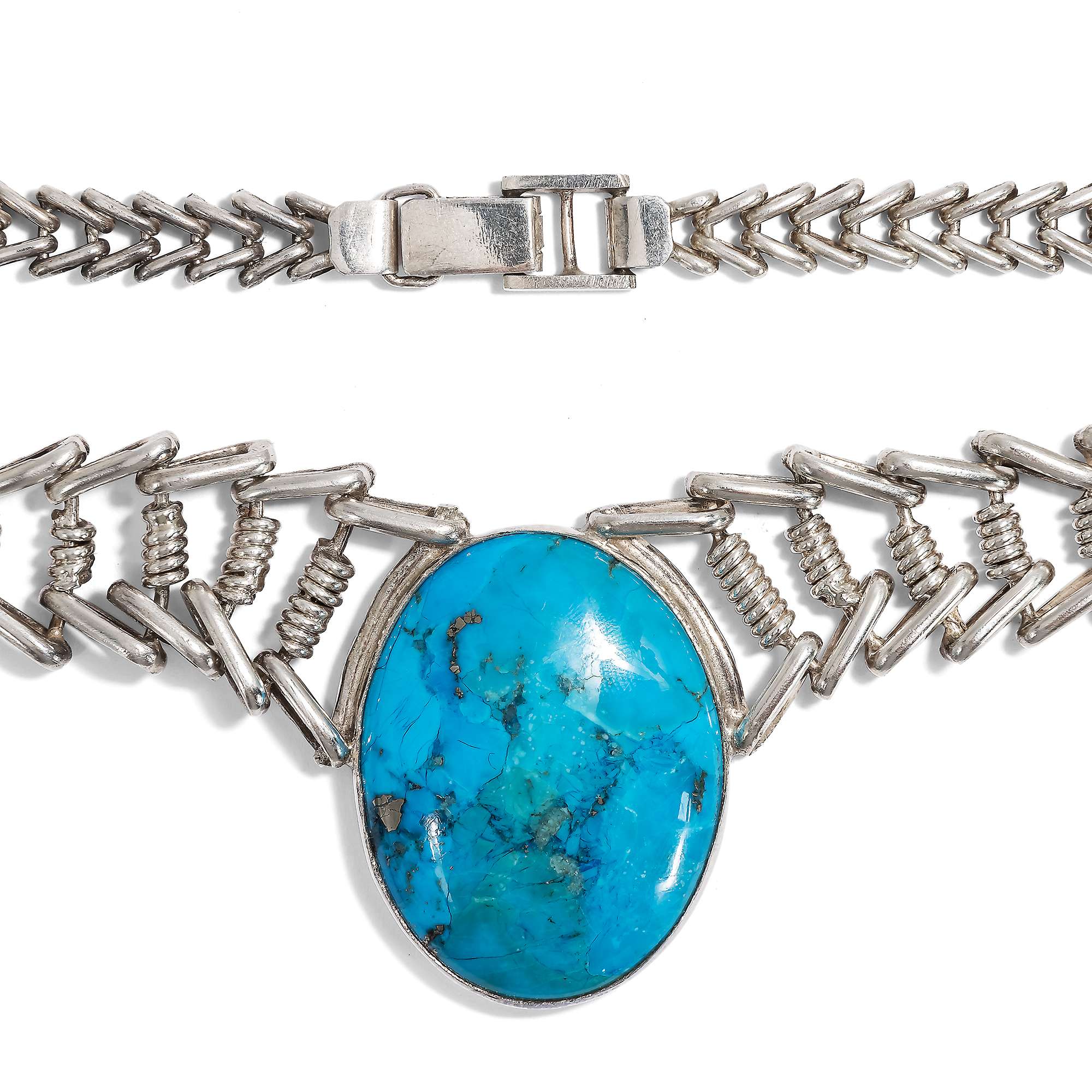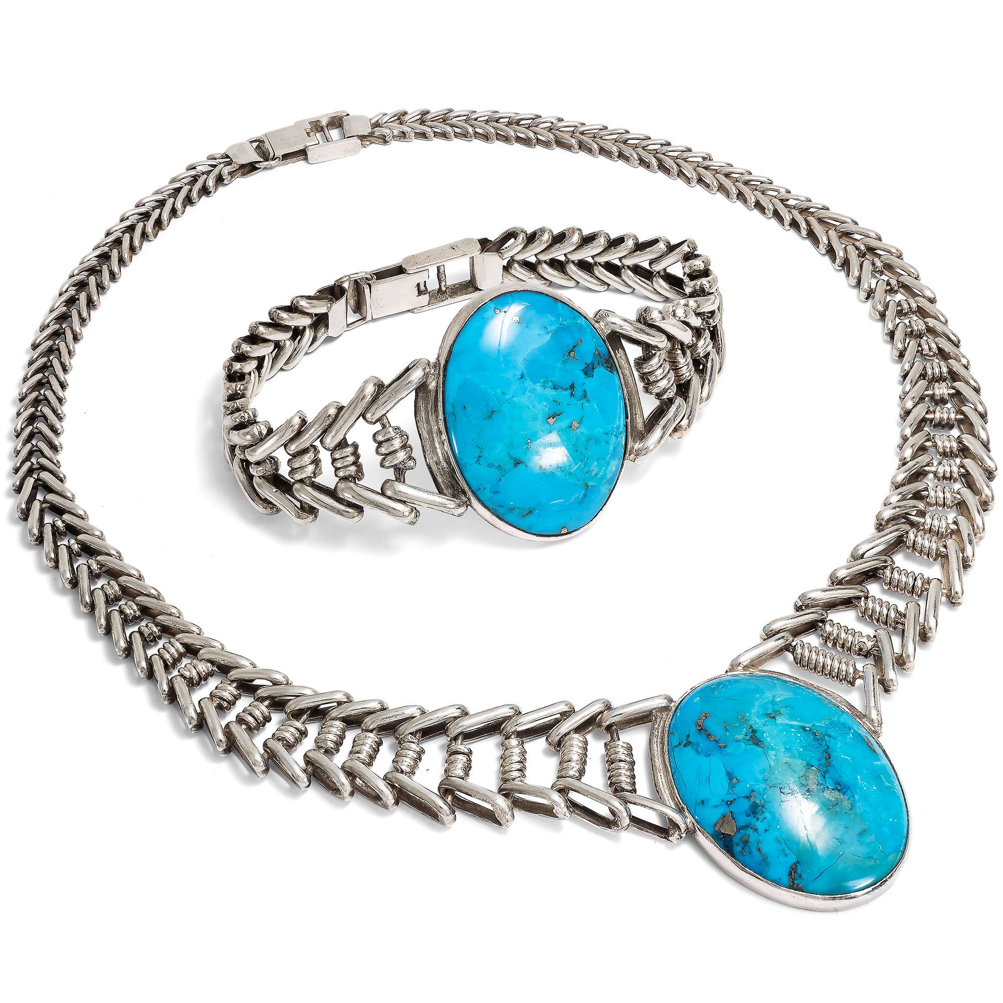 Im hier vorliegenden Schmuckset sind zwei besonders große amerikanische Türkise eingesetzt. Armband und Collier aus Sterlingsilber wurden von ihrer Vorbesitzerin in den 1980er Jahren in Arizona gekauft. Die zwei zu großen ovalen Cabochons geschliffenen Türkise sind dabei in verbödete Zargen gesetzt. Sie werden gehalten von fischgrätenartig entworfenen, weich fließenden Ketten aus Silber. Stabile Schließen halten sie sicher.