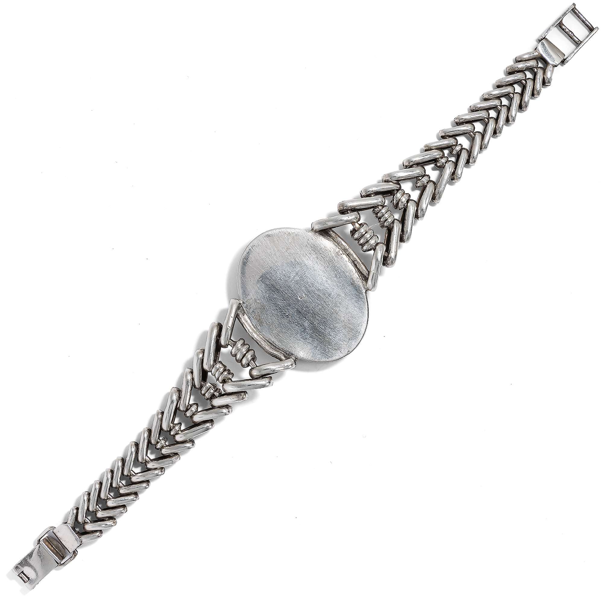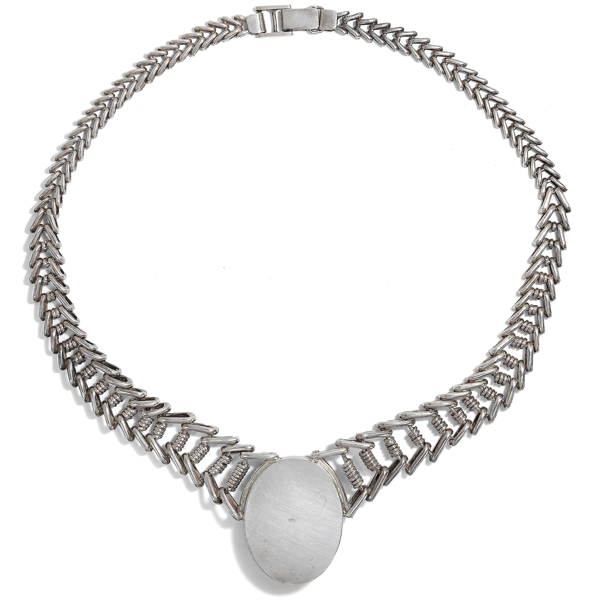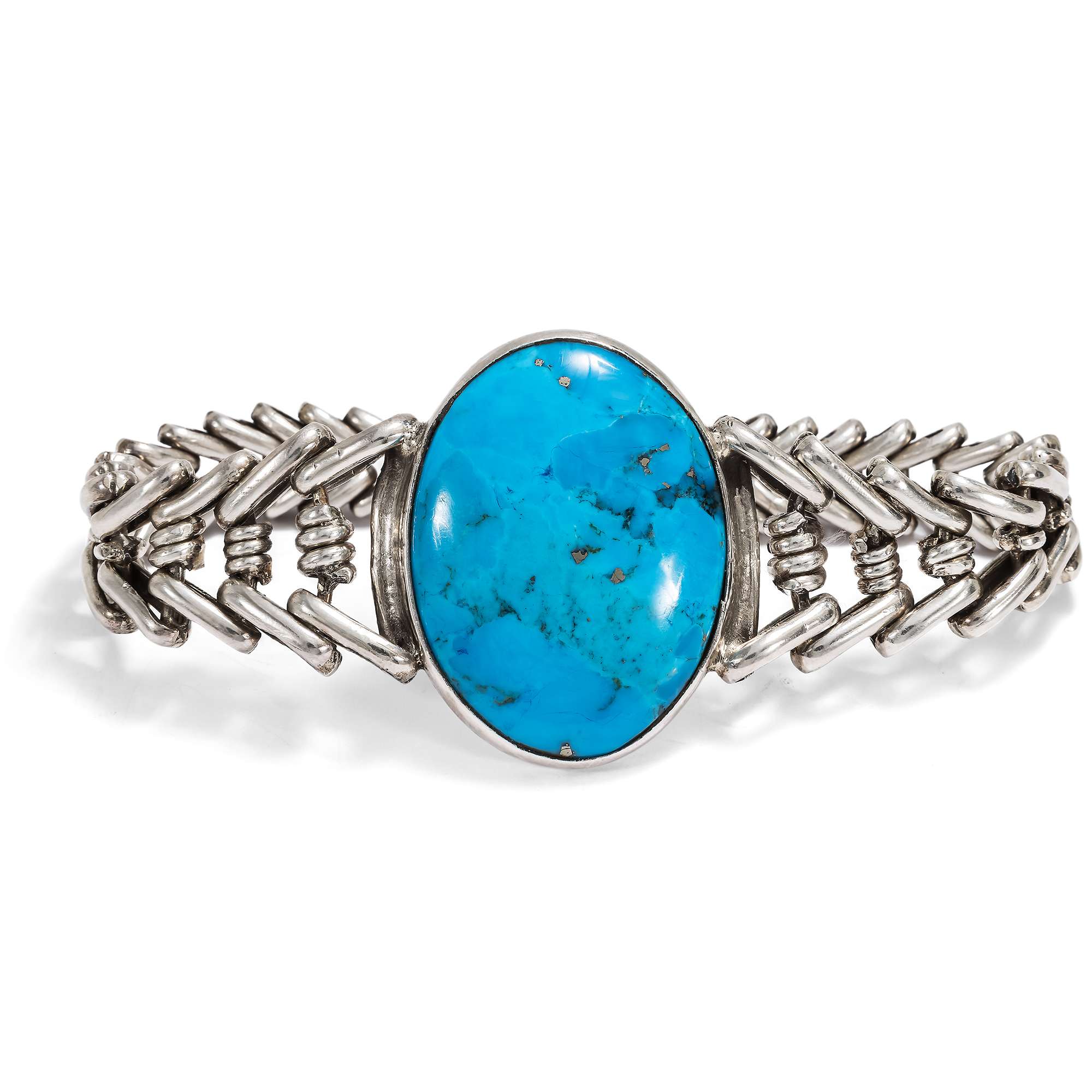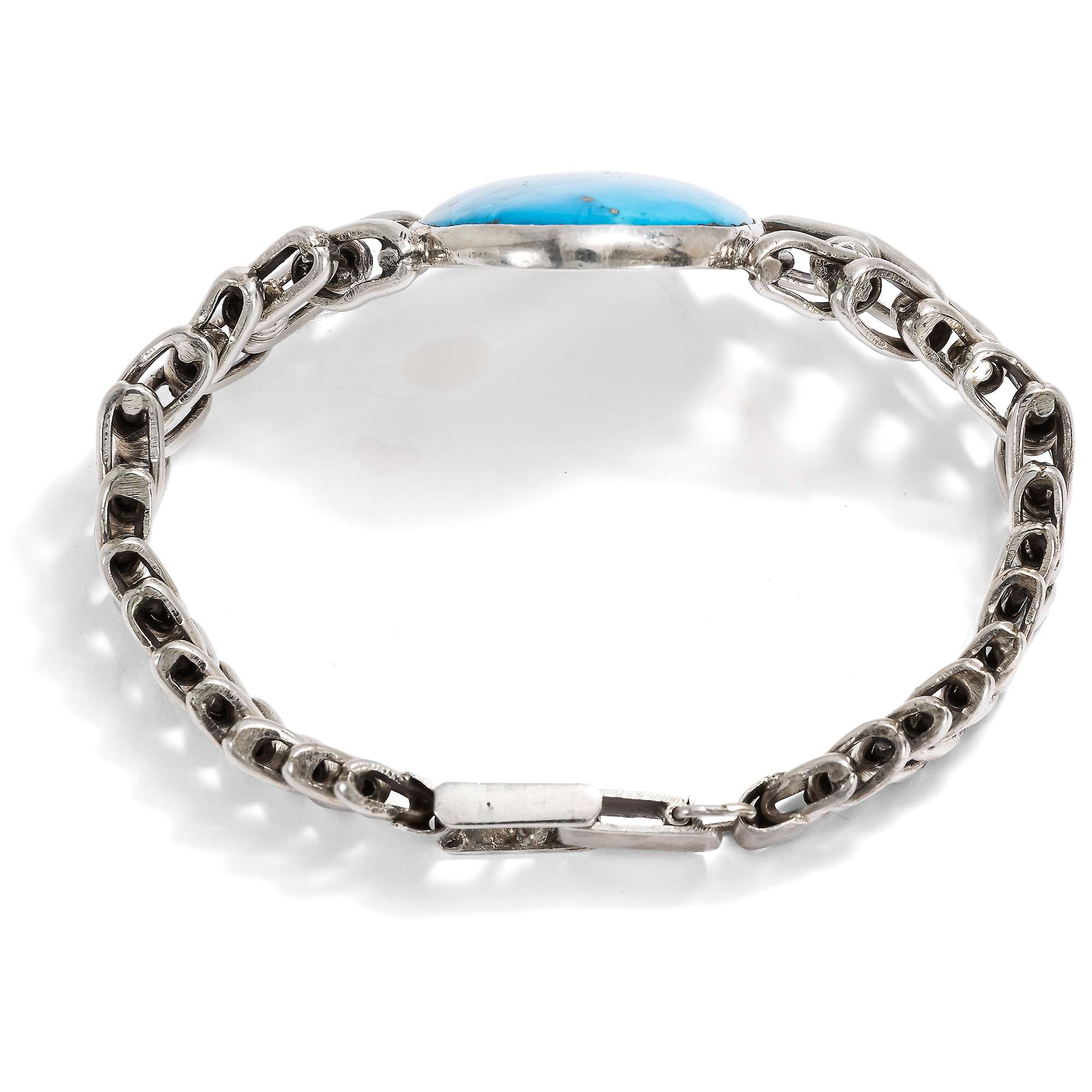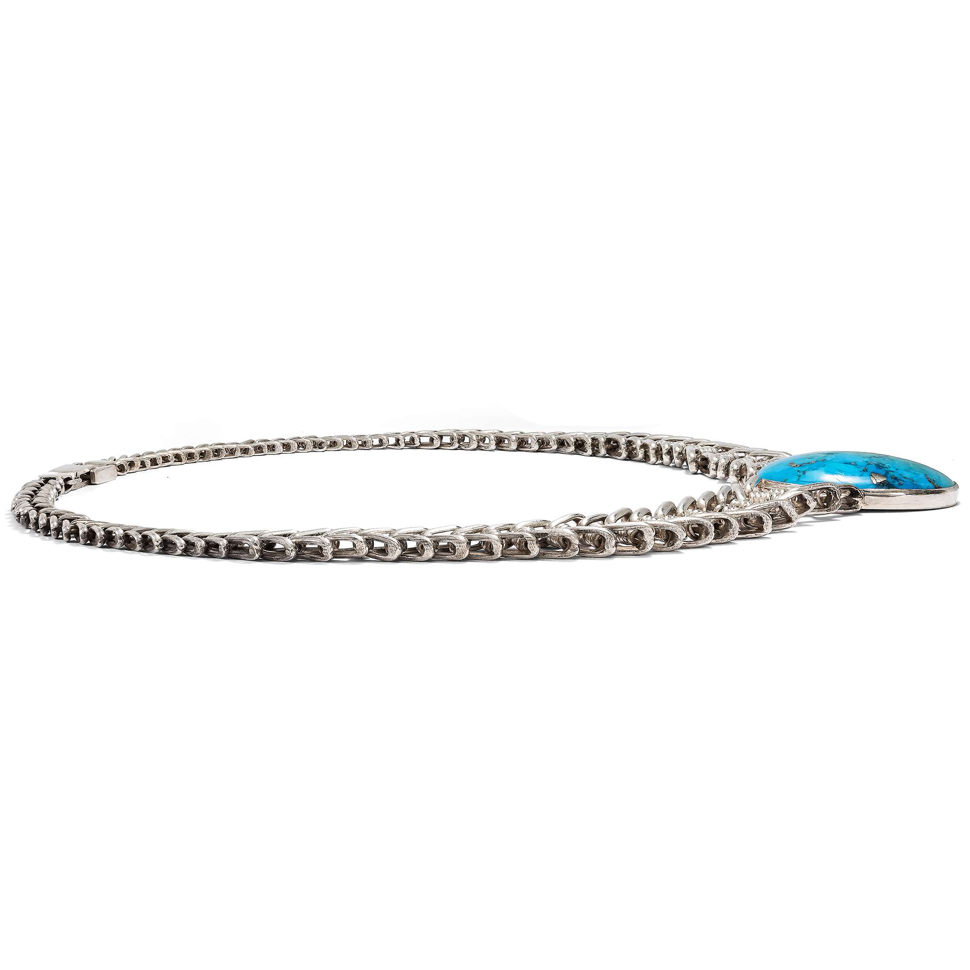 Im hier vorliegenden Schmuckset sind zwei besonders große amerikanische Türkise eingesetzt. Armband und Collier aus Sterlingsilber wurden von ihrer Vorbesitzerin in den 1980er Jahren in Arizona gekauft. Die zwei zu großen ovalen Cabochons geschliffenen Türkise sind dabei in verbödete Zargen gesetzt. Sie werden gehalten von fischgrätenartig entworfenen, weich fließenden Ketten aus Silber. Stabile Schließen halten sie sicher.