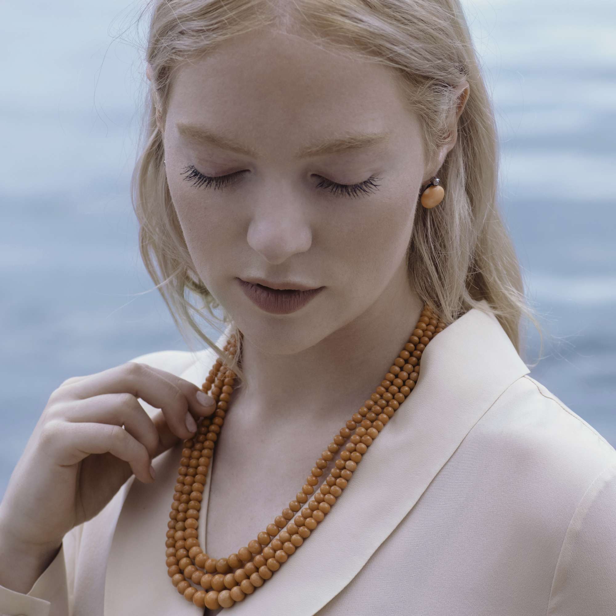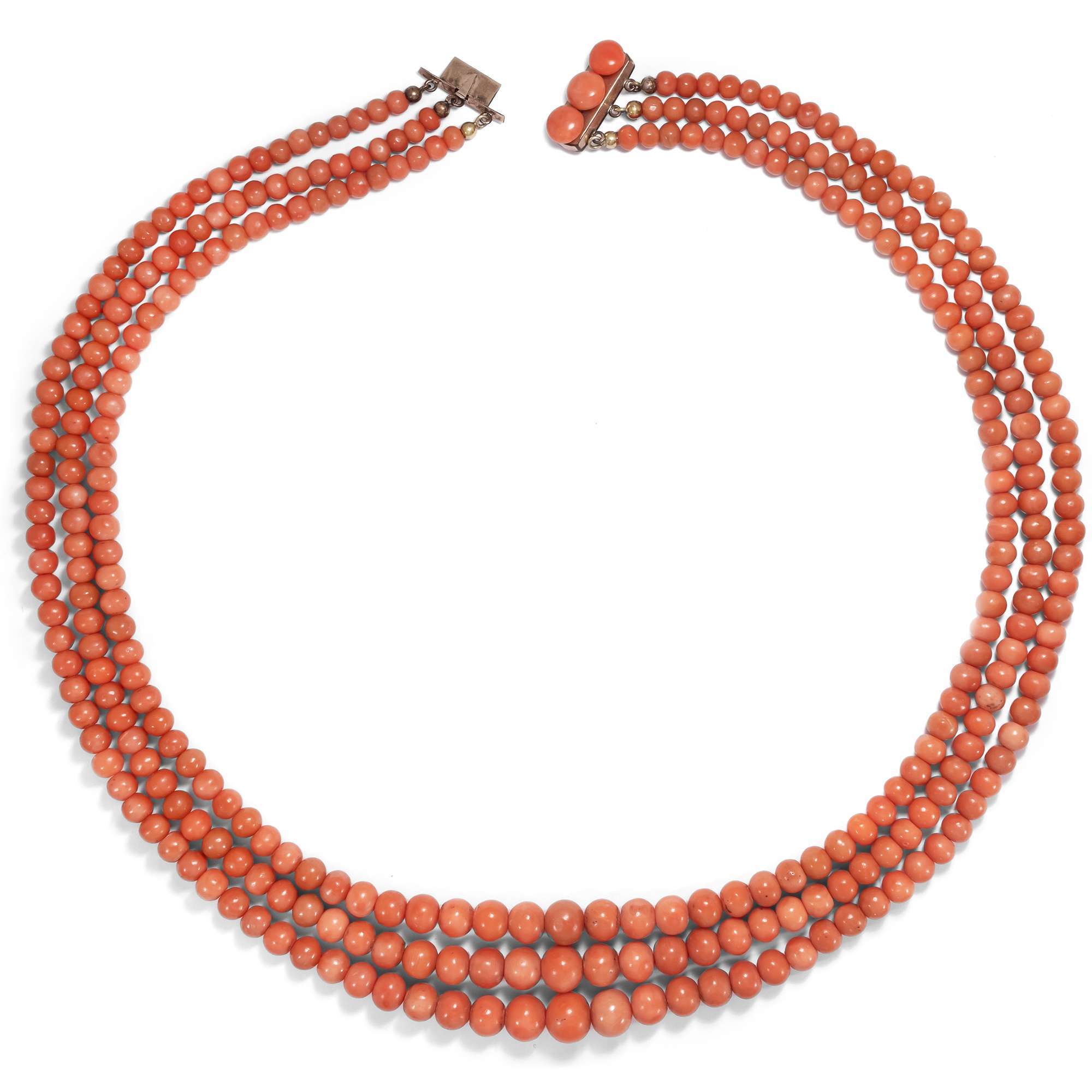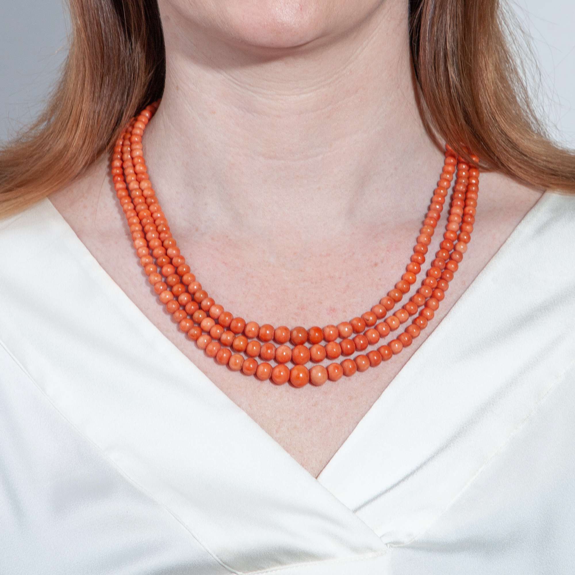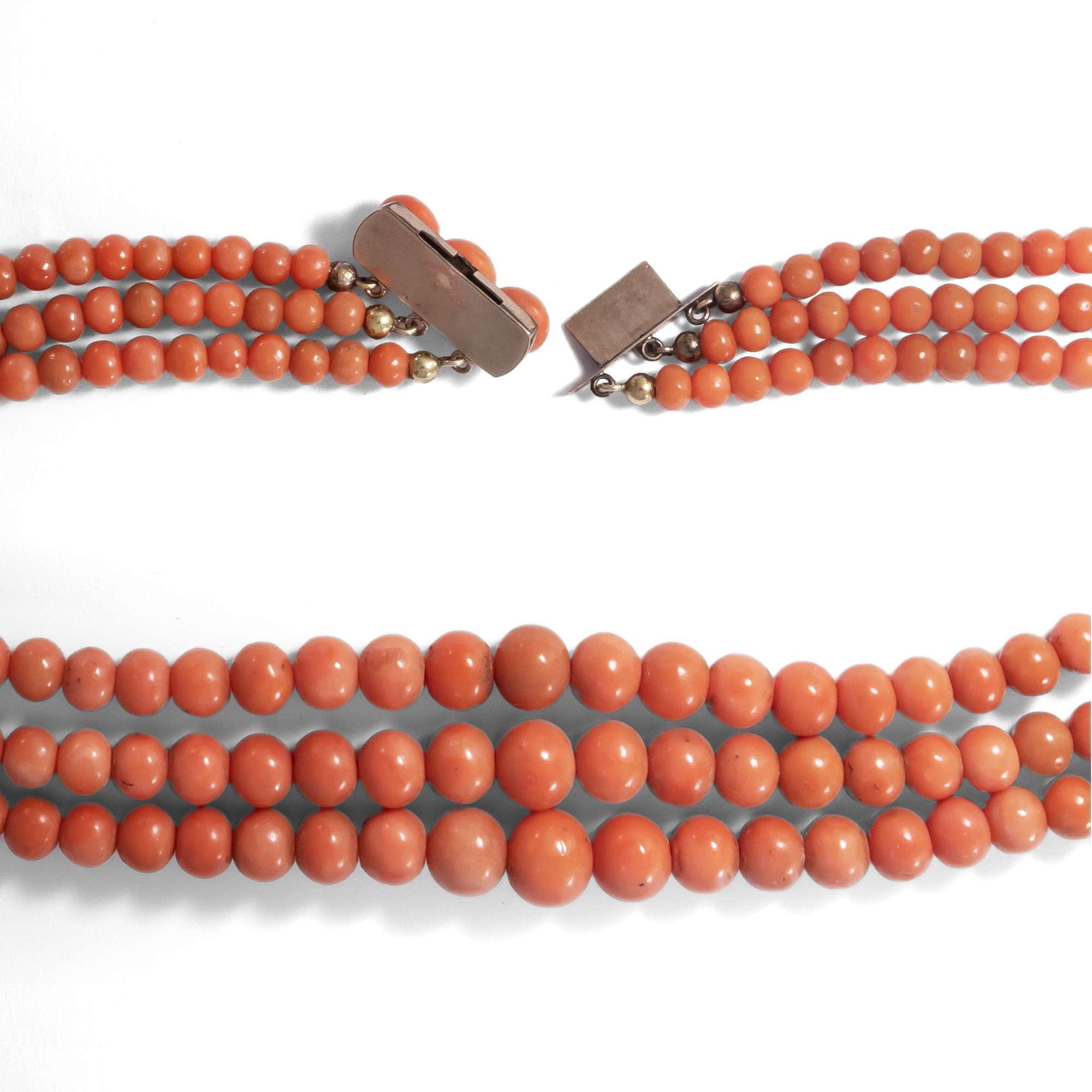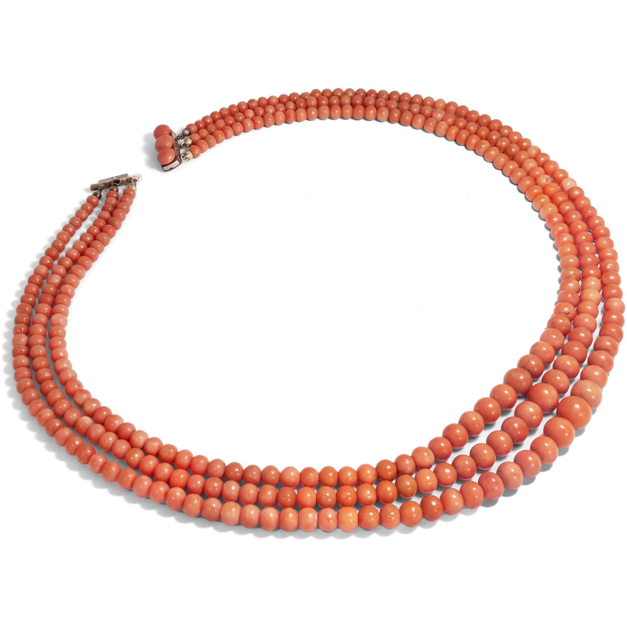 Ein schönes Lachsrosa macht das vorliegende Collier aus italienischer Mittelmeerkoralle zu einem wunderbaren Blickfang. Die großen, handgeschliffenen Perlen mit einem Durchmesser von bis zu einem Zentimeter sind zu drei Strängen arrangiert, die zur Mitte hin an Volumen zunehmen.