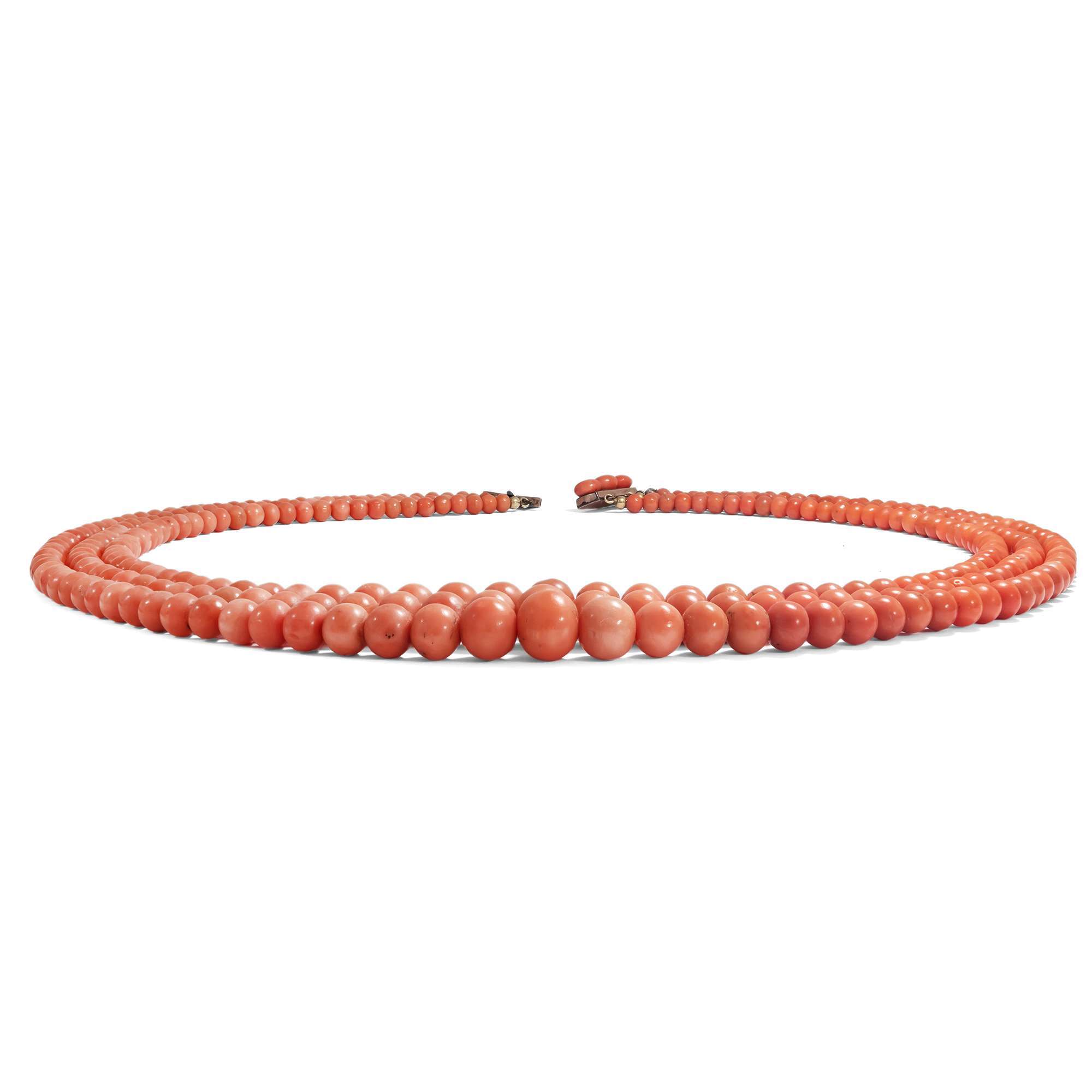 Das hier vorliegende Collier wurde um 1890 gefertigt. Wir haben es neu aufziehen lassen. Es ist ein typisches Beispiel für den Korallenschmuck aus Italien, wie er sowohl von Reisenden als auch von Einheimischen gerne getragen wurde.