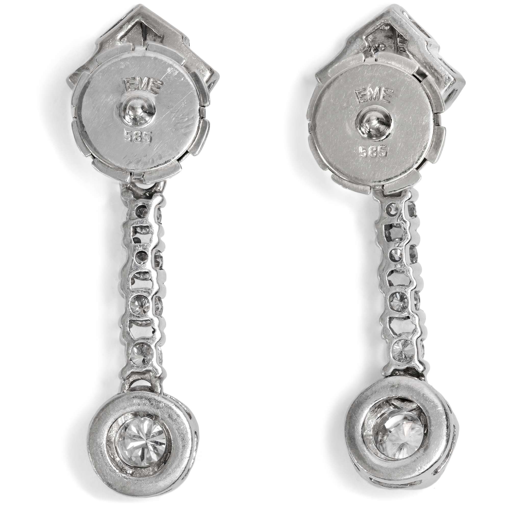 | Stempelungen: | Feingehaltsstempel „585“ und Herstellermarken mit Dreiecken auf den Steckern, Feingehaltsstempel „585“ und Herstellermarke „EME“ auf den Muttern |