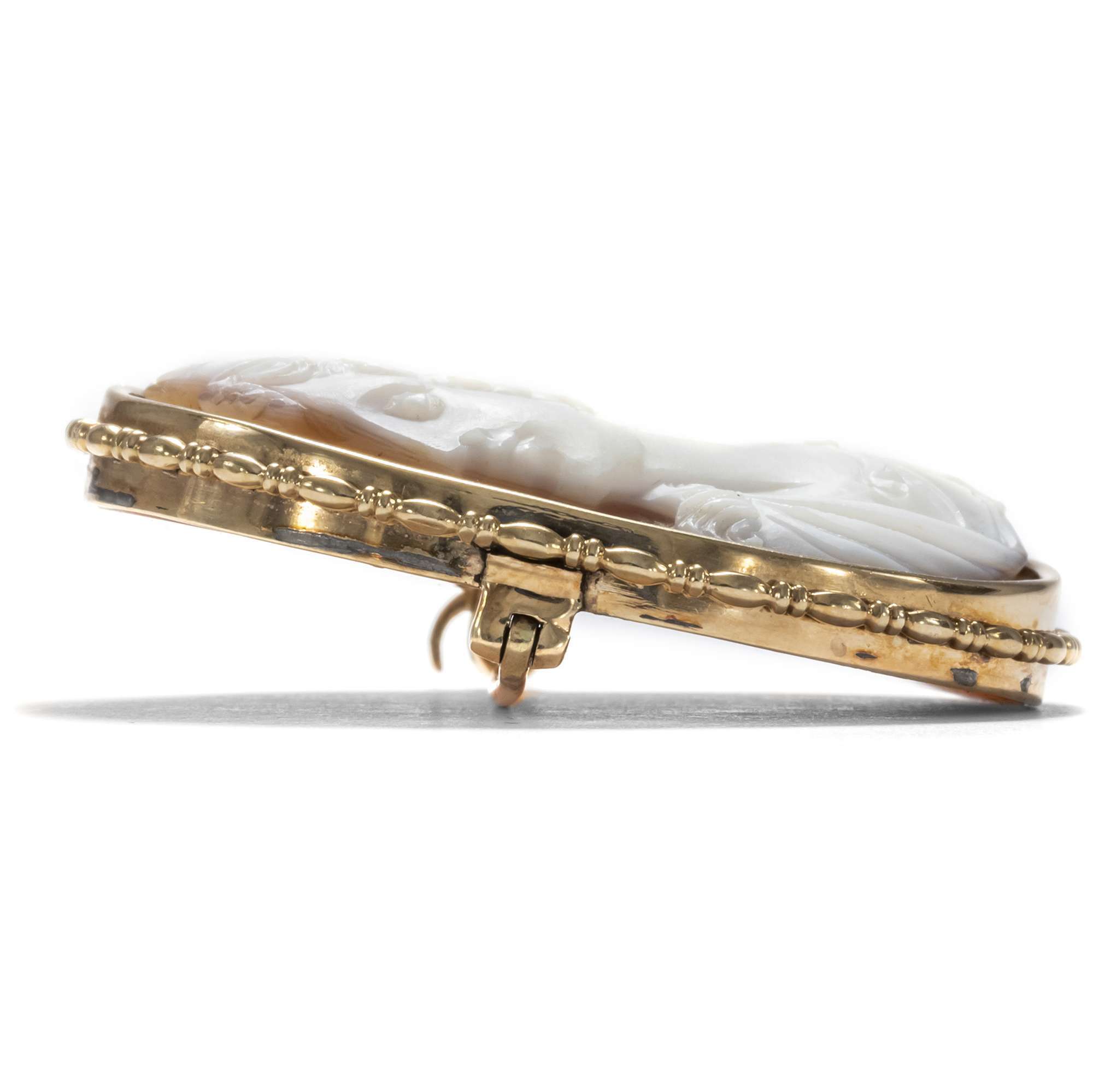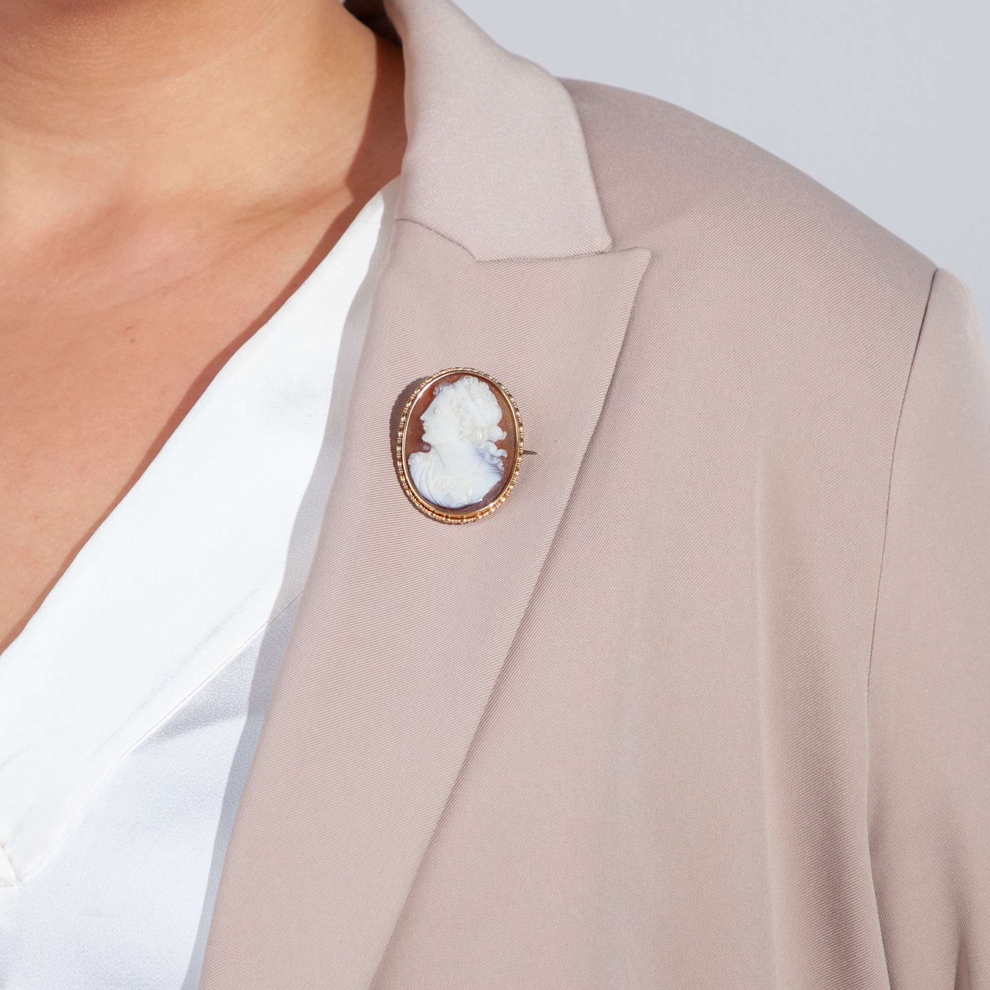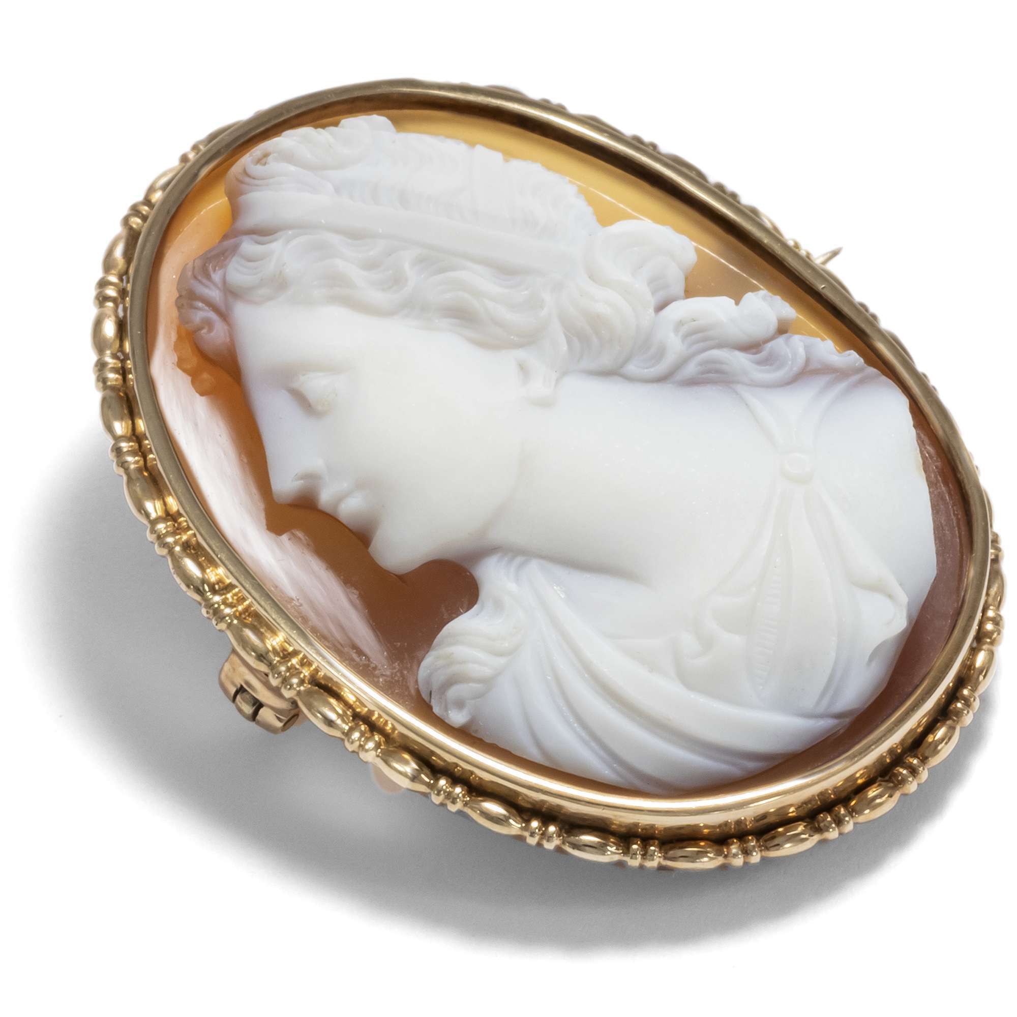 Die hier vorliegende, qualitätvolle Kamee wurde in den ersten Jahren des 20. Jahrhunderts vermutlich in Idar-Oberstein geschnitten. Sie wird von einer schlichten Fassung aus Gold gehalten, die von einem umlaufenden Eierstab geschmückt ist. Sie ist sehr gut erhalten.