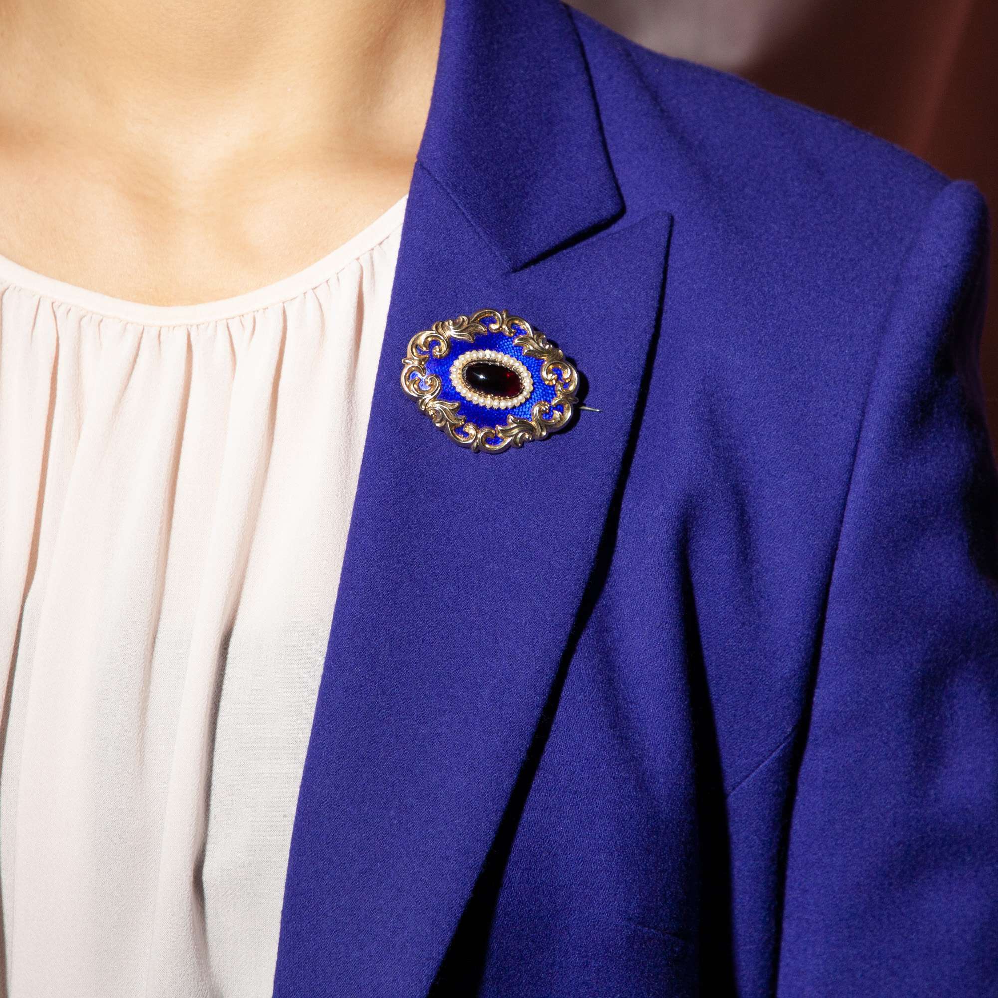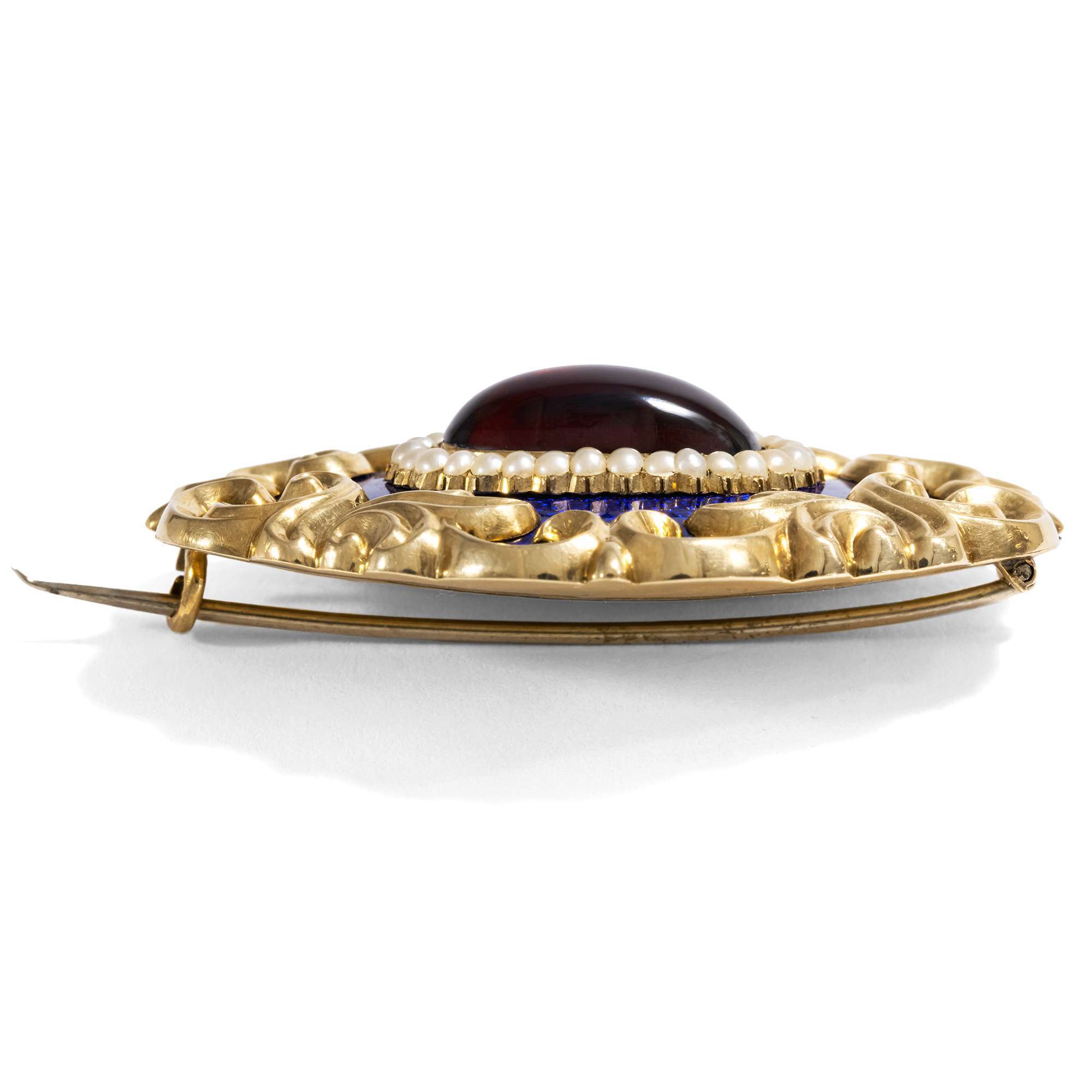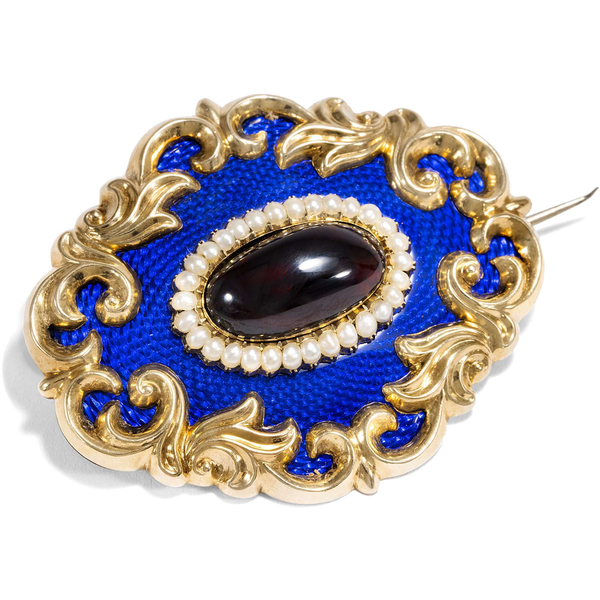 Diese Brosche aus den Jahren um 1840 zeigt, dass diese blaue Mode auch Mitte des 19. Jahrhunderts weiterlebte – nun jedoch mit veränderter Technik! Die Brosche ist vielpassig gestaltet und zeigt symmetrisch angeordnete C-Schwünge im Geschmack des Rokoko sowie stilisiertes Blattwerk aus Gold. Eine Einlage aus blauem Glas wirkt nun wie blaues Email. Sie ist jedoch auf der auf der Unterseite so geriffelt gepresst, dass es wie feines Guilloché-Email wirkt. Dieses Glas wird von den goldenen Blättchen und Ranken umfasst, die es teilweise verdecken und so durchschimmern lassen. Das tiefe Blau erinnert an den Himmel einer Sommernacht, wie er bereits zwei Generationen zuvor in Emailarbeiten eingefangen wurde. Als zentrales Schaustück ist ein Zierelement mit natürlichen Perlen und einem großen Granatcabochon über diesem geheimnisvollen Grund angebracht.