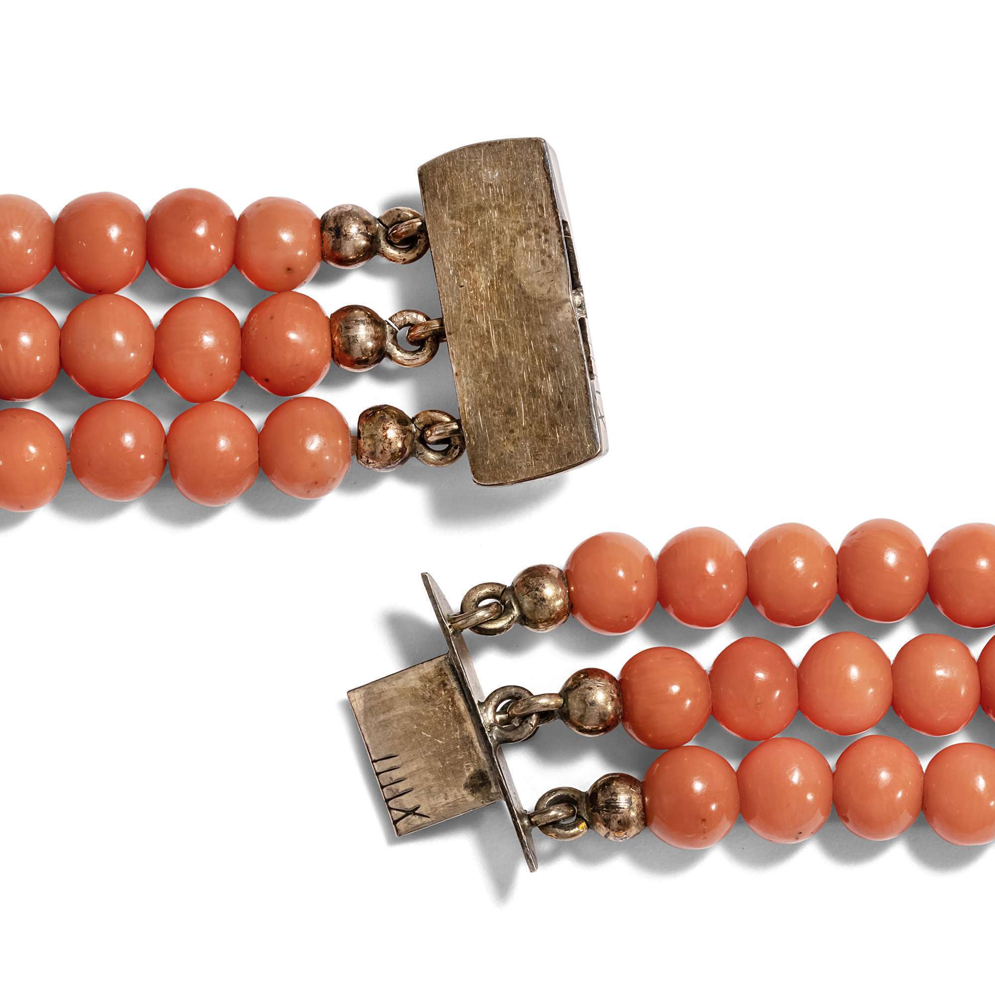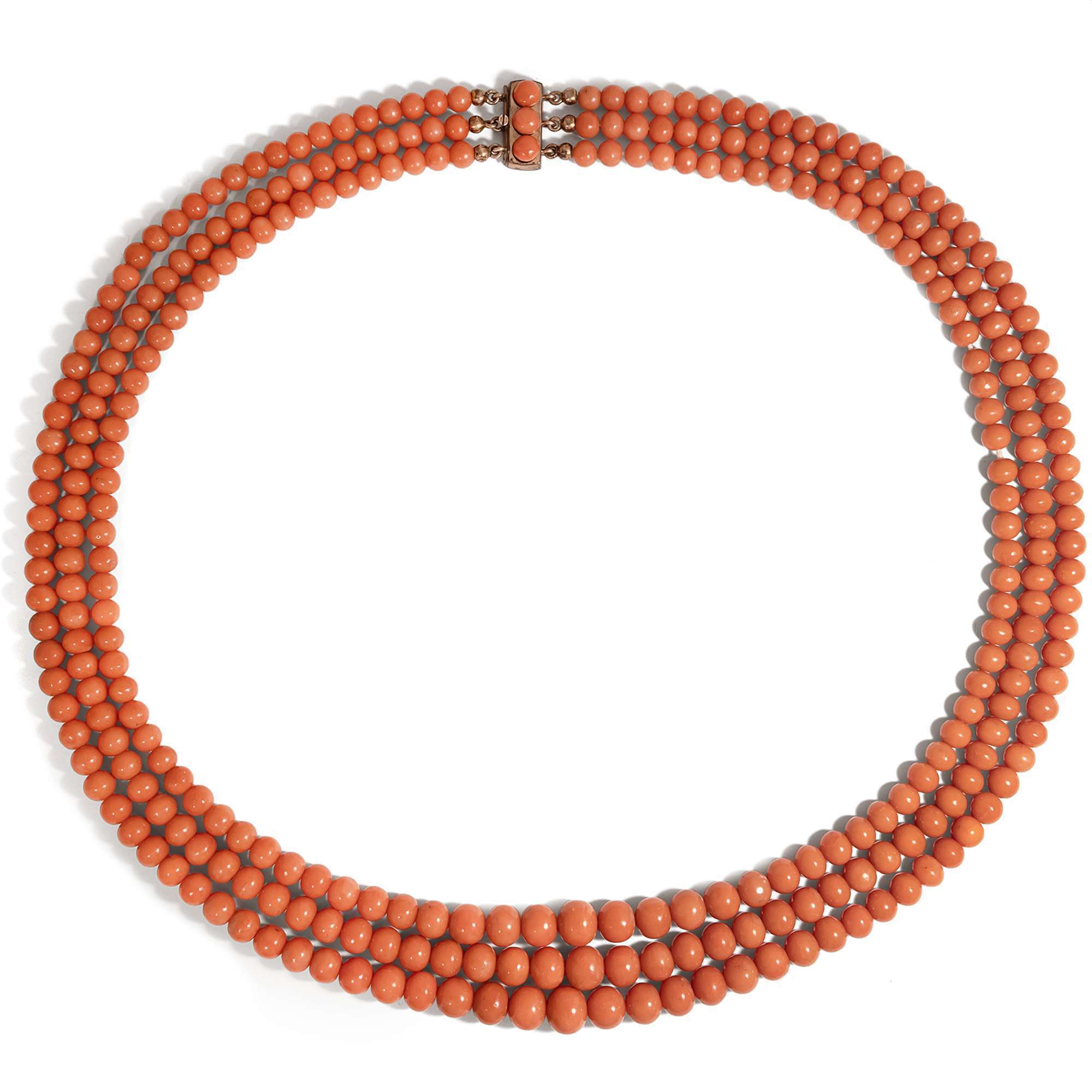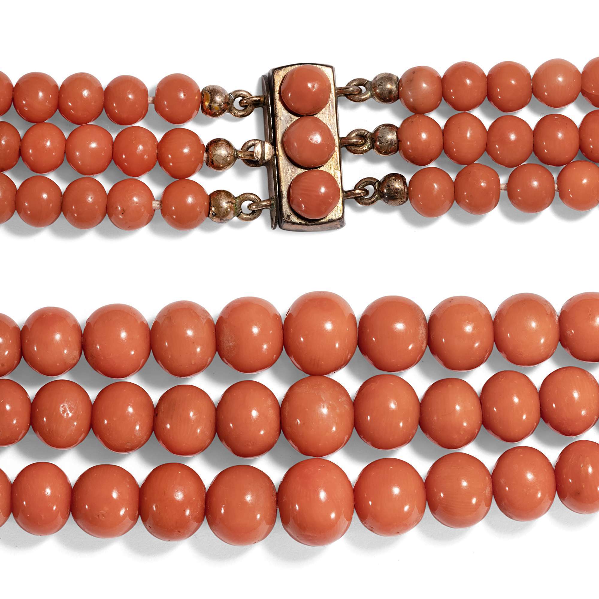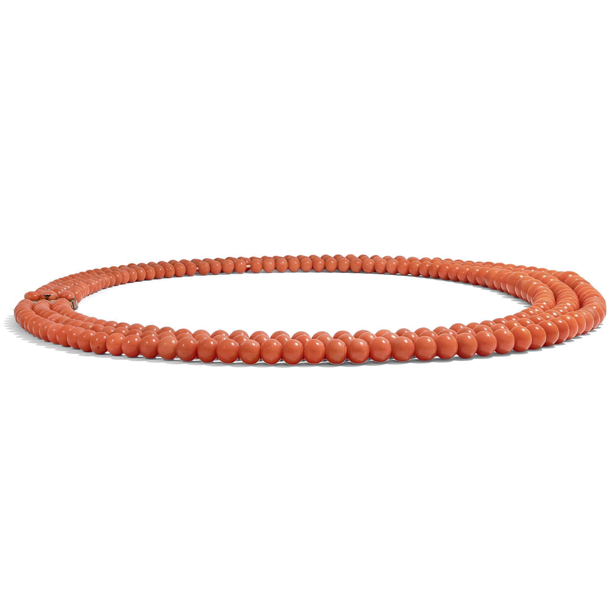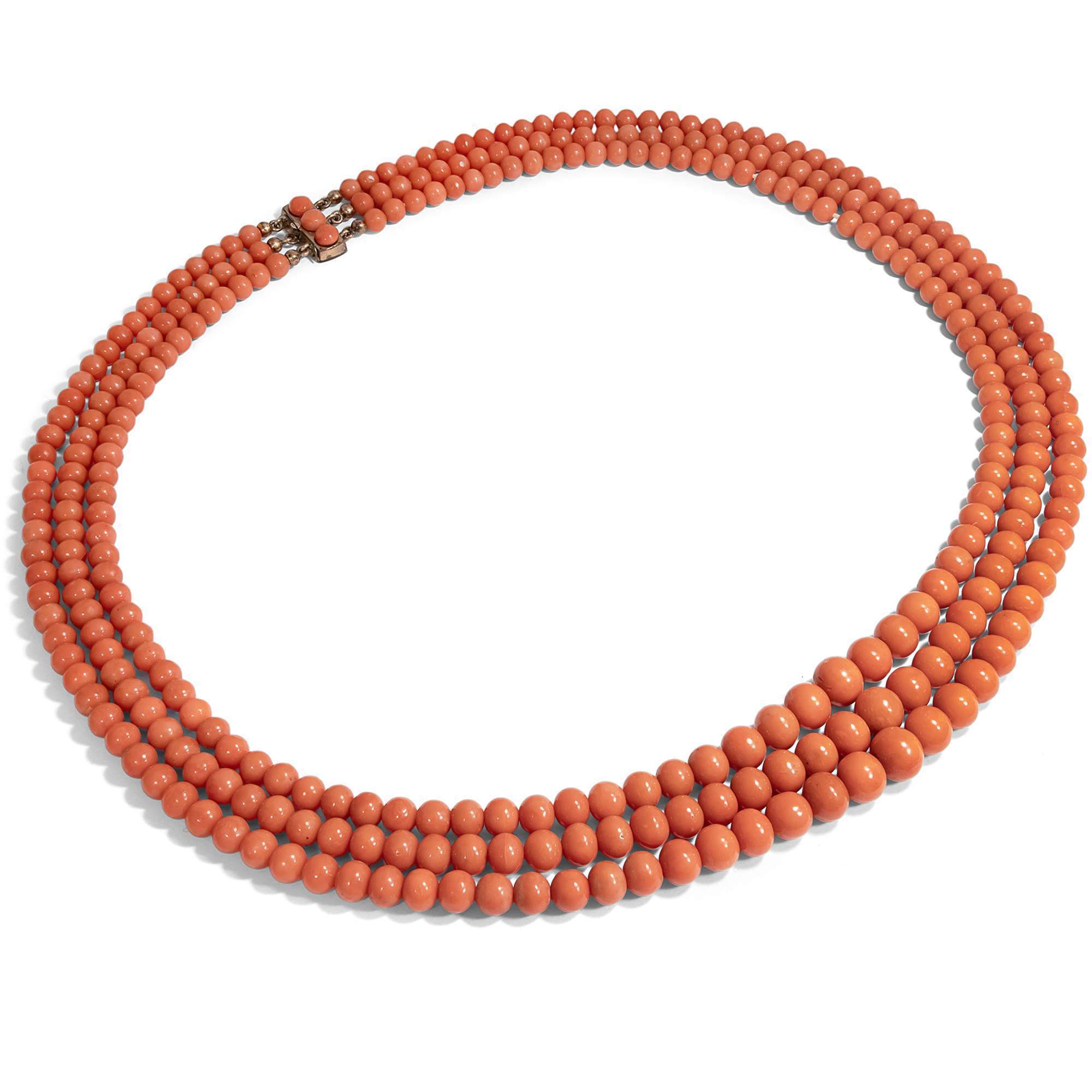 Das hier vorliegende Collier in drei Reihen ist genau ein solches Schmuckstück, wie es die Prinzessinnen von Neustatt-Birkenstein hätten tragen können. Es entstand in den Jahren um 1900 in Italien und präsentiert seine kräftig lachsroten, hochwertigen Korallen im Größenverlauf gereiht. Eine hübsche originale Schließe aus vergoldetem Tombak hält das Collier sicher.