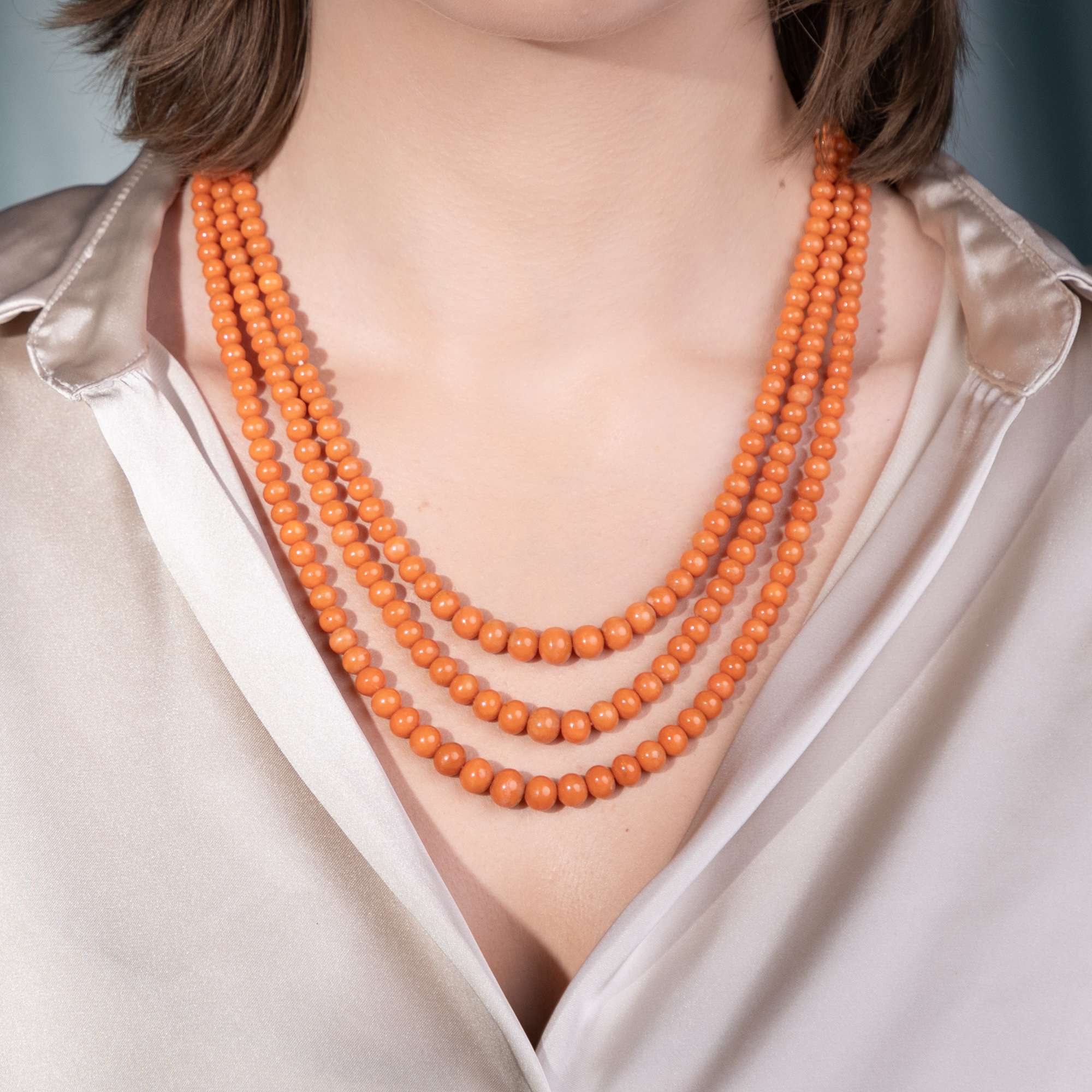 Prachtvolle antike Korallenkette in drei Reihen, Italien um 1900
