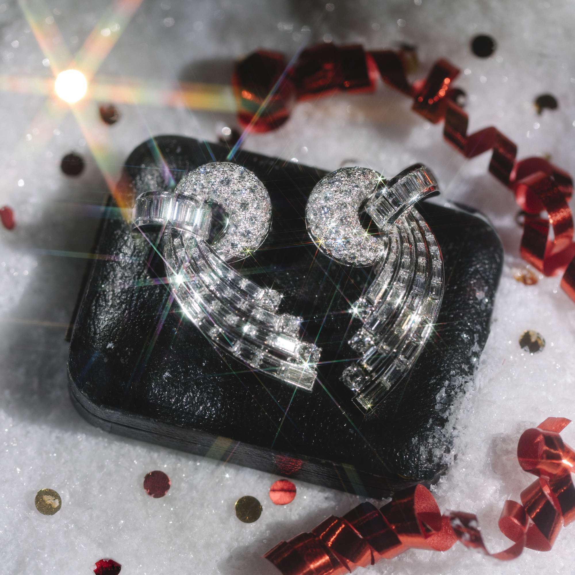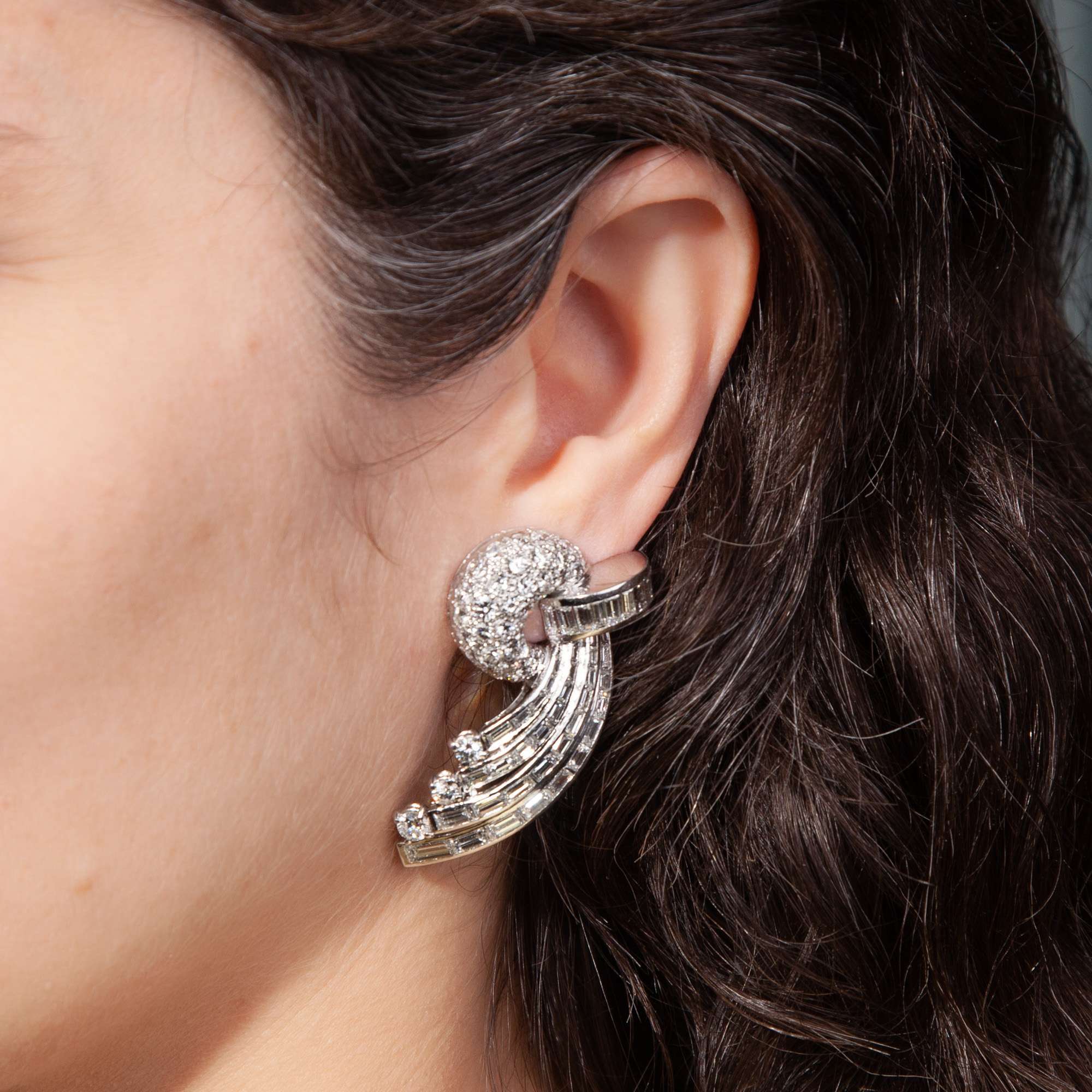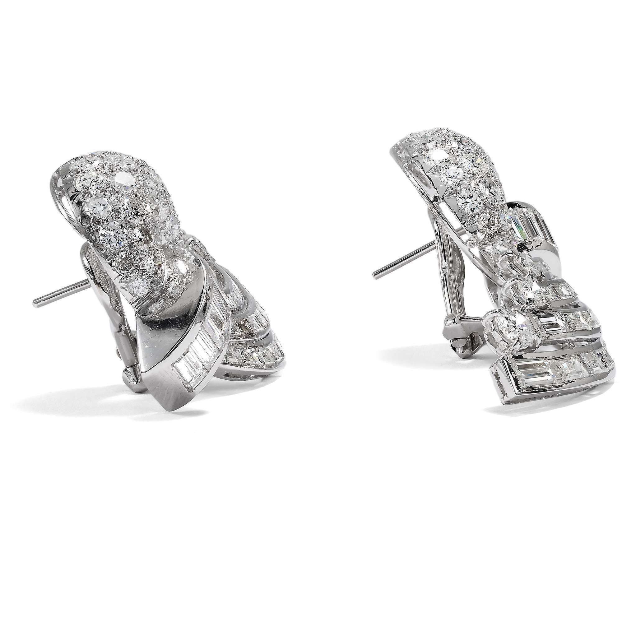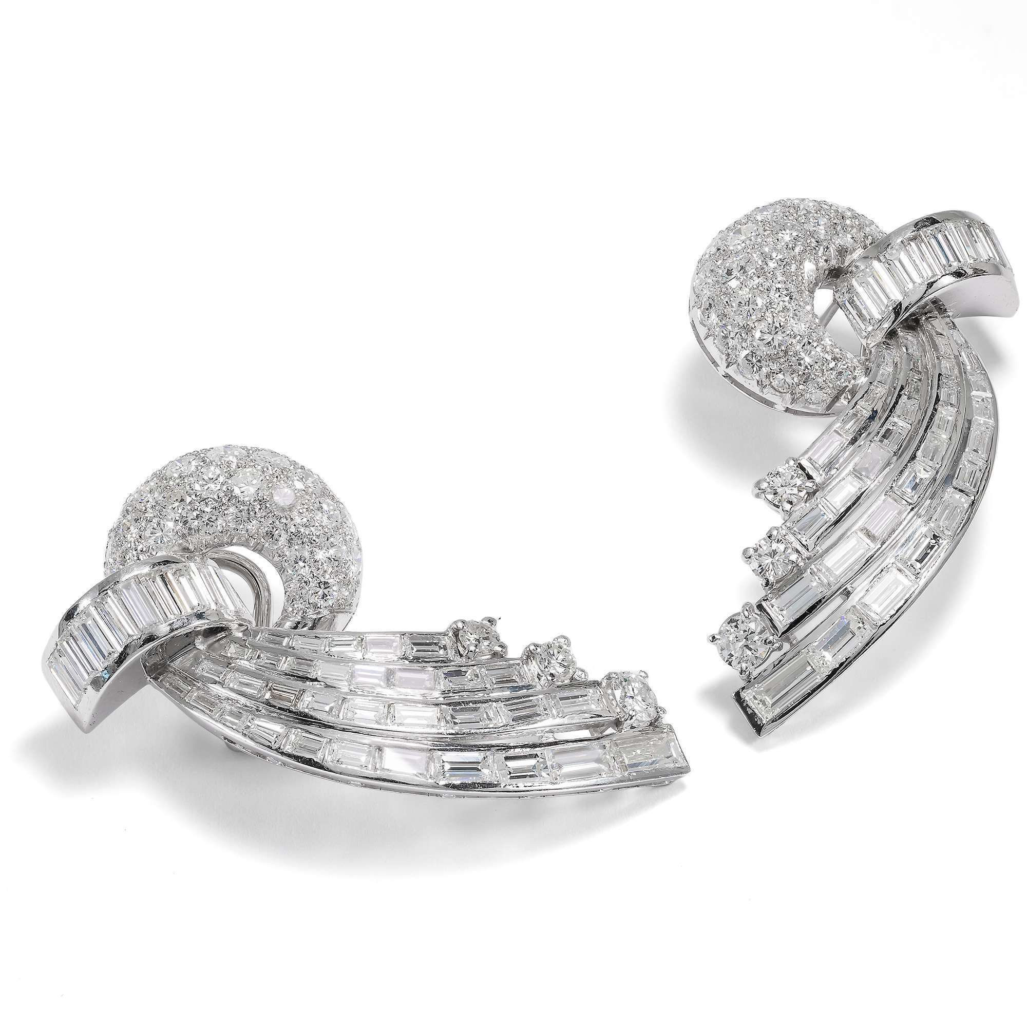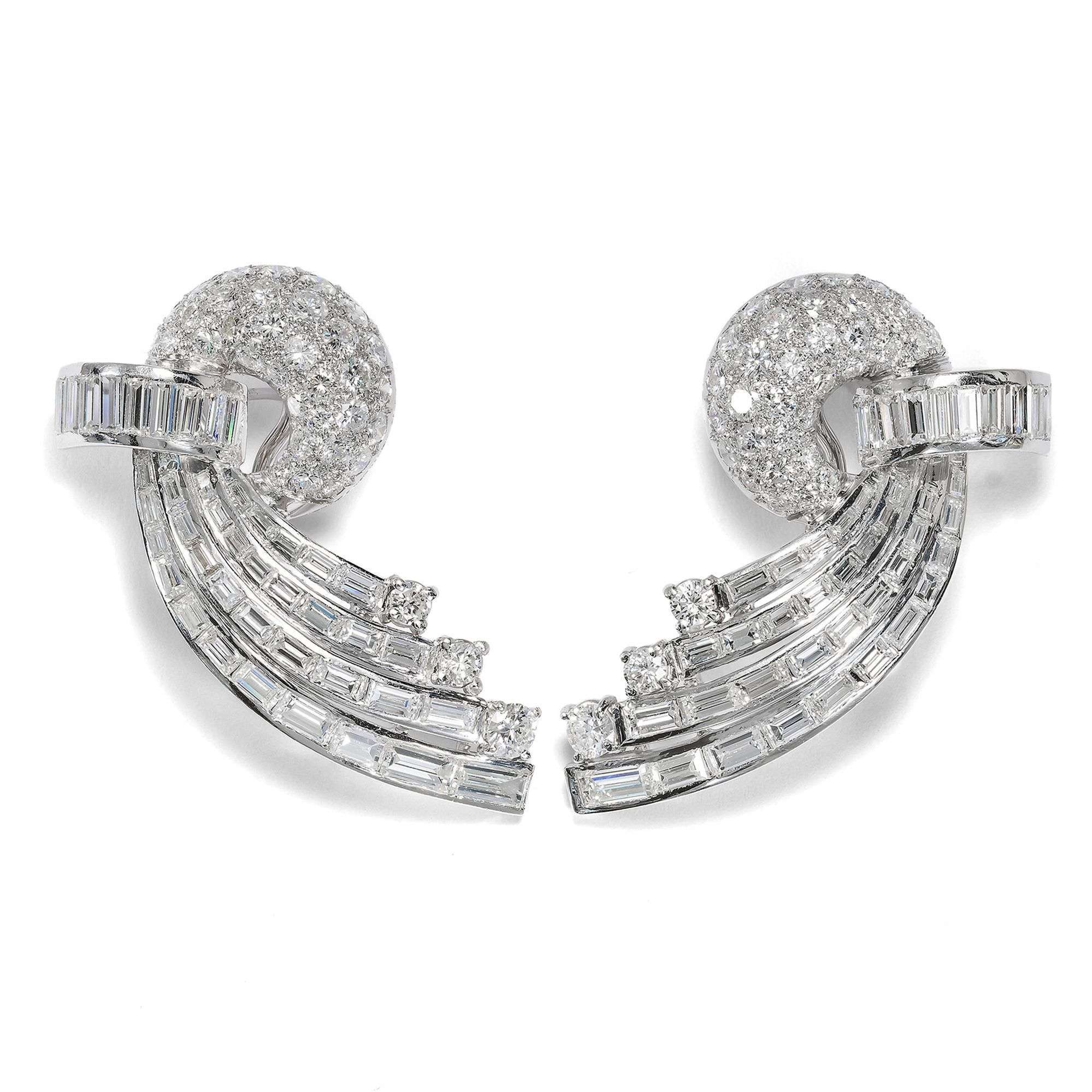 Welche Ohrringe man trug, dies entschied sich nicht nur nach persönlichem Geschmack, sondern auch nach Anlass. Für den Tag war warmes Gelbgold populär. Sie Schmuckmode des Abends bestimmten Diamanten in Fassungen aus Weißgold oder Platin. Auch die vorliegenden Ohrringe waren für Abendveranstaltungen gedacht. Sie sind abstrahiert gestaltet, erinnern an Sternschnuppen. Ein croissantförmiges, gewölbtes Halbrund ist mit Brillanten besetzt, ein Ring aus Baguette-Diamanten trennt sie von den Schweifen der Sternschnuppen, die ebenfalls mit Baguette-Diamanten in feinen Qualitäten besetzt sind.