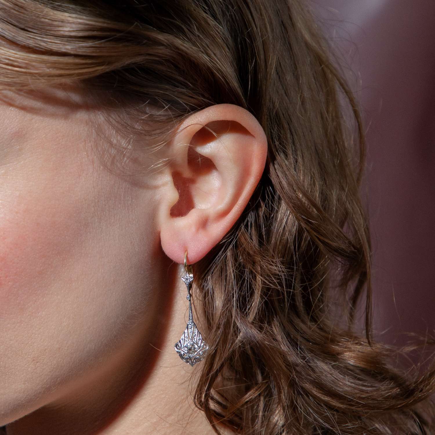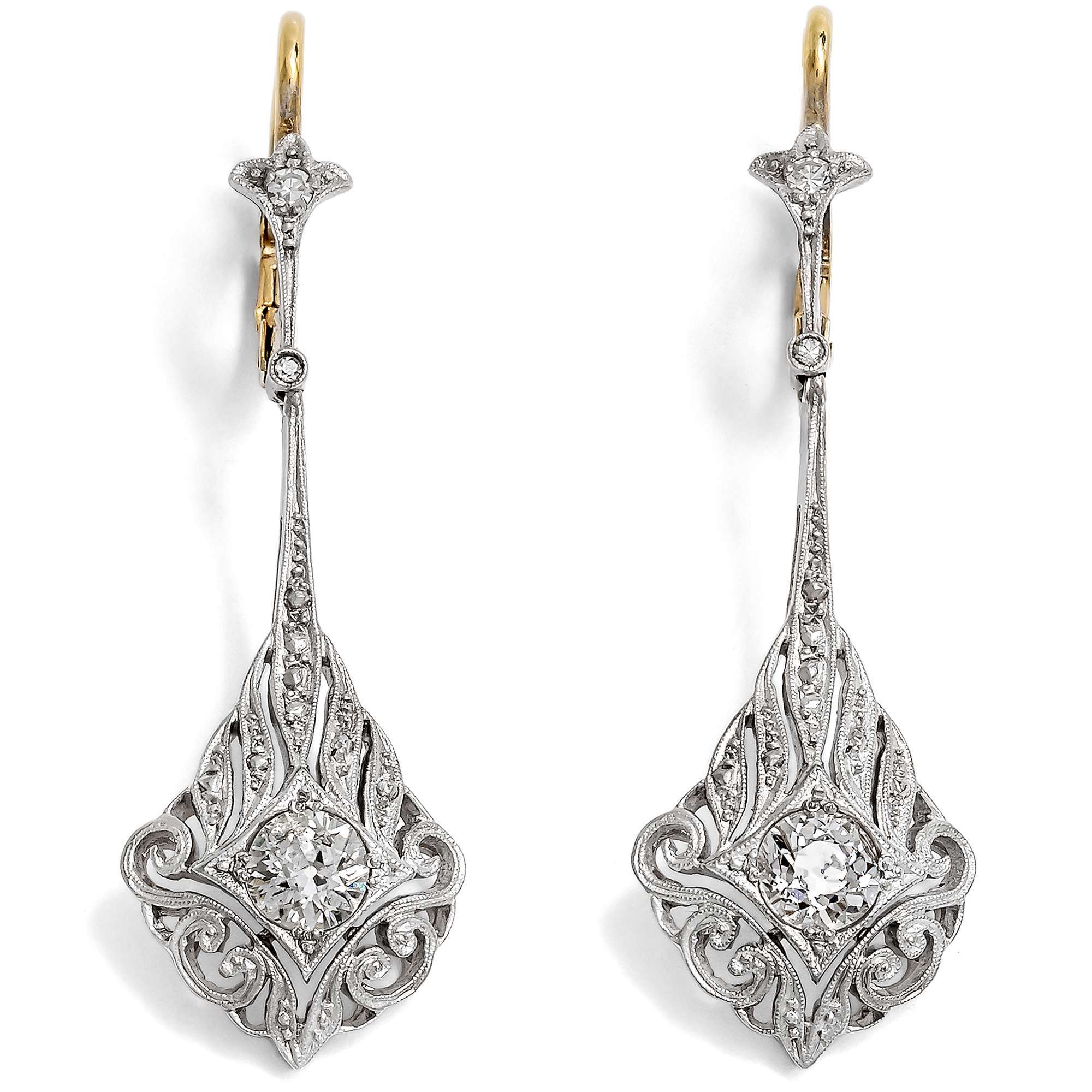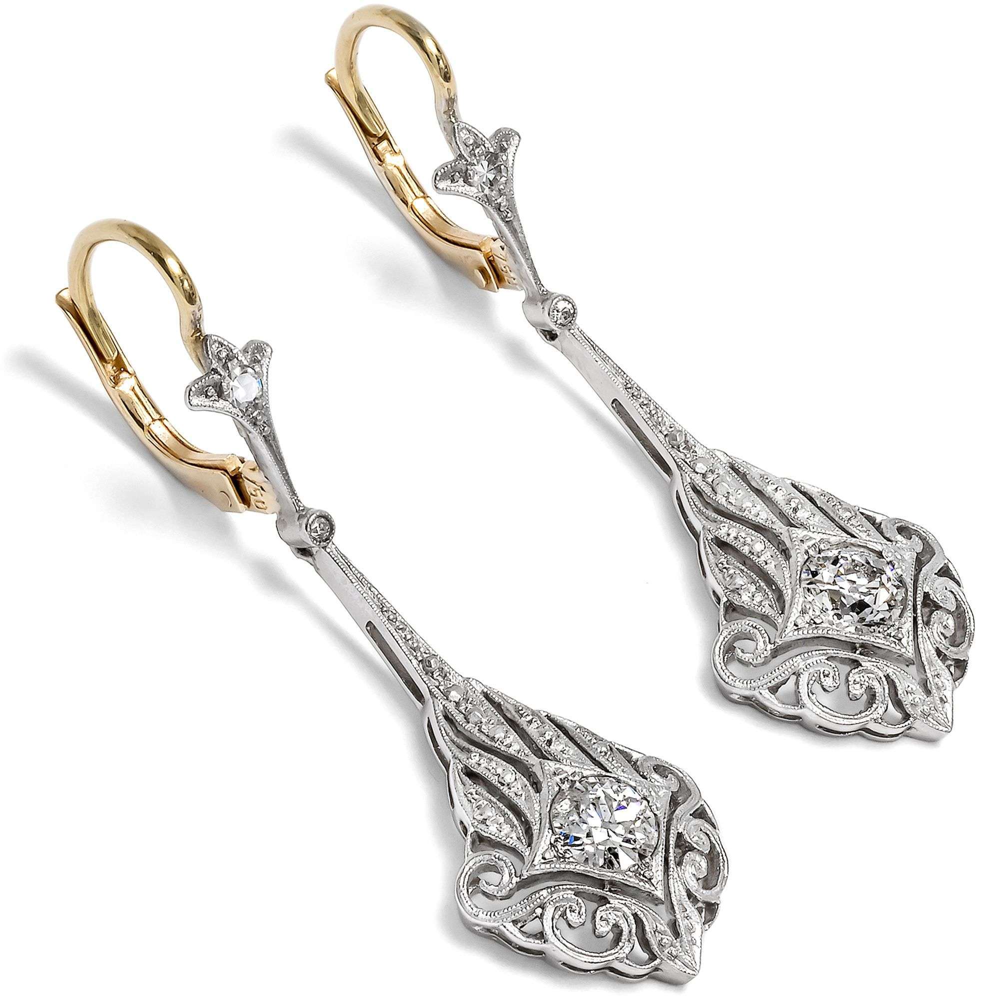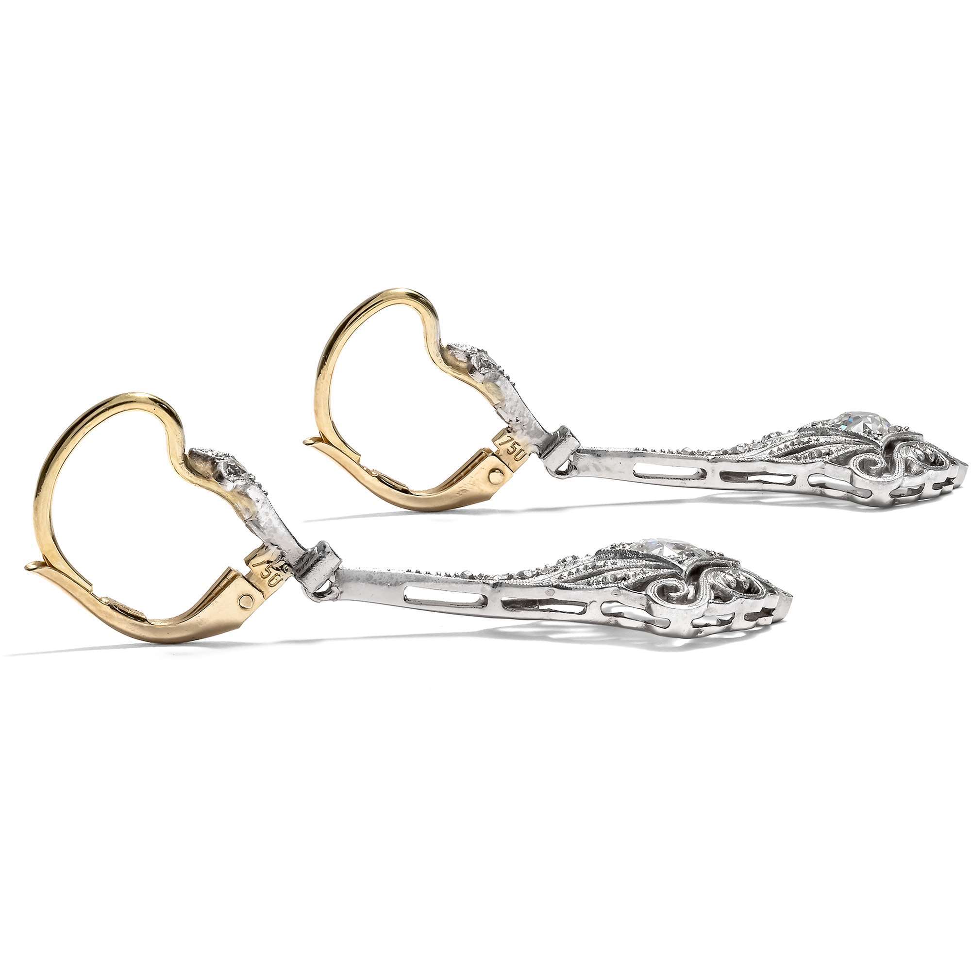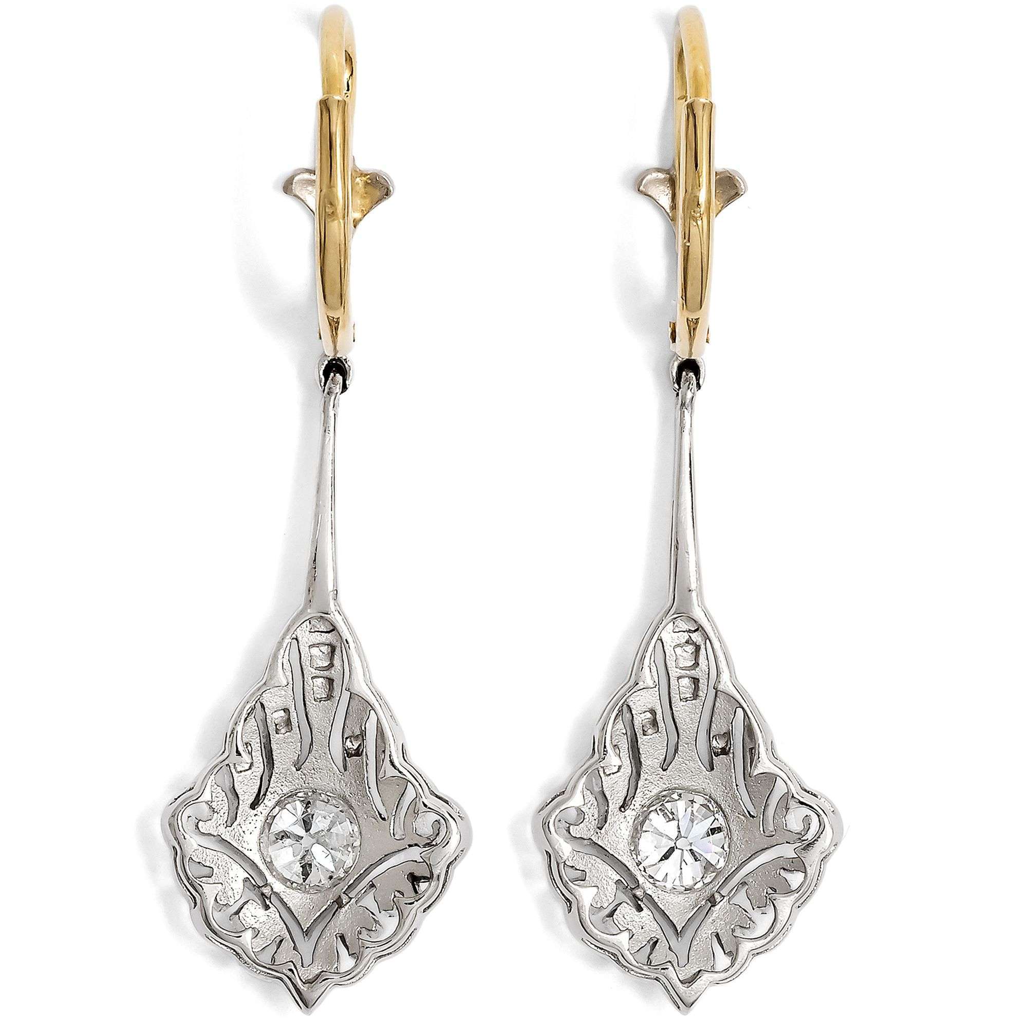 Das hier vorliegende Paar Ohrringe haben wir in unserer Werkstatt fertigen lassen, um zu jedem Zeitpunkt passende Ohrringe zu Ringen und Colliers des Art Déco anbieten zu können. Dabei wurde das Paar mit antiken Diamanten der 1920er Jahre ausgefasst und nach historischen Vorbildern mit feinen Schattenfugen und Millegriffes verziert. Die Pendel sind aus Weißgold gearbeitet, die Ohrbügel und Klappbrisuren aus Gelbgold. Dieses Duett der Metallfarben war zu Beginn des 20. Jahrhunderts eine übliche Kombination.