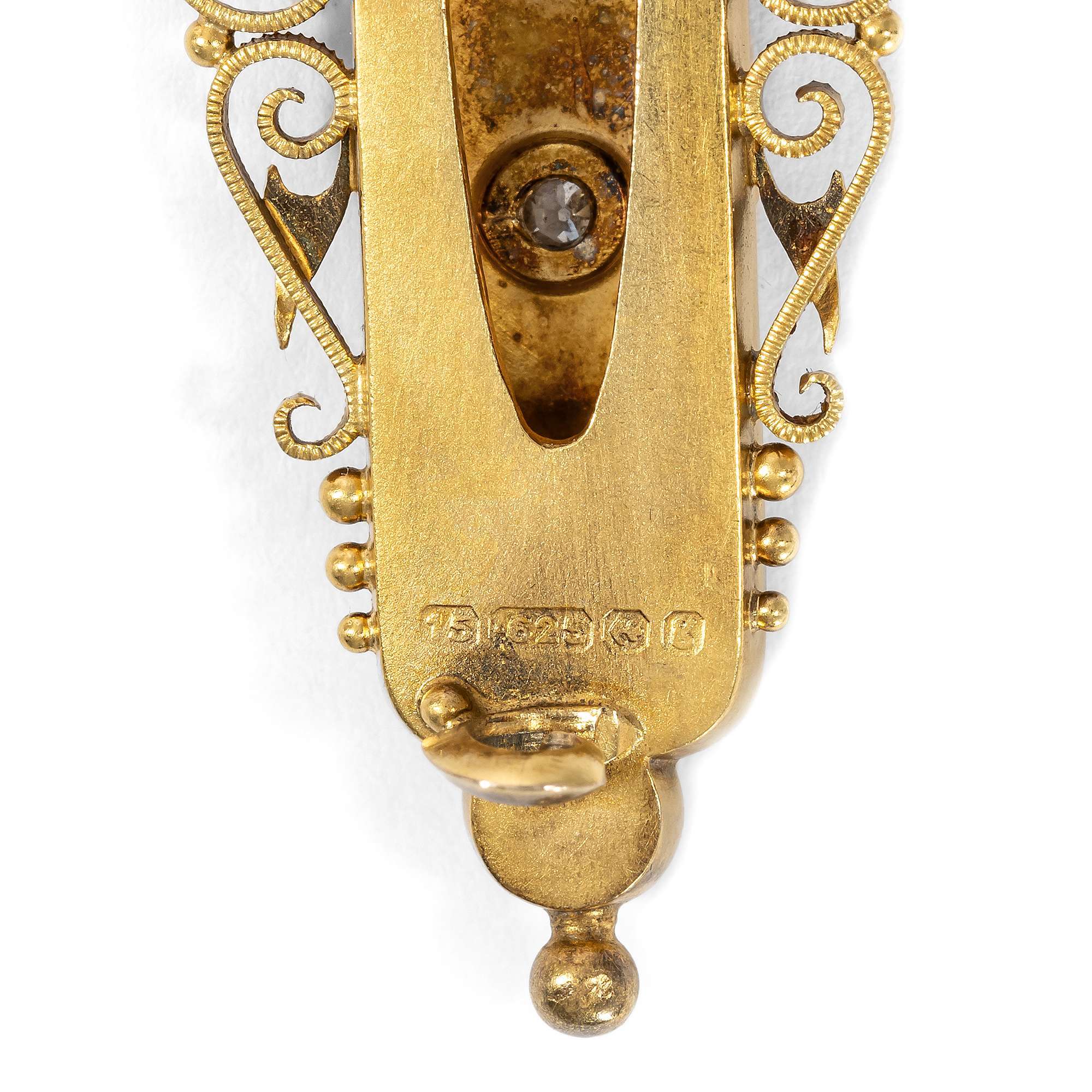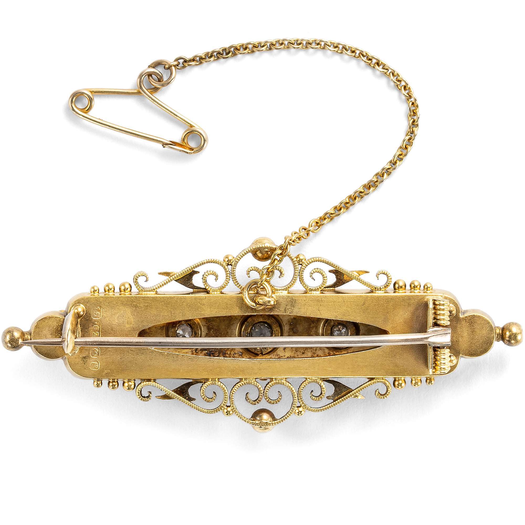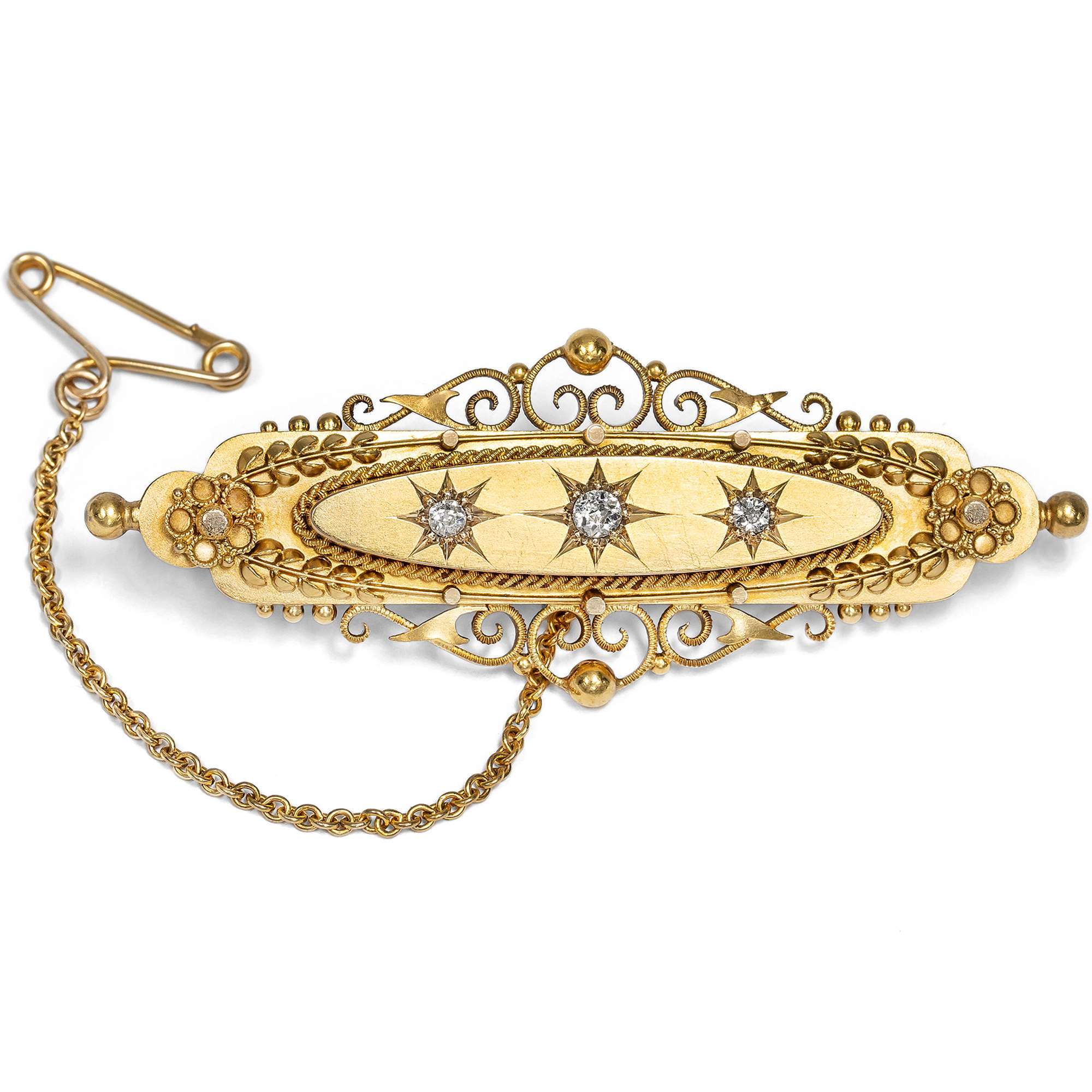 Drei strahlende Diamanten sind hier in sternförmige Fassungen gesetzt. Diese Fassung ist ein ganz typisches Element des antiken britischen Schmucks: der ausführende Goldschmied ritzte hierbei von Hand Strahlen in das Gold ein und fasste den Diamanten in den winzigen Mengen so ausgesparten Edelmetalls. Ein wahrer Kunstgriff!