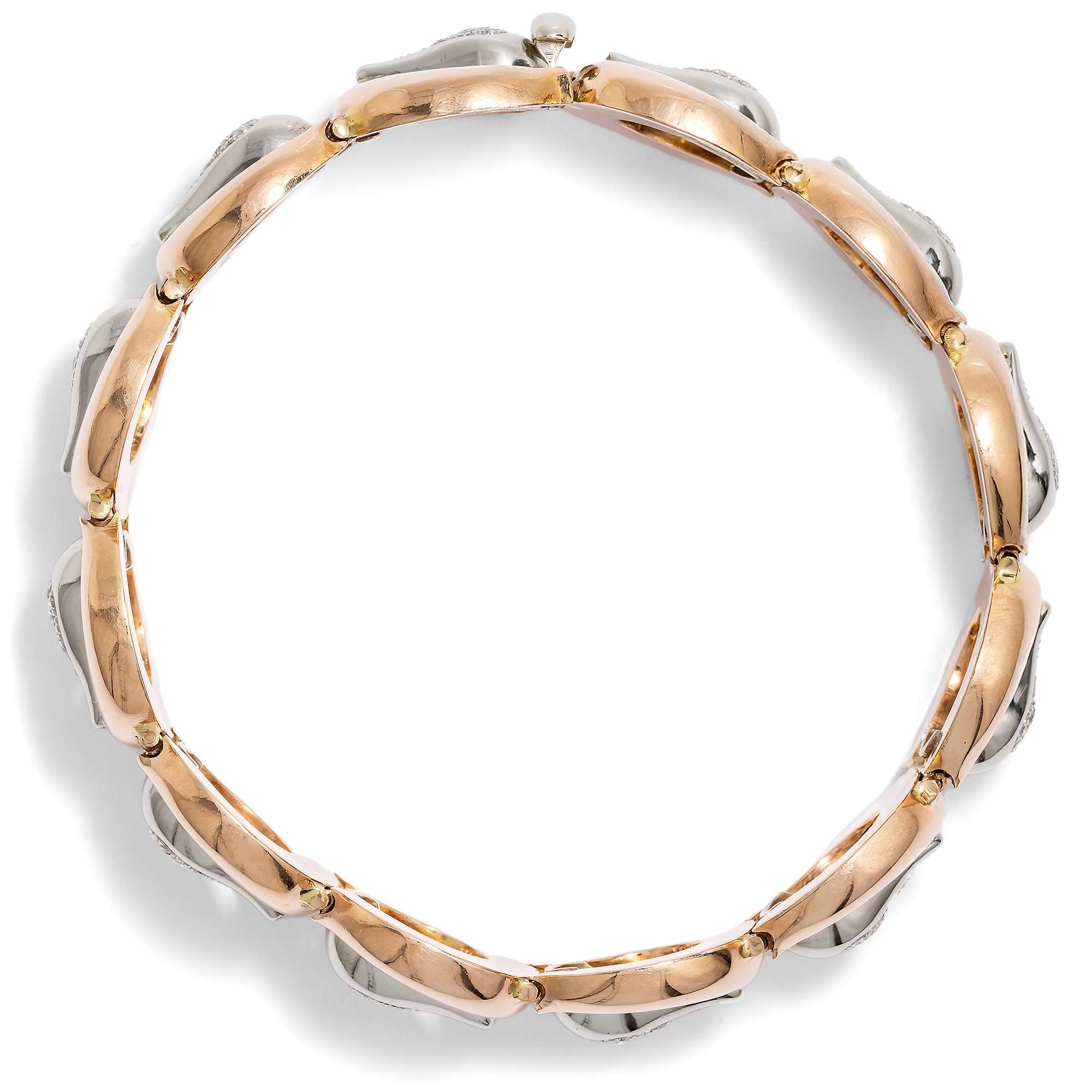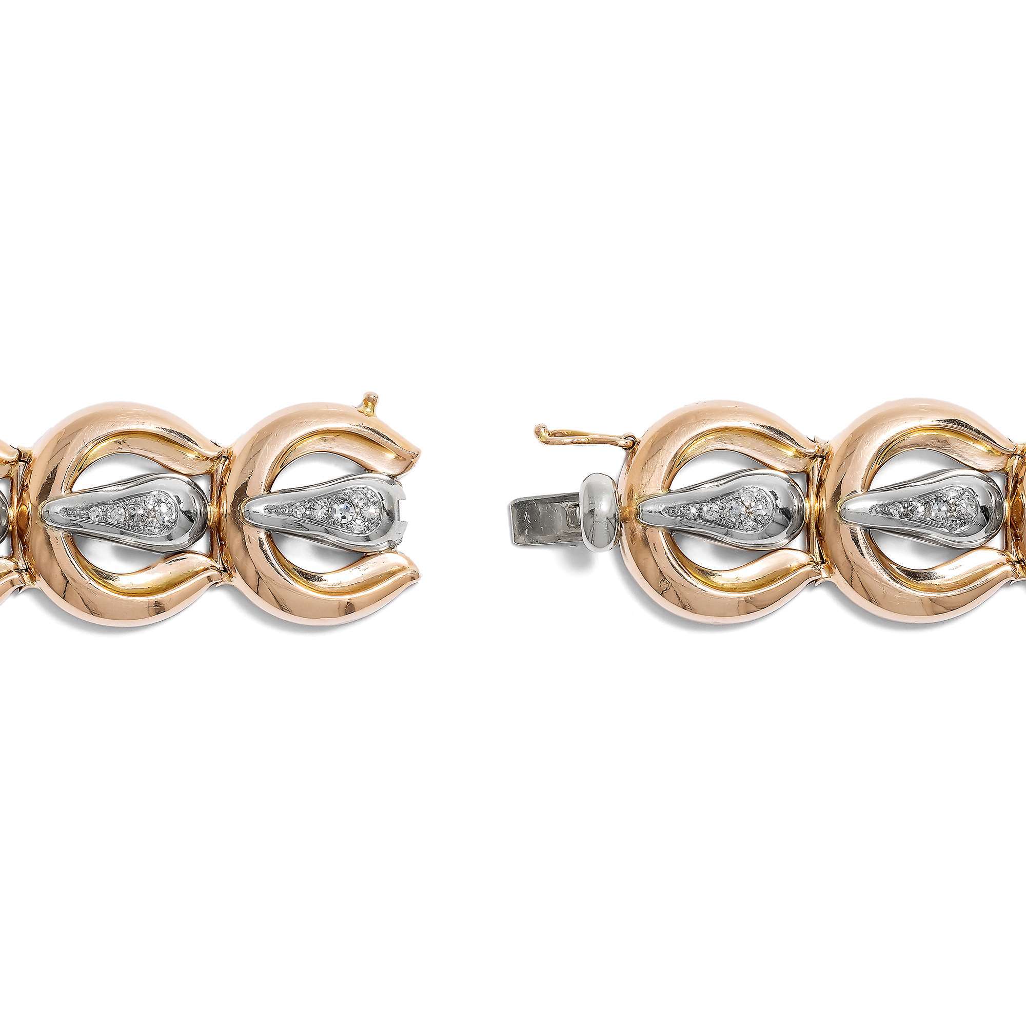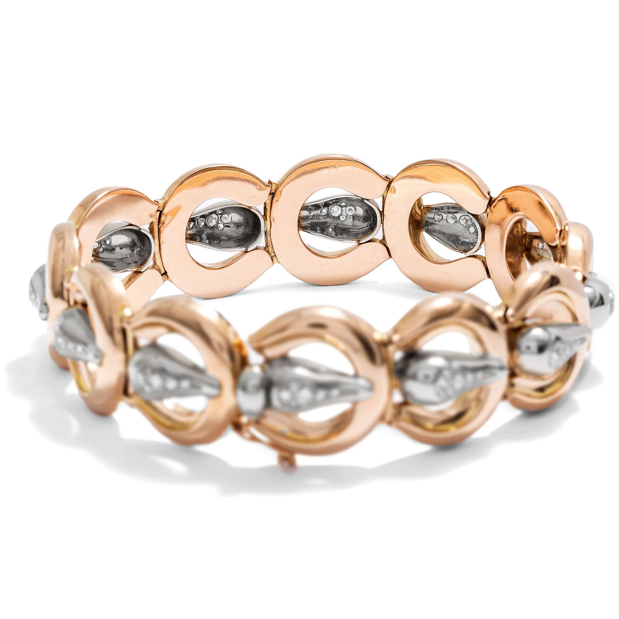 Auch das vorliegende Armband entstammt dieser ebenso turbulenten Zeit. Das aus Gold gearbeitete Stück zeigt sich als Reihung von zwölf gleichförmigen Elementen, die an Gürtelschnallen erinnern. Dabei sind die großen Bögen aus glänzendem Roségold gefertigt, während die Dornen aus Weißgold bestehen. Hier glitzern jeweils sechs Achtkantdiamanten in weißem Feuer. Insgesamt 0,90 Karat Diamanten sind auf dem glamourösen Entwurf vereint.