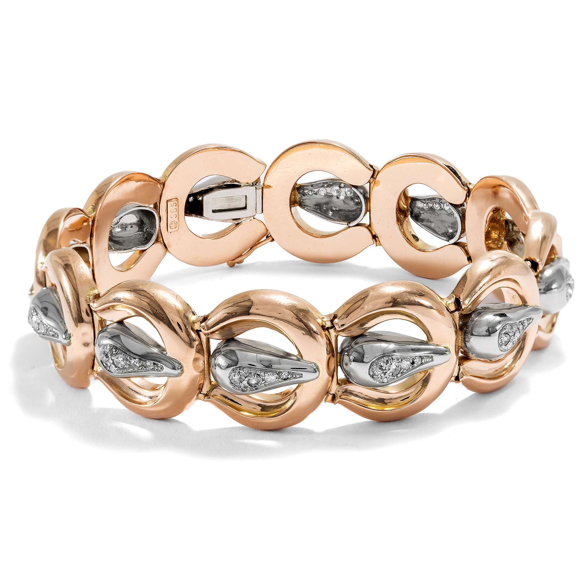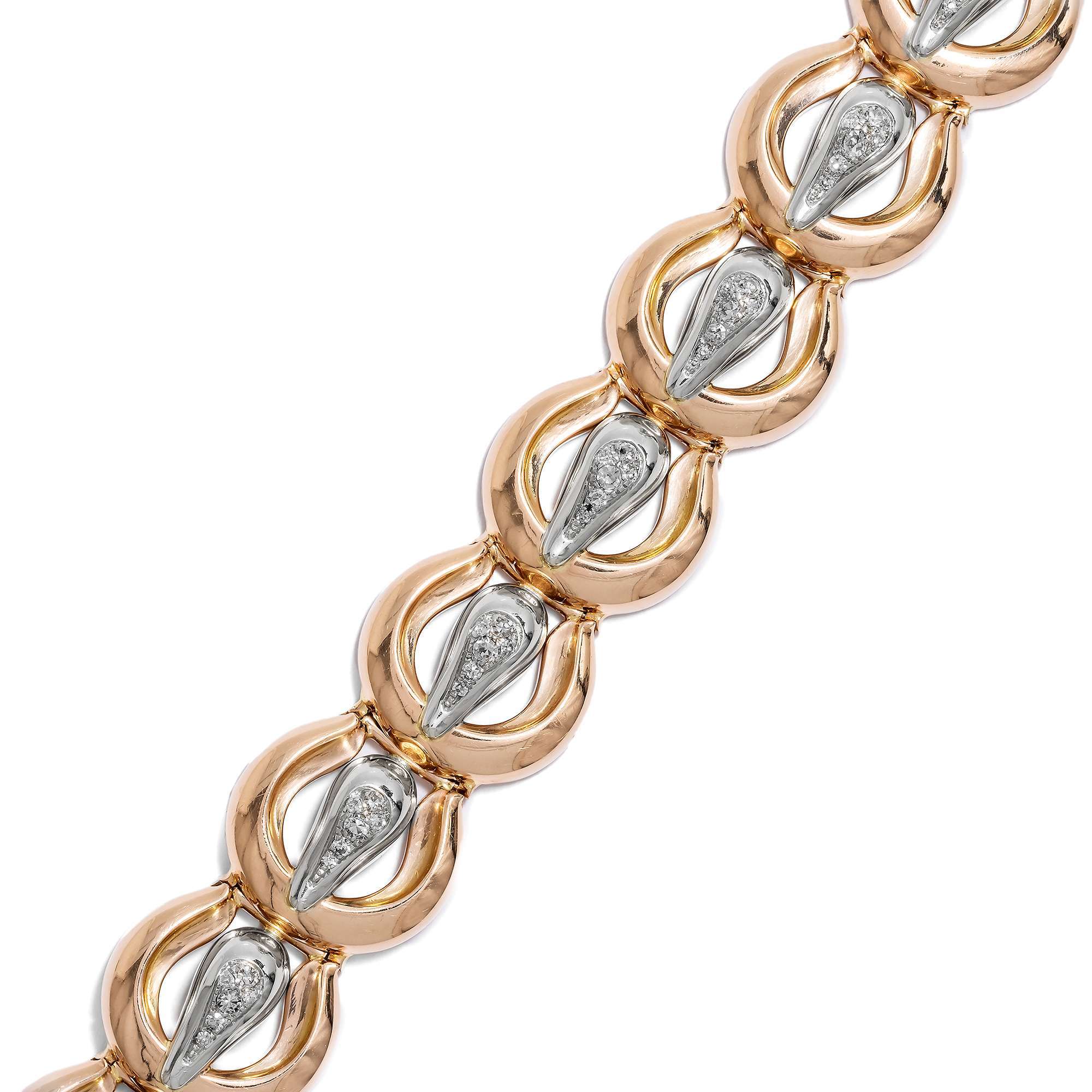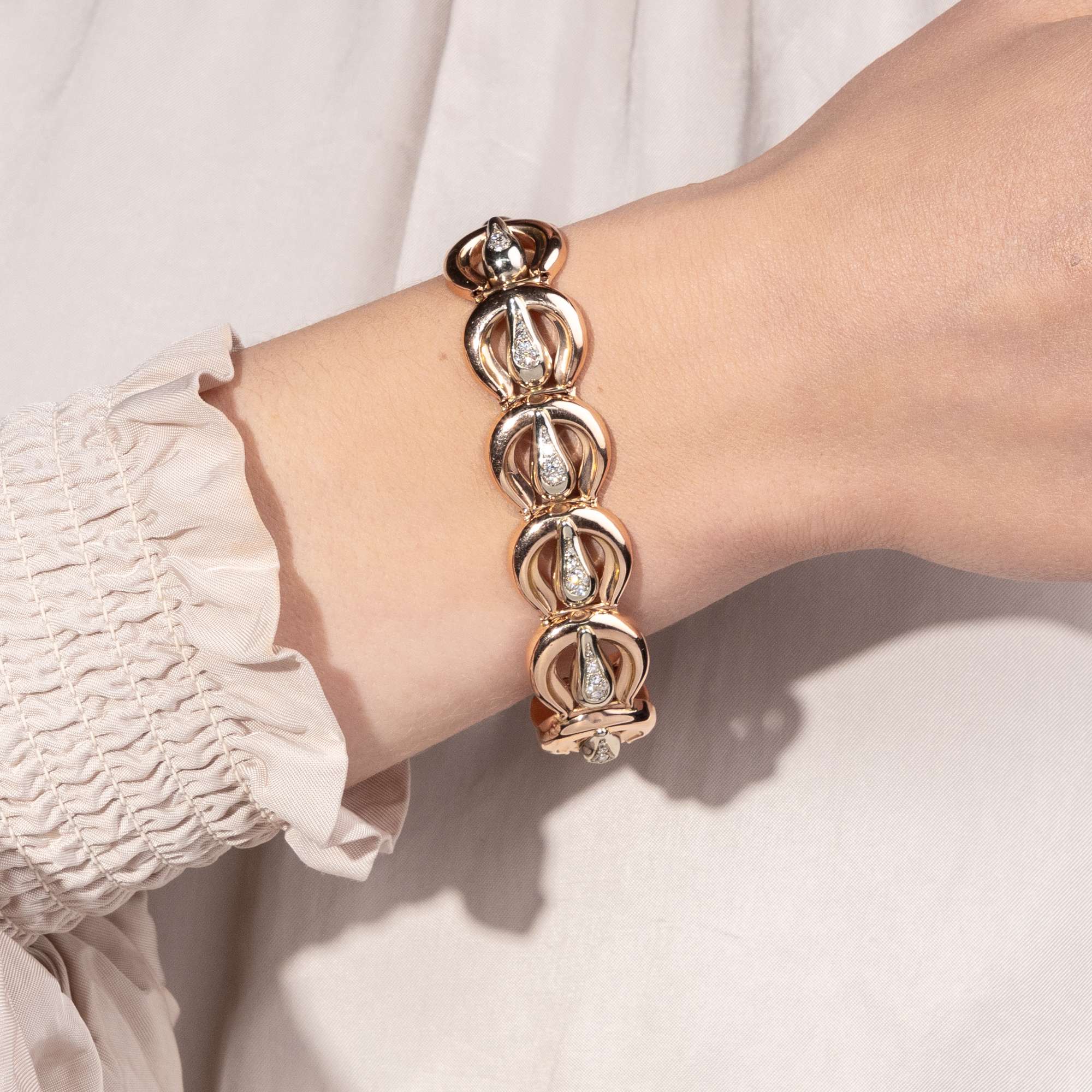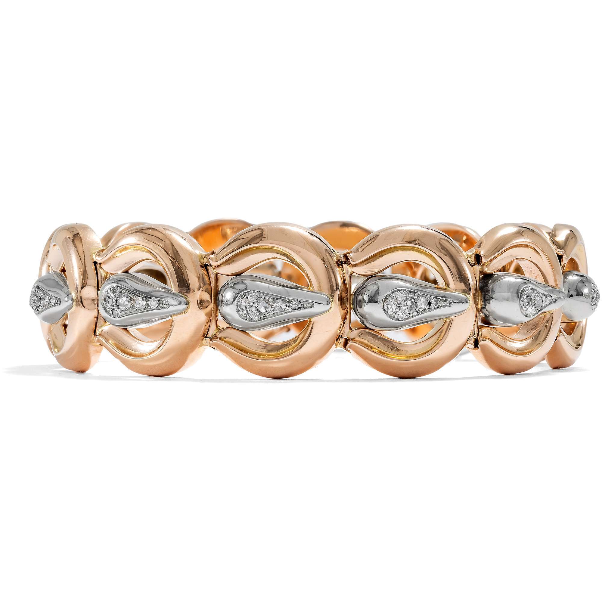 Auch das vorliegende Armband entstammt dieser ebenso turbulenten Zeit. Das aus Gold gearbeitete Stück zeigt sich als Reihung von zwölf gleichförmigen Elementen, die an Gürtelschnallen erinnern. Dabei sind die großen Bögen aus glänzendem Roségold gefertigt, während die Dornen aus Weißgold bestehen. Hier glitzern jeweils sechs Achtkantdiamanten in weißem Feuer. Insgesamt 0,90 Karat Diamanten sind auf dem glamourösen Entwurf vereint.