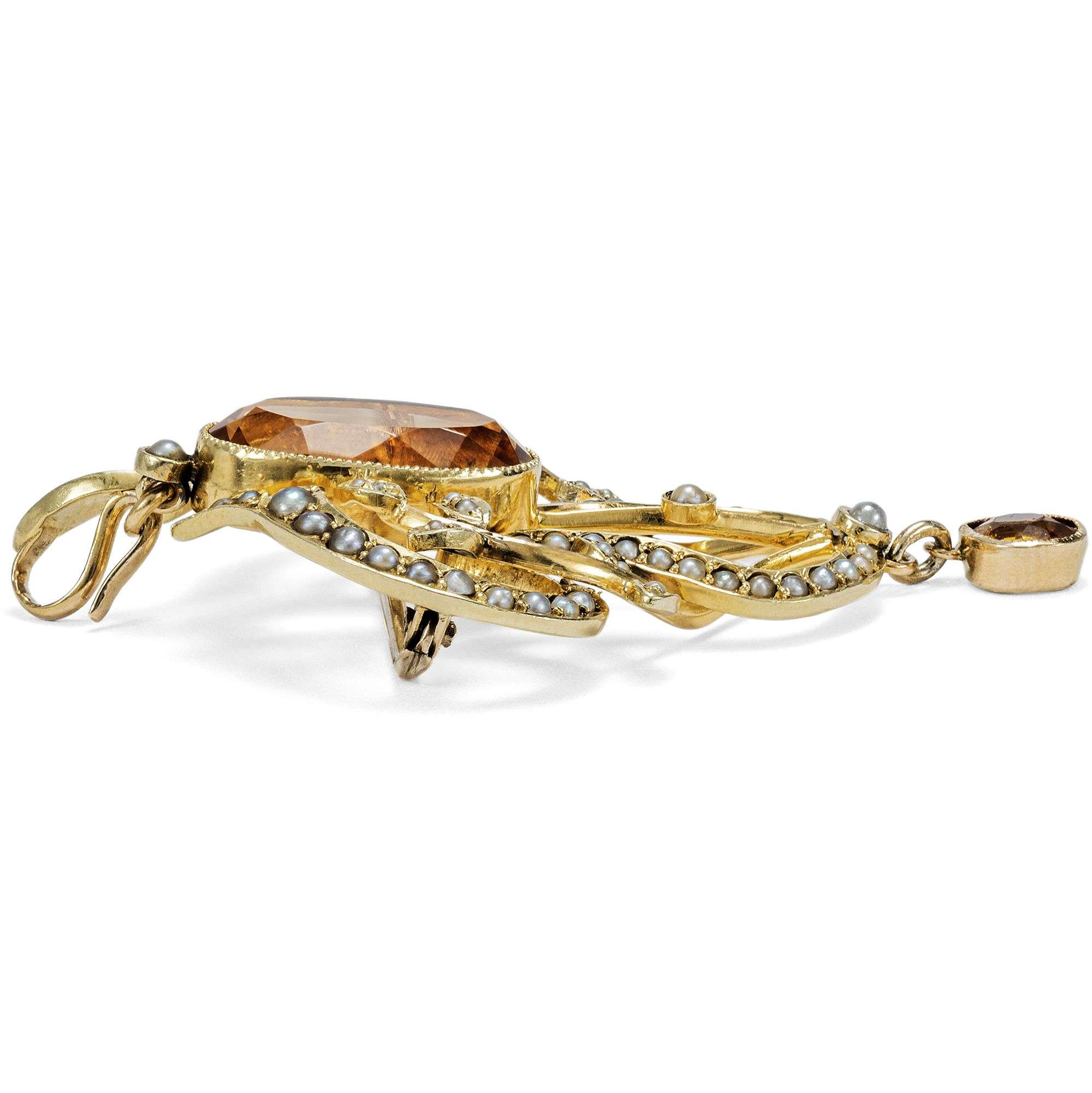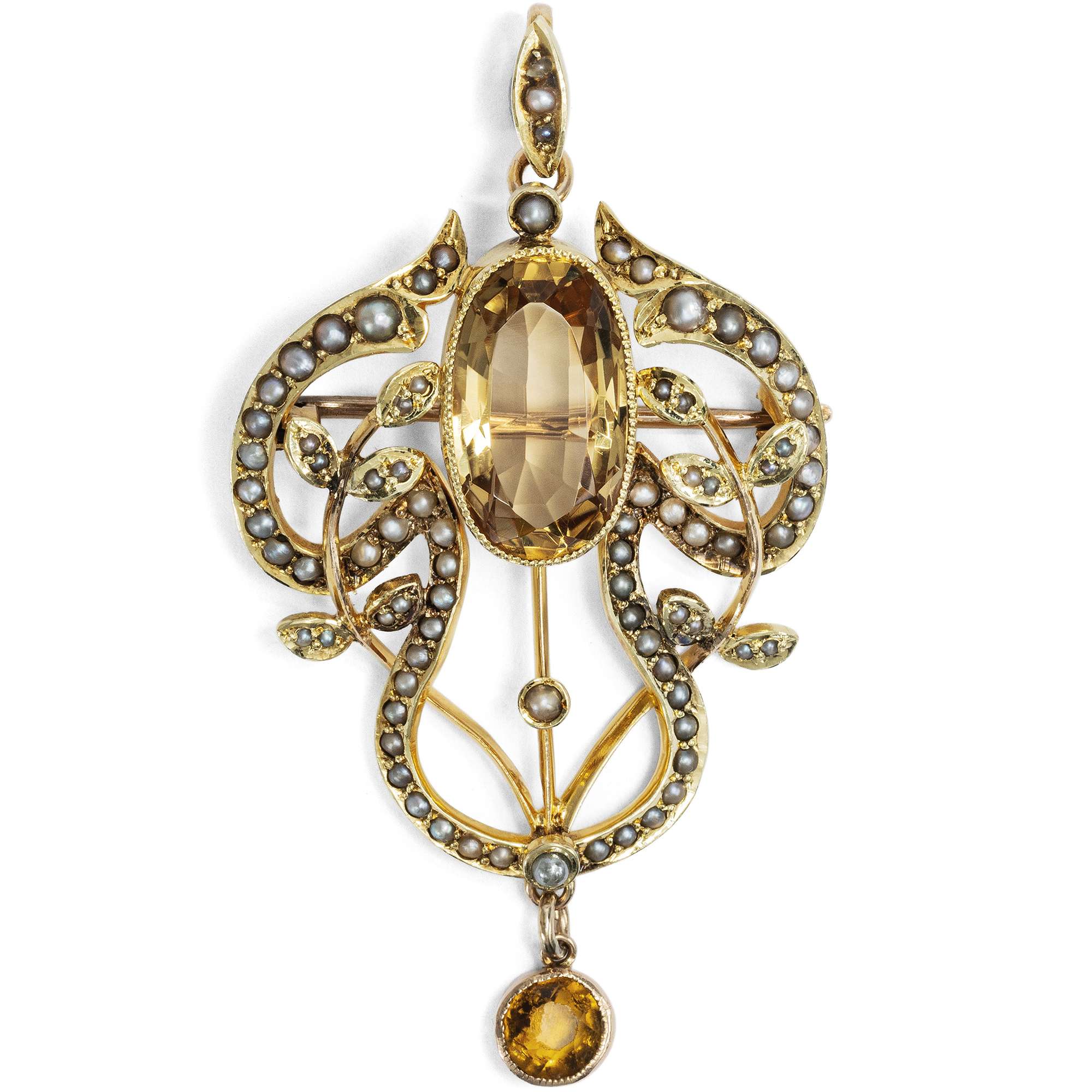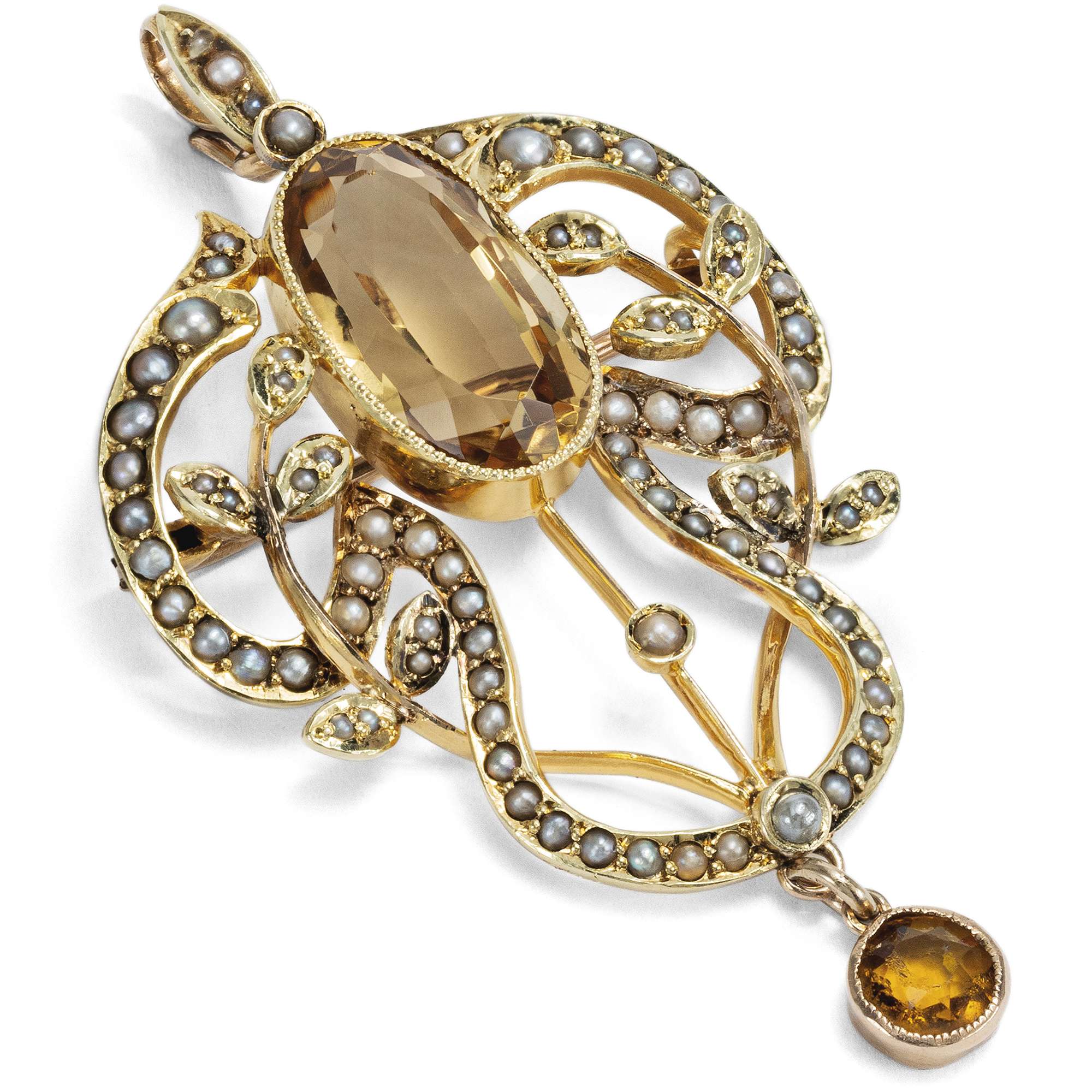Antike Anhänger-Brosche mit Citrinen & Perlen in Gold, Großbritannien um 1900