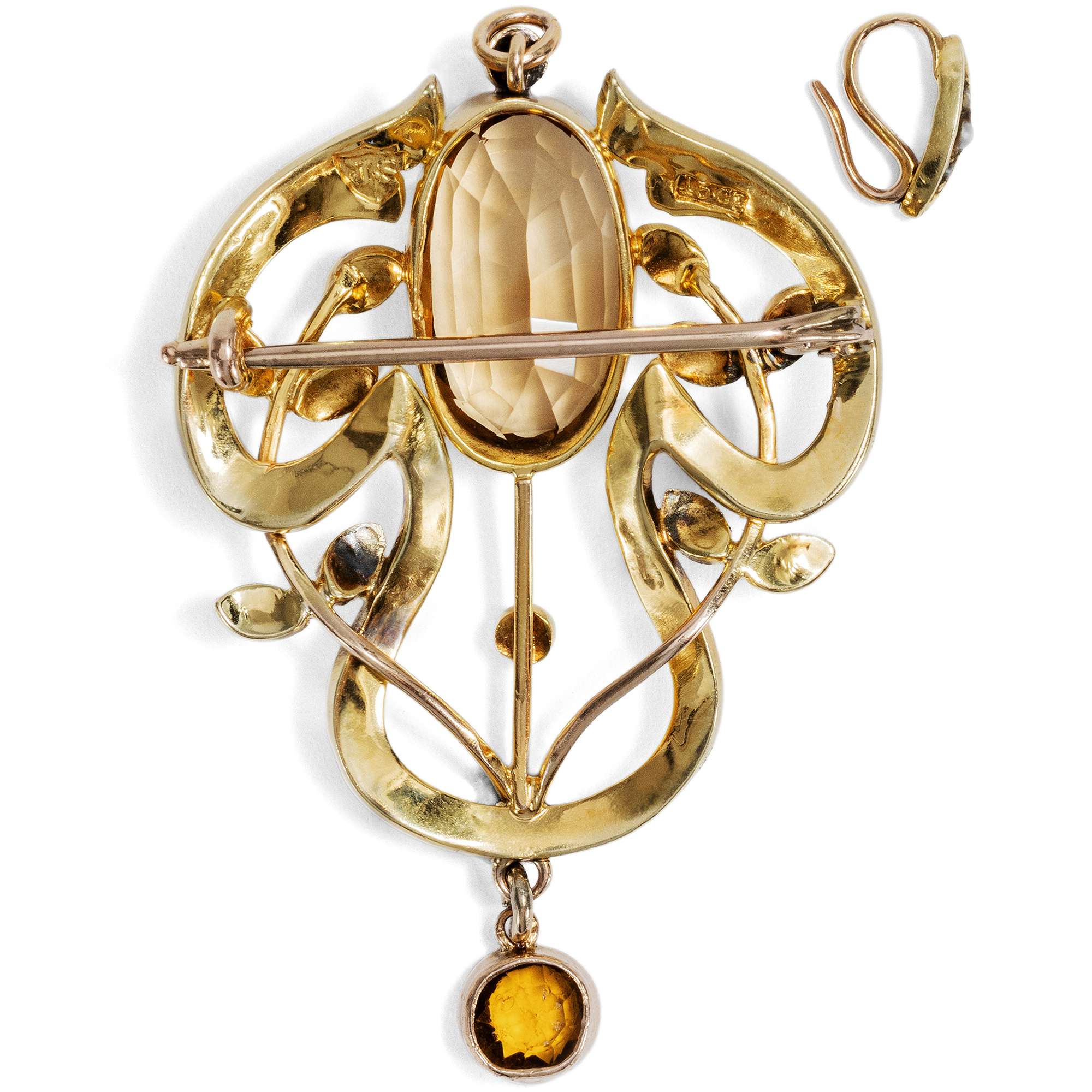 Das Schmuckstück ist aus der typisch britischen Legierung von fünfzehnkarätigem Gold hergestellt. Diese Legierung begegnet uns bei vielen viktorianischen und edwardianischen Schmuckstücken, wurde jedoch nur bis zum Jahr 1932 verwendet; danach wurde ihr Gebrauch zugunsten des international üblicheren Feingehalts von 14 Karat eingestellt. So lässt sich das Schmuckstück, das vom Bodensee zu uns fand, zusätzlich zeitlich einordnen.Eine der schönsten Erfindungen unserer Vorfahren ist die Anhänger-Brosche: ein Schmuckstück, das auf zwei Arten getragen werden kann. Dies bietet nicht nur Abwechslung, sondern macht die Investition in ein kostbares Schmuckstück noch lohnenswerter, da es doppelt so oft zum Einsatz kommen kann. Hier wurde diese Idee besonders luxuriös umgesetzt – die Nadel lässt sich vollständig abschrauben, wenn das Stück als Anhänger getragen werden soll, während die Anhängerschlaufe sich abnehmen lässt, sobald es als Brosche dient.