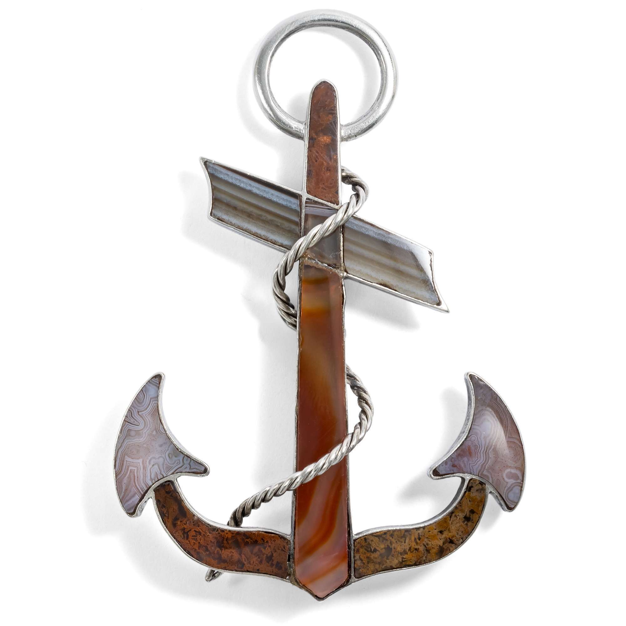 Der große Anker kam aus London zu uns und kann sowohl von Damen wie auch Herren getragen werden.In der zweiten Hälfte des 19. Jahrhunderts wurde Schmuck im schottischen Stil in Großbritannien äußerst beliebt – sogenannte „Scotch Pebbles“. Die Schriften von Sir Walter Scott, in denen das ursprüngliche, naturverbundene Leben in Schottland idealisiert wurde, führten zu einer regelrechten Manie für alles, was aus diesem nördlichsten Teil der britischen Inseln stammte.