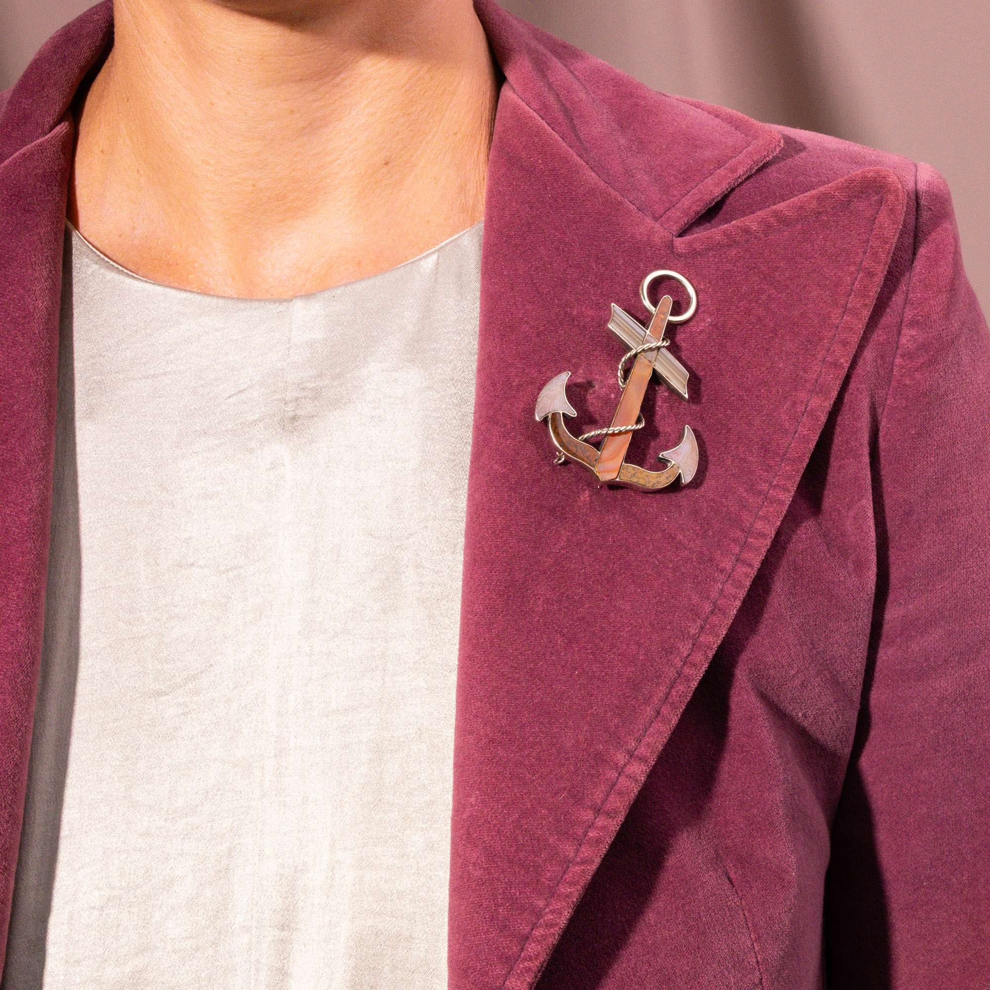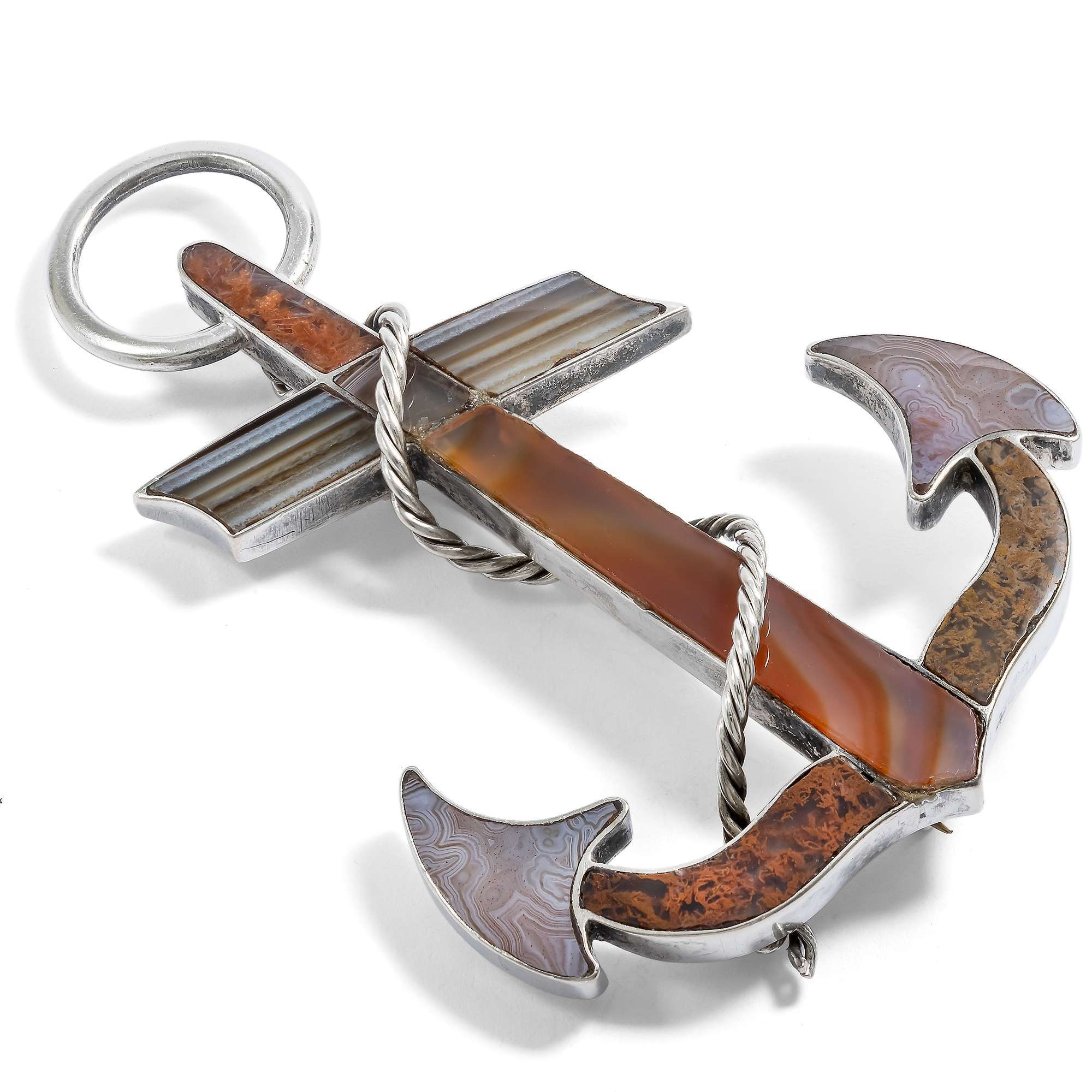 Der hier vorliegende Anker aus Schottland kann zumindest in Stilfragen Halt geben. Die Brosche ist aus poliertem Achat und Jaspis zusammengesetzt, die in Silber gefasst sind. Dieser Schmucktypus wird heute als „Pebble Jewellery“ („pebble“, engl. für Kieselstein) bezeichnet.