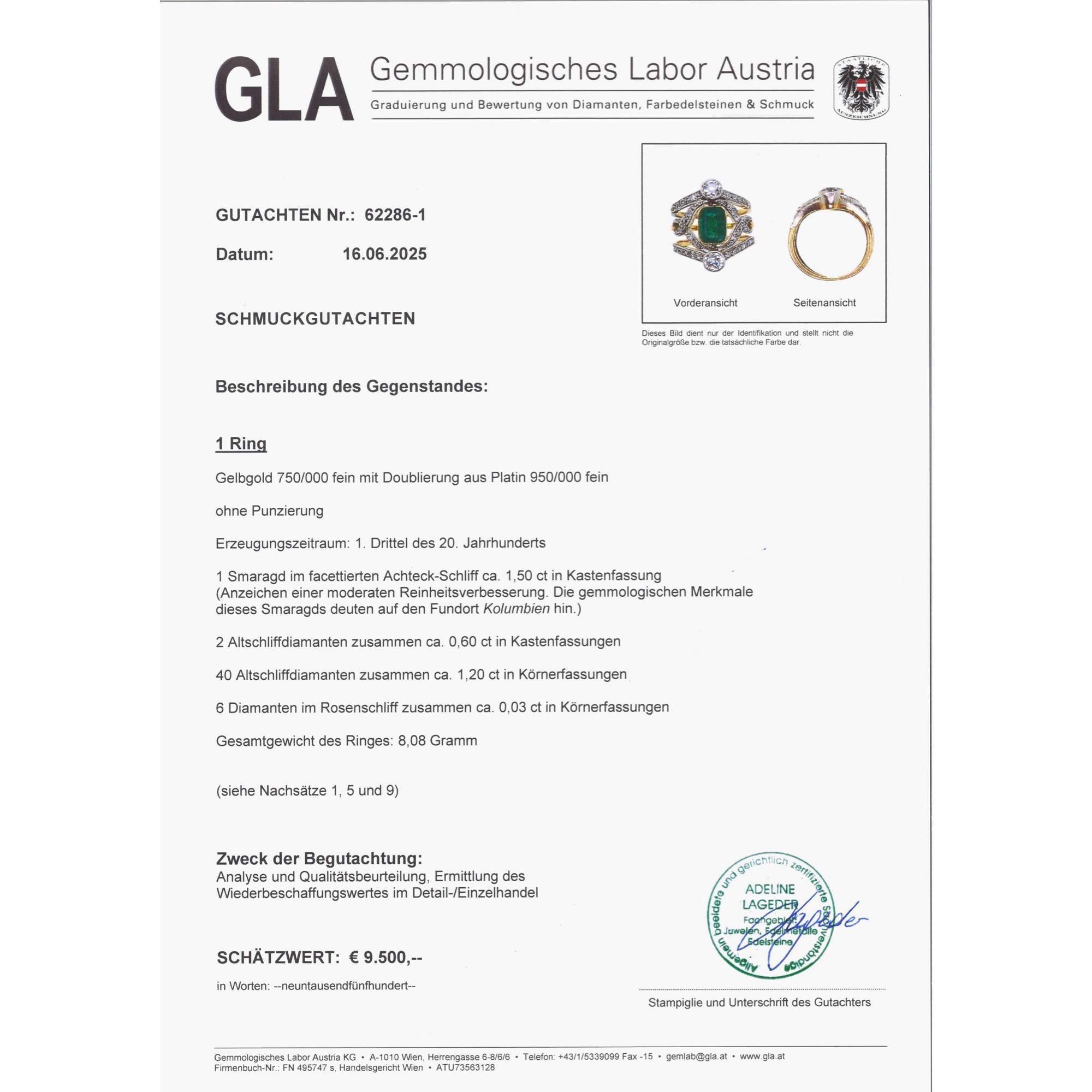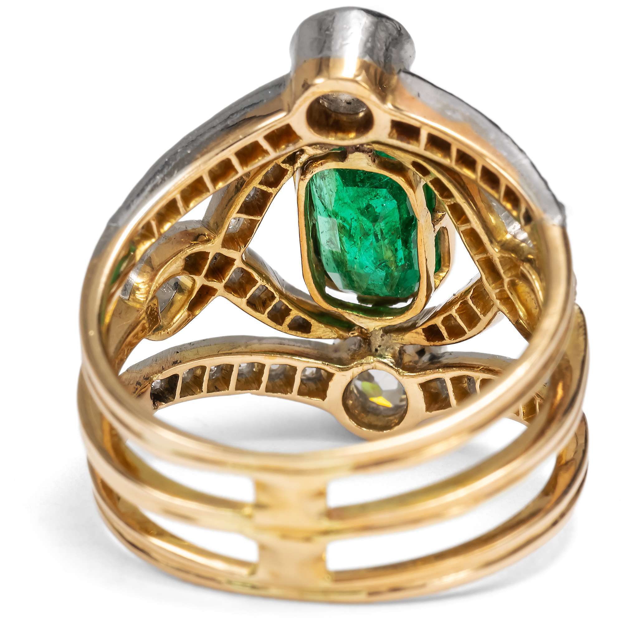 Ein edles Kleinod war also der hier vorliegende Ring bereits in seiner Zeit, denn er fasst ein großes, strahlend schönes Exemplar jenes begehrten Edelsteins. Der intensiv grün leuchtende Smaragd stammt aus Kolumbien, der klassischen und begehrtesten Herkunft feiner Smaragde, und wiegt etwa anderthalb Karat. Er wird von weißen Diamanten in elegant geschwungenen Bändern begleitet. Während die Diamanten in weißes Platin gefasst sind, hält eine gelbgoldene Kastenzarge den Smaragd, um ihn farblich perfekt zu inszenieren.