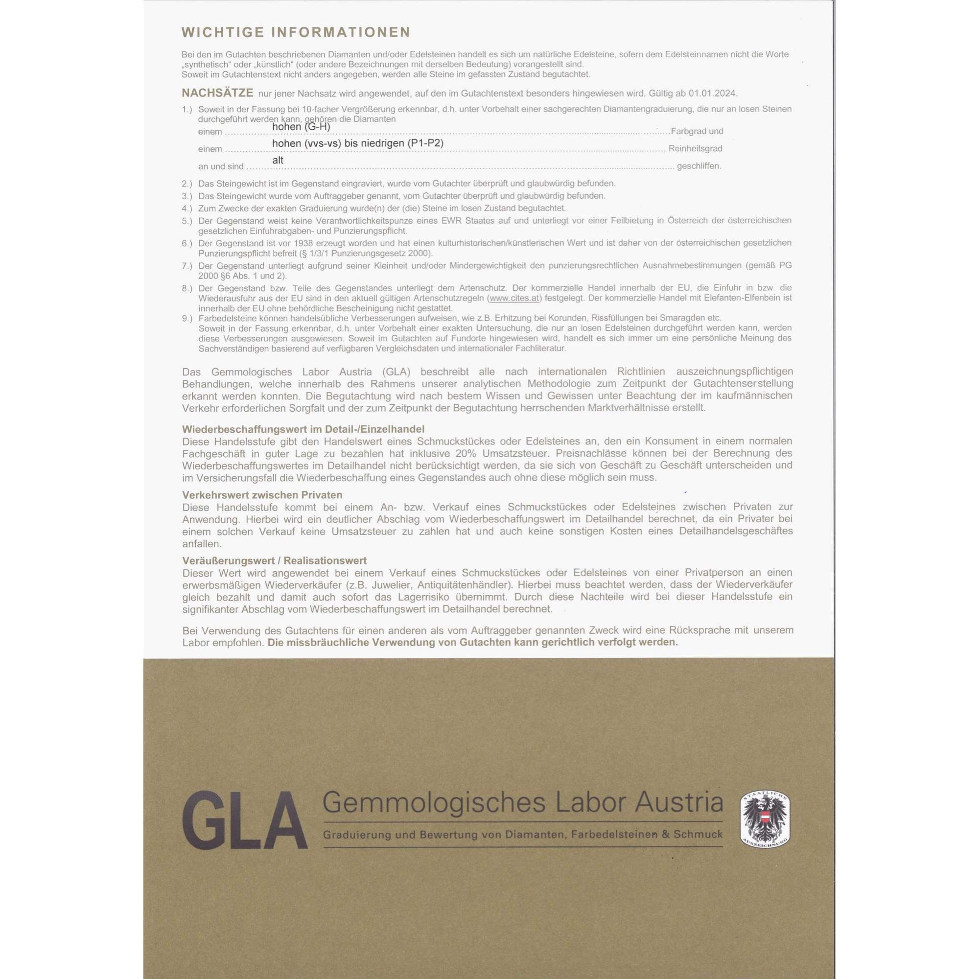 | Zertifikat: | Lieferung mit einem detaillierten Gutachten des Gemmologischen Labors Austria, Wien, vom 16. Juni 2025. Festgestellter Wiederbeschaffungswert: 9.500,- Euro. |