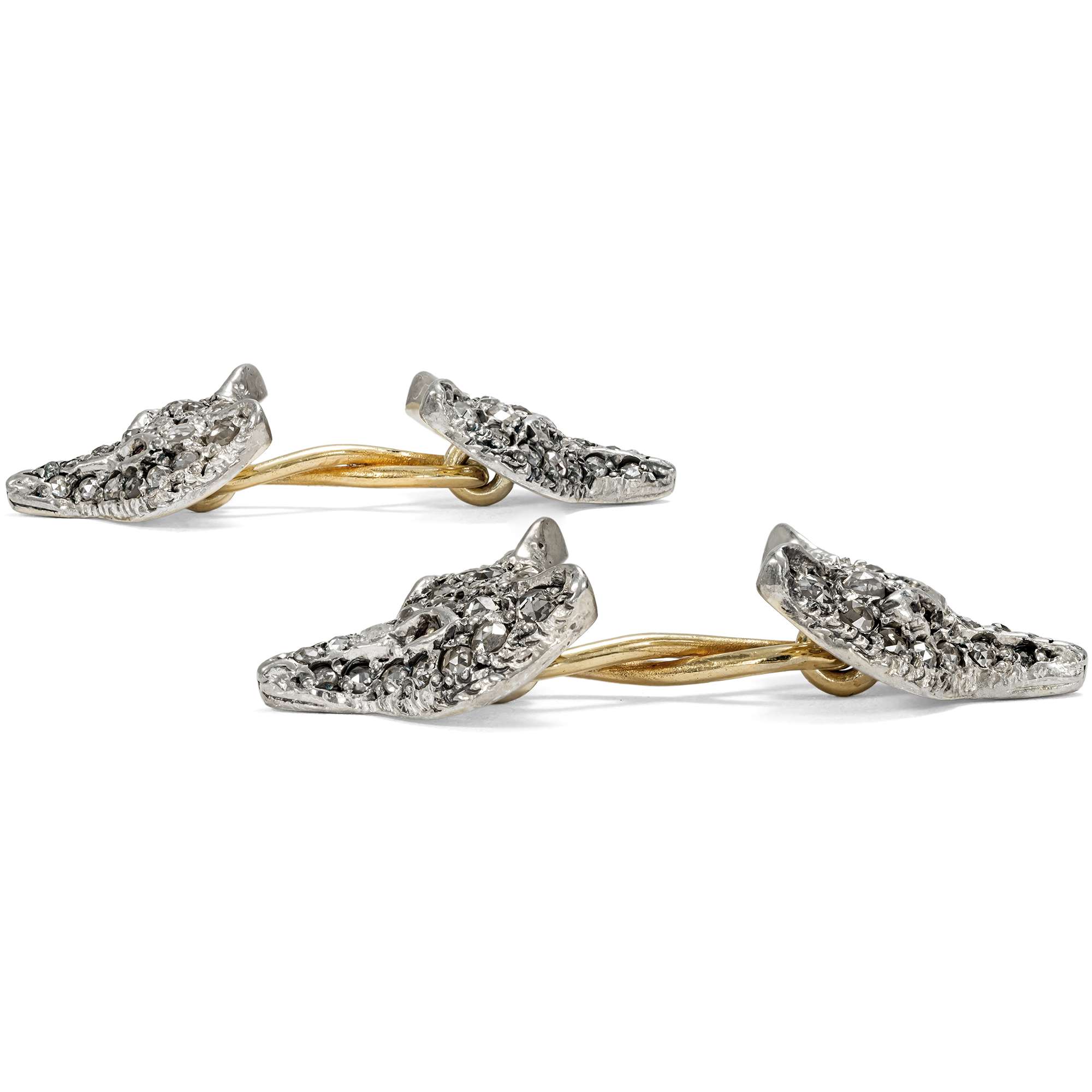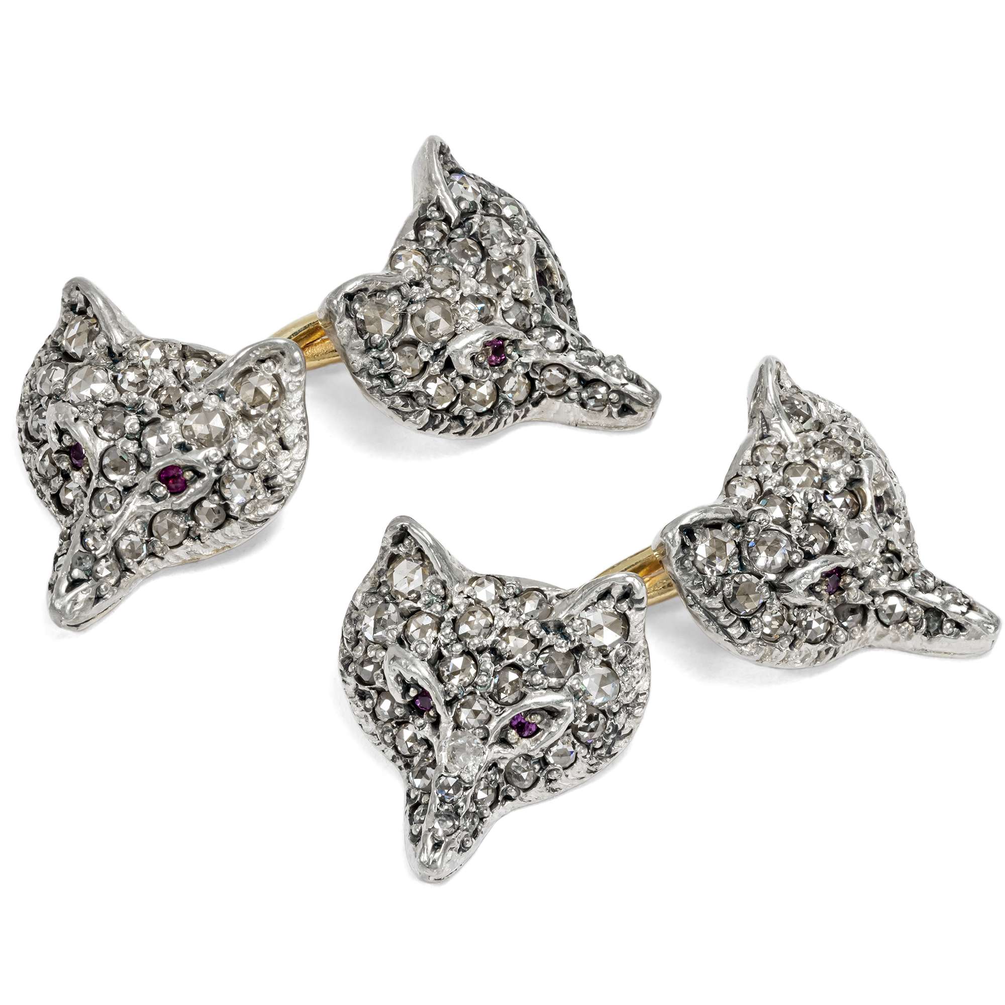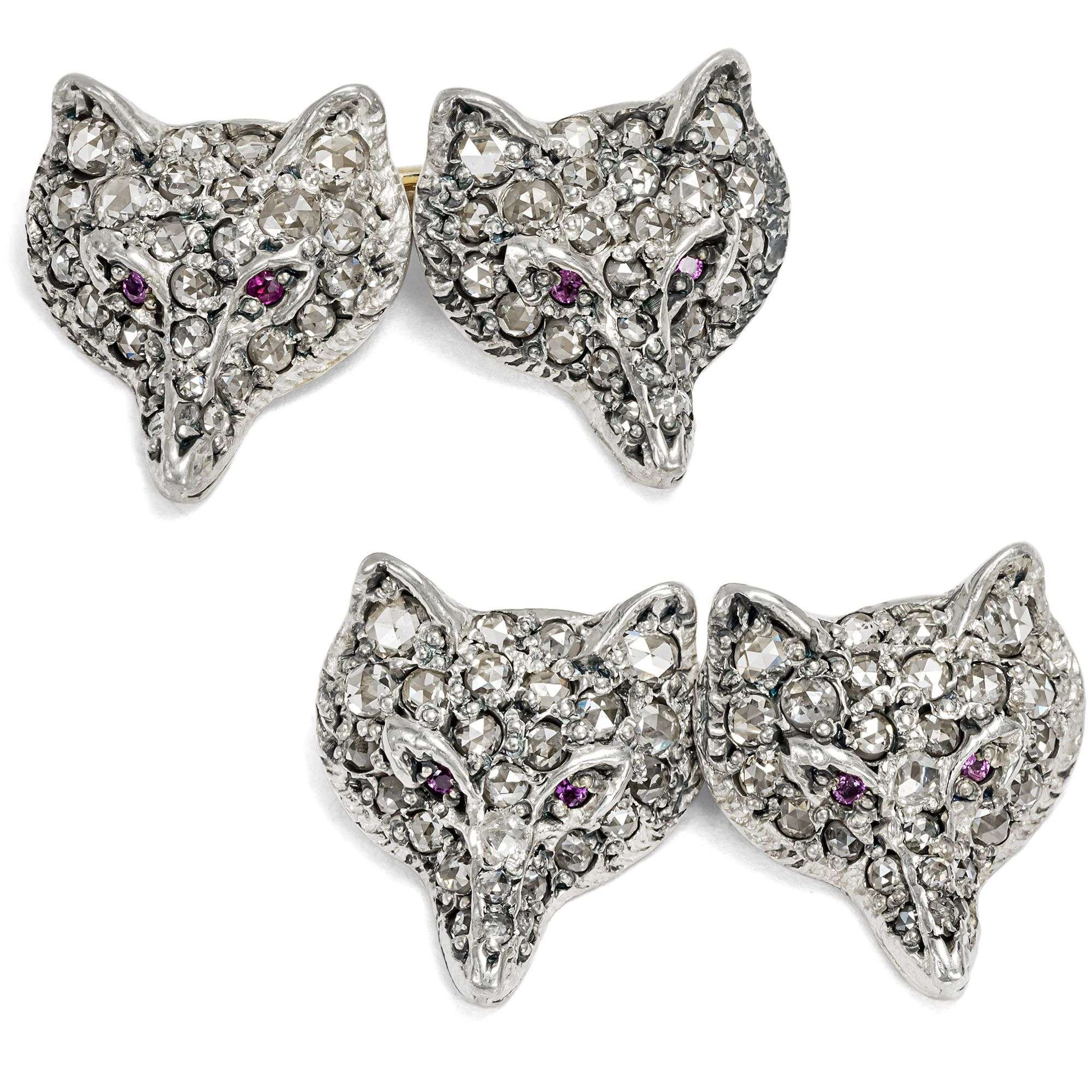 Als Manschettenknöpfe gearbeitet, sind die Fuchsgesichter in den Jahren um 1960 nach viktorianischen Vorbildern in Großbritannien entstanden. Rückseitig aus Gelbgold gefertigt, lassen sie sich auch auf weißen Hemden problemlos tragen – da färbt nichts ab. Die Stücke sind erstklassig erhalten.Im späten 19. Jahrhundert entstand eine neue, nie zuvor gesehene Art von Schmuckstücken: Sogenannte „Novelty Jewellery“ sorgte durch neue, überraschende und bis dato undenkbare Formen und Materialzusammenstellungen für Furore. So ließen sich mit einem Mal Vögelchen auf Schaukeln nieder und wurden zu Ohrgehängen. Viele Gegenstände des täglichen Lebens fanden ihren Weg an das Revers der Damen und Herren – etwa Tennis- und Golfschläger oder Briefmarken. Auch die technische Welt fand in dieser Mode ihren Niederschlag: Maschinen, Automobile en miniature und das neuartige Telefon bildeten überraschende Blickpunkte.