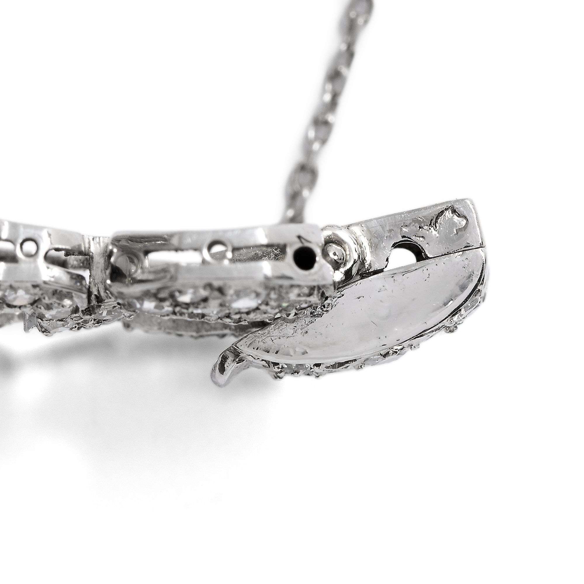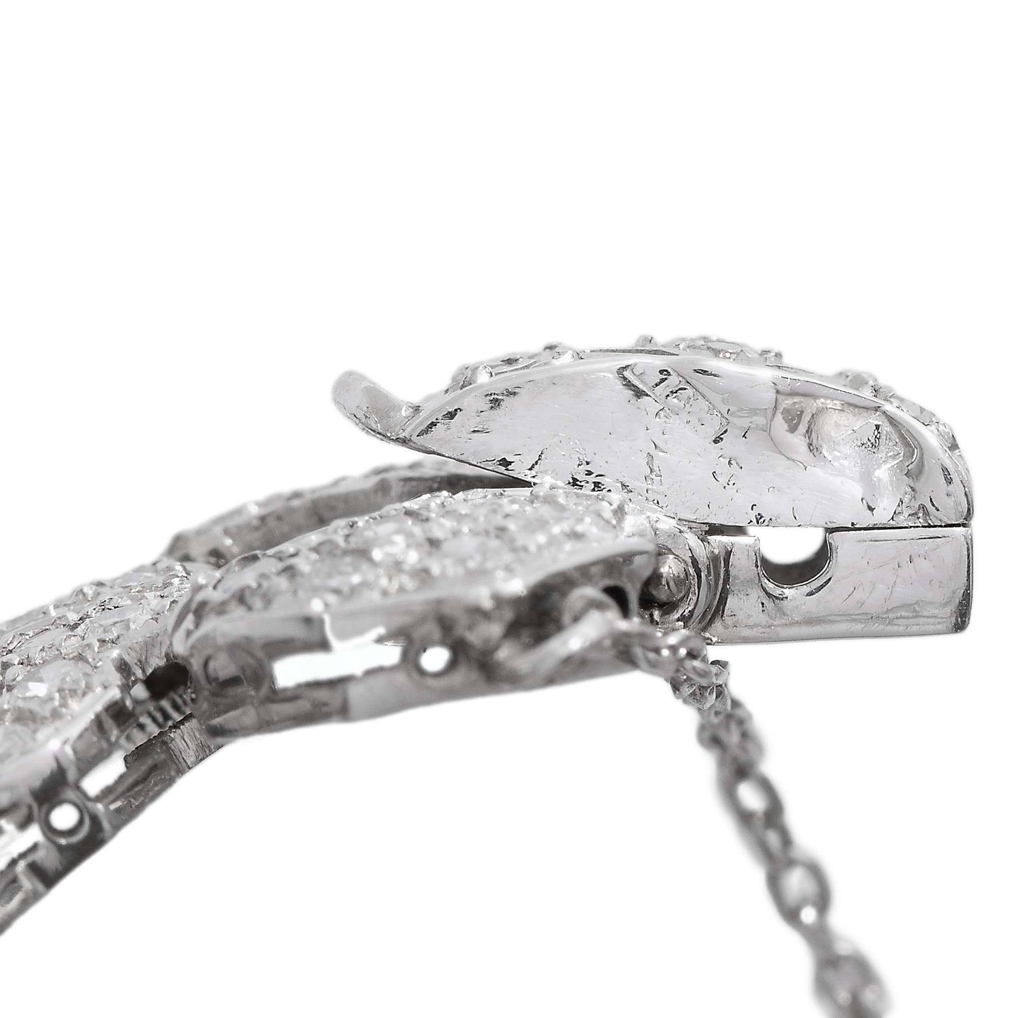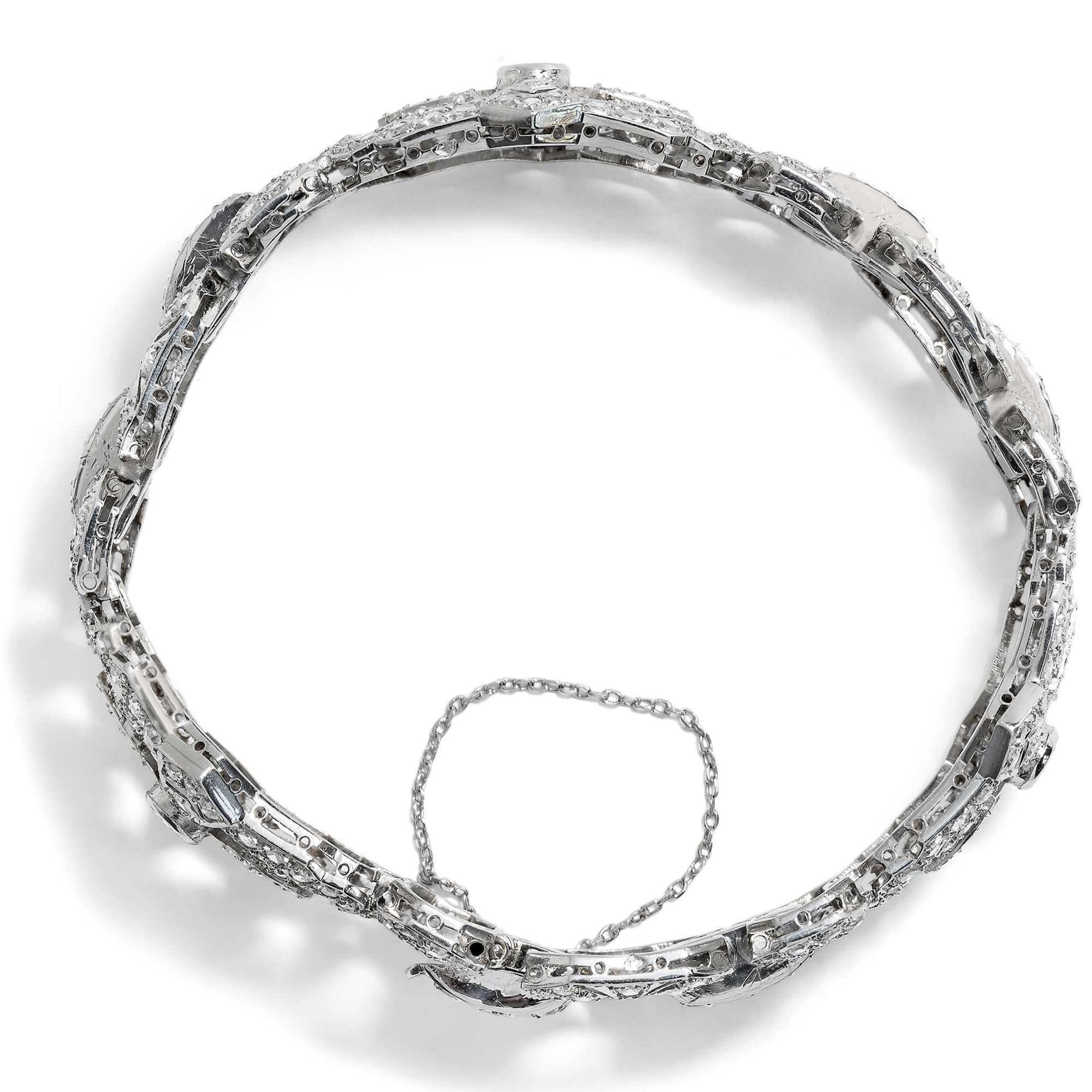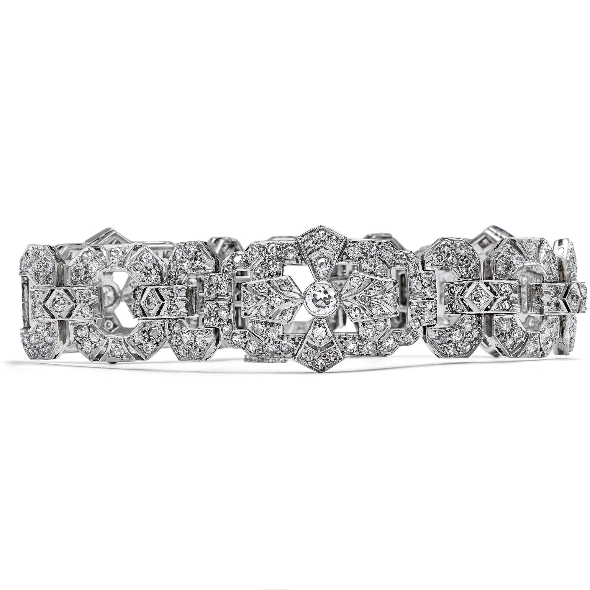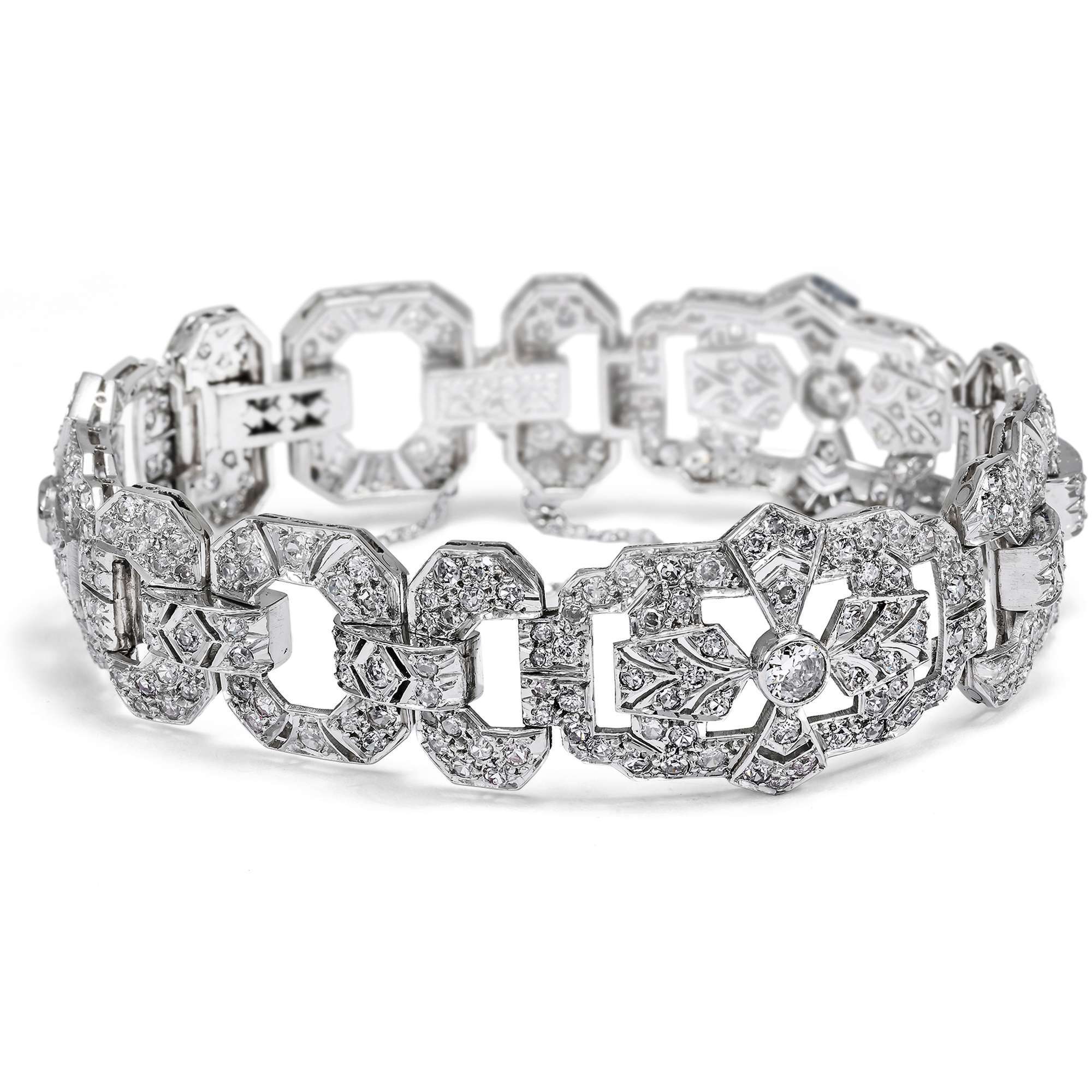 Das her vorliegende Armband ist ein geradezu prototypisches Schmuckstück dieses Stils – und es überrascht nicht, dass es aus Frankreich stammt. 339 Diamanten sind in Platin gefasst. Der Entwurf orientiert sich am damals beliebten Gürtelschnallenmotiv: Breite, wie Schnallen geformte Elemente wechseln sich mit schmaleren, achteckig entworfenen Gliedern ab.. Jede noch so kleinste Stelle der Oberfläche ist mit Diamanten in unterschiedlichen historischen Schliffen ausgefasst, sodass das Band wie ein Gürtel aus Licht erscheint.