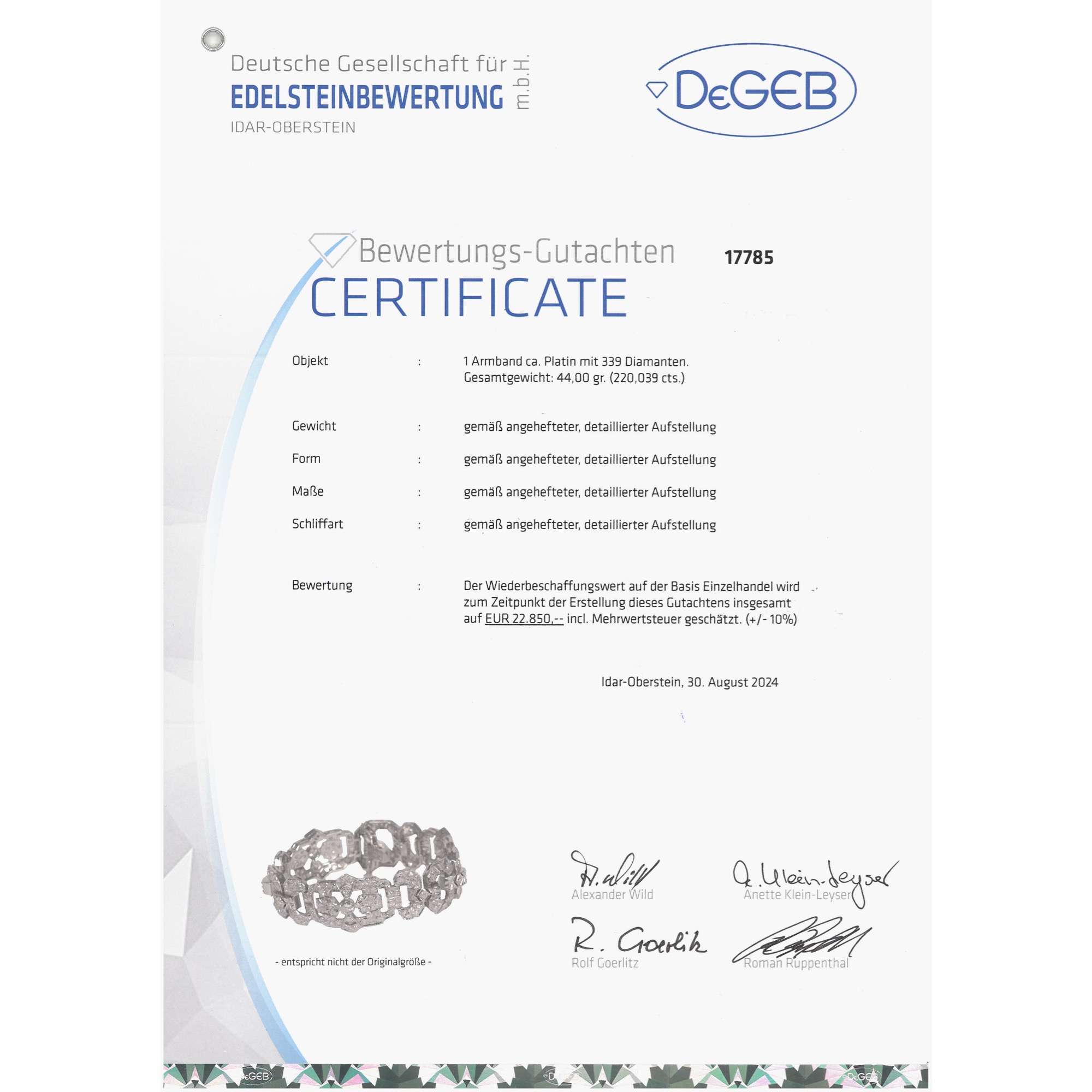 Das abgebildete, unabhängige Gutachten zur Qualität der Materialien liegt dem Armband bei.