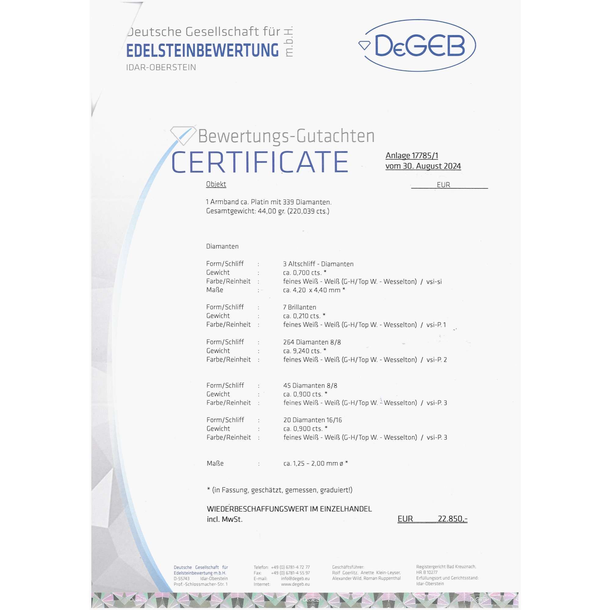 | Zertifikat: | Lieferung mit einem detaillierten Gutachten der Deutschen Gesellschaft für Edelsteinbewertung vom 22. September 2024. Festgestellter Wiederbeschaffungswert: 22.850,- Euro. |
