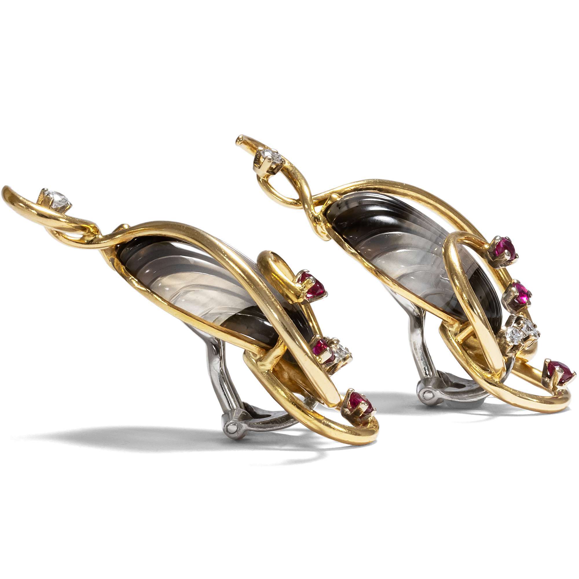 | Material: | Drei geschnitzte Streifenachate, max. 4,0 x 4,9 cm Zwölf Diamanten im Brillantschliff, zus. ca. 0,46 ct, Feines Weiß (Top Wesselton, G) – Weiß (Wesselton, H), vsi Zehn natürliche Rubine im Sternschliff, zus. ca. 0,34 ct, max. 2,2 mm Durchmesser Gold 750/000, entspricht 18 Karat |