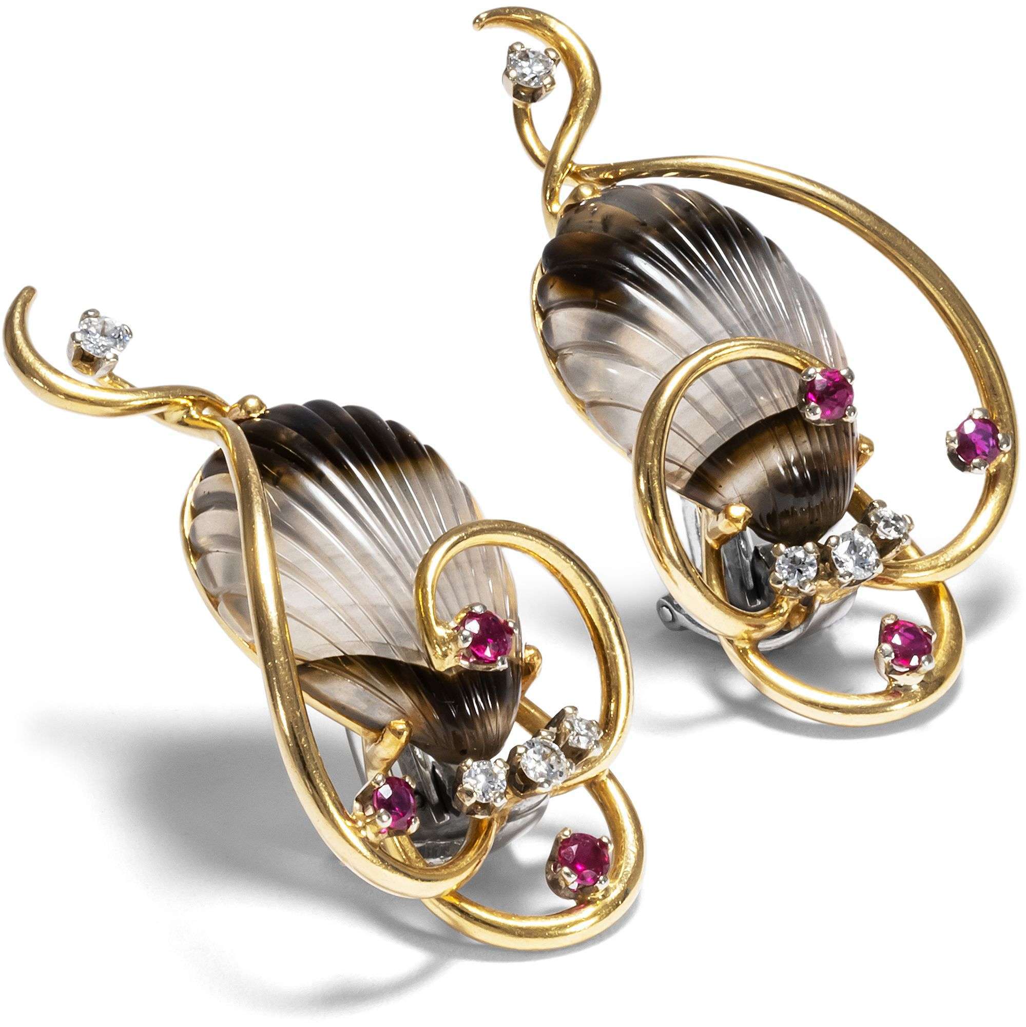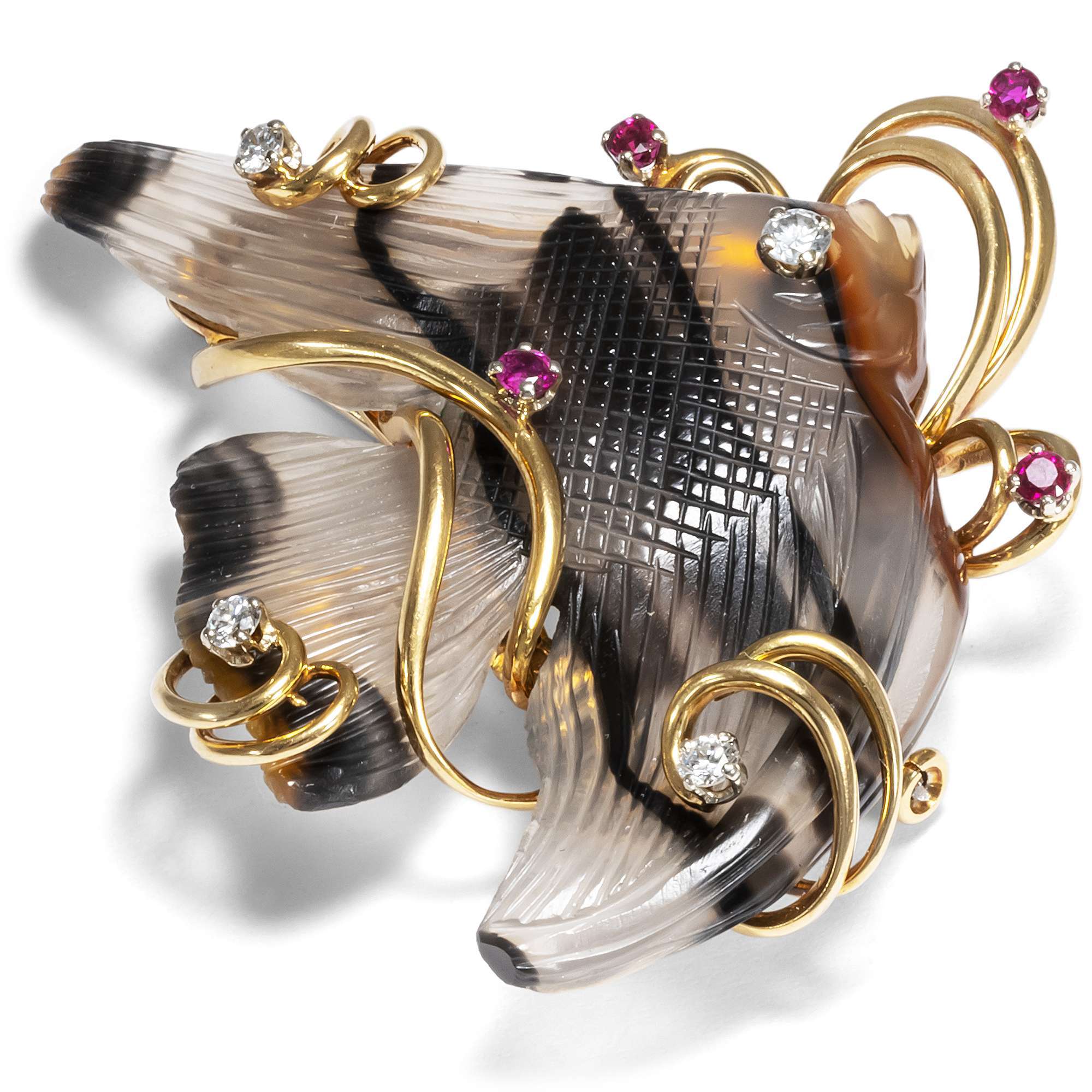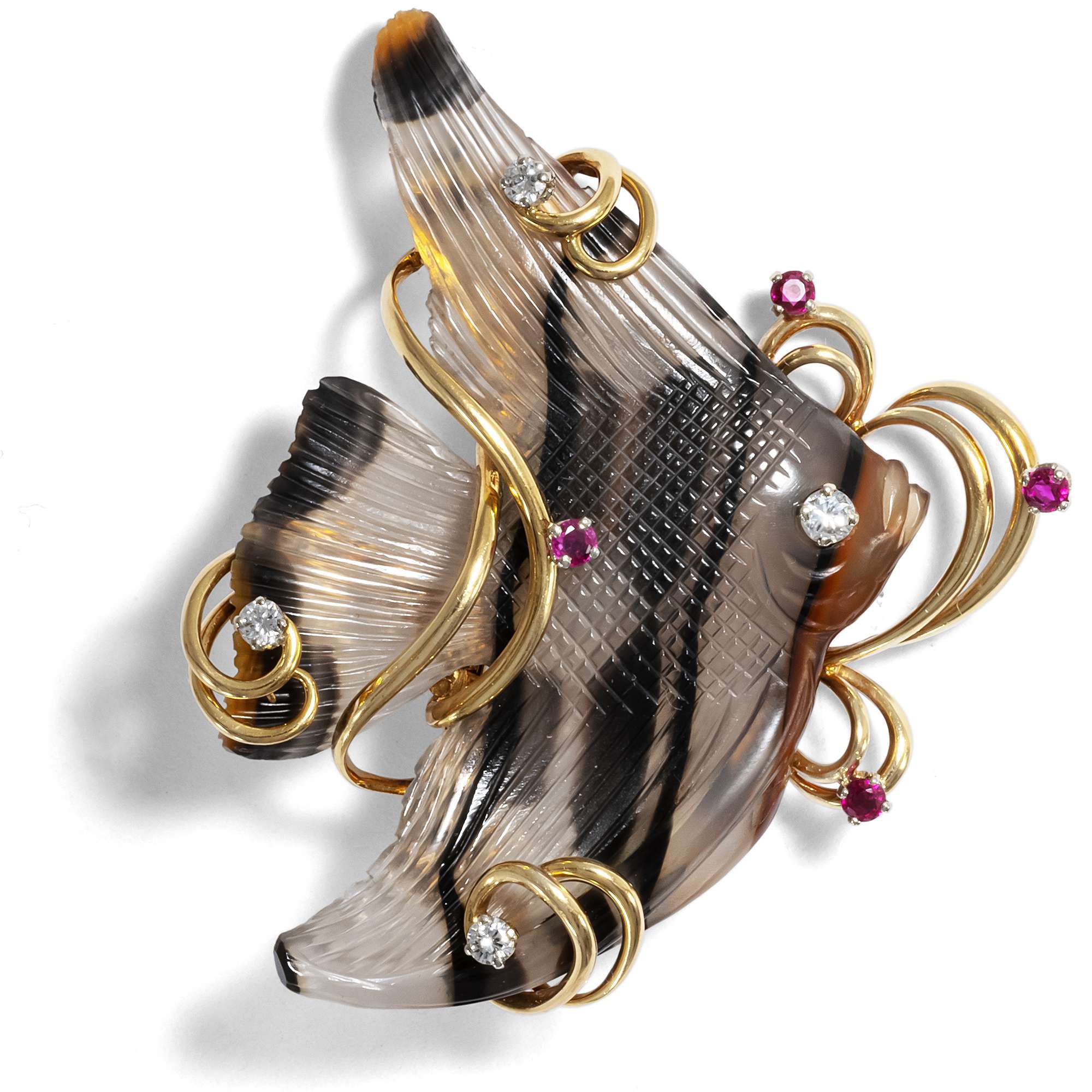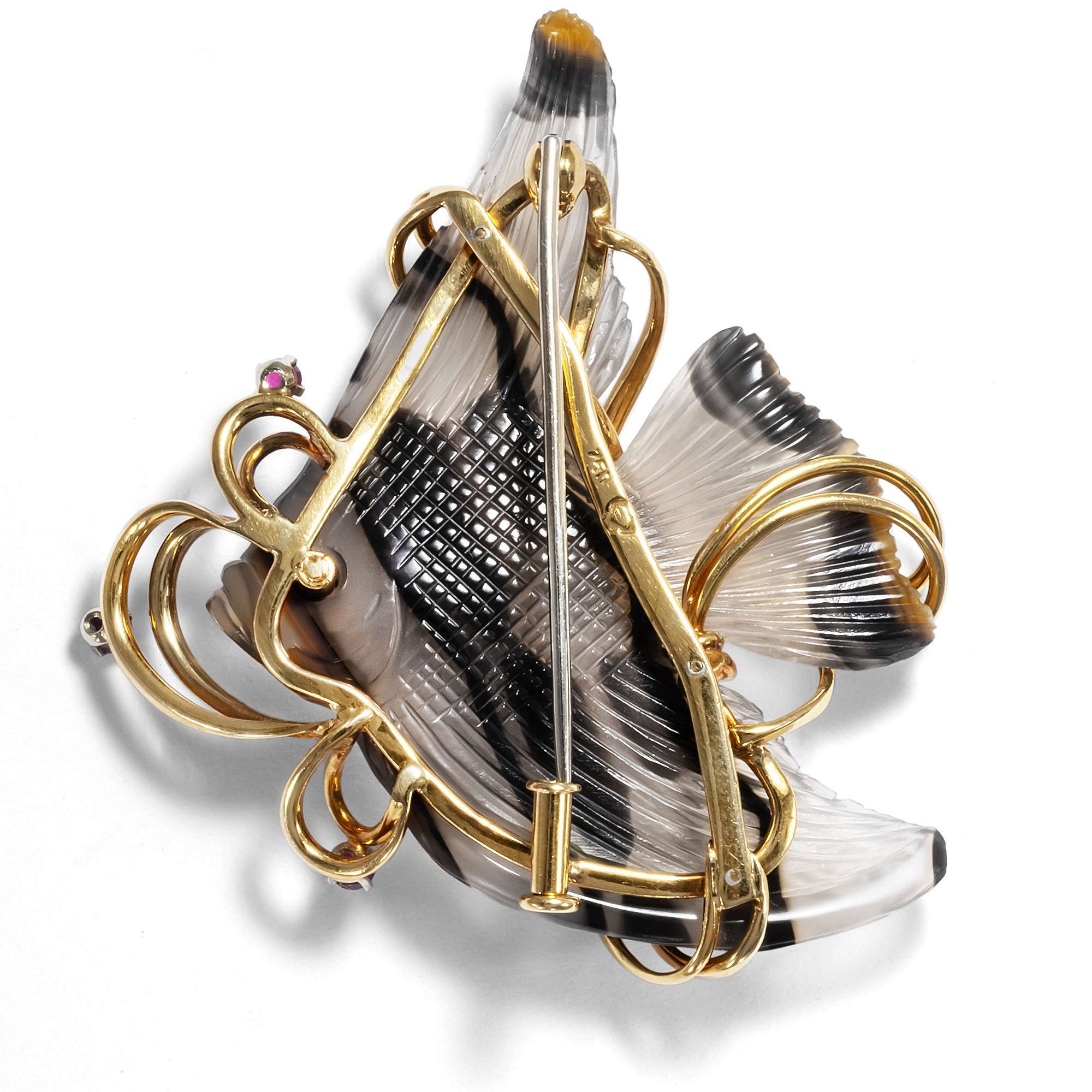 Die große Brosche zeigt einen anmutigen Skalar oder auch einen Wimpelfisch. Geschickt hat es der ausführende Steinschneider verstanden, die natürliche Streifung des Achates zu nutzen, um einen lebensechten Eindruck zu erzeugen. Die beiden Ohrclips zeigen jeweils eine ebenfalls gestreifte Muschel. Gehalten werden die Steine von wie Seetang verschlungenen Stäben aus hochkarätigem Gold. Kleine Diamanten und rote Rubine setzten zusätzliche Blickpunkte.