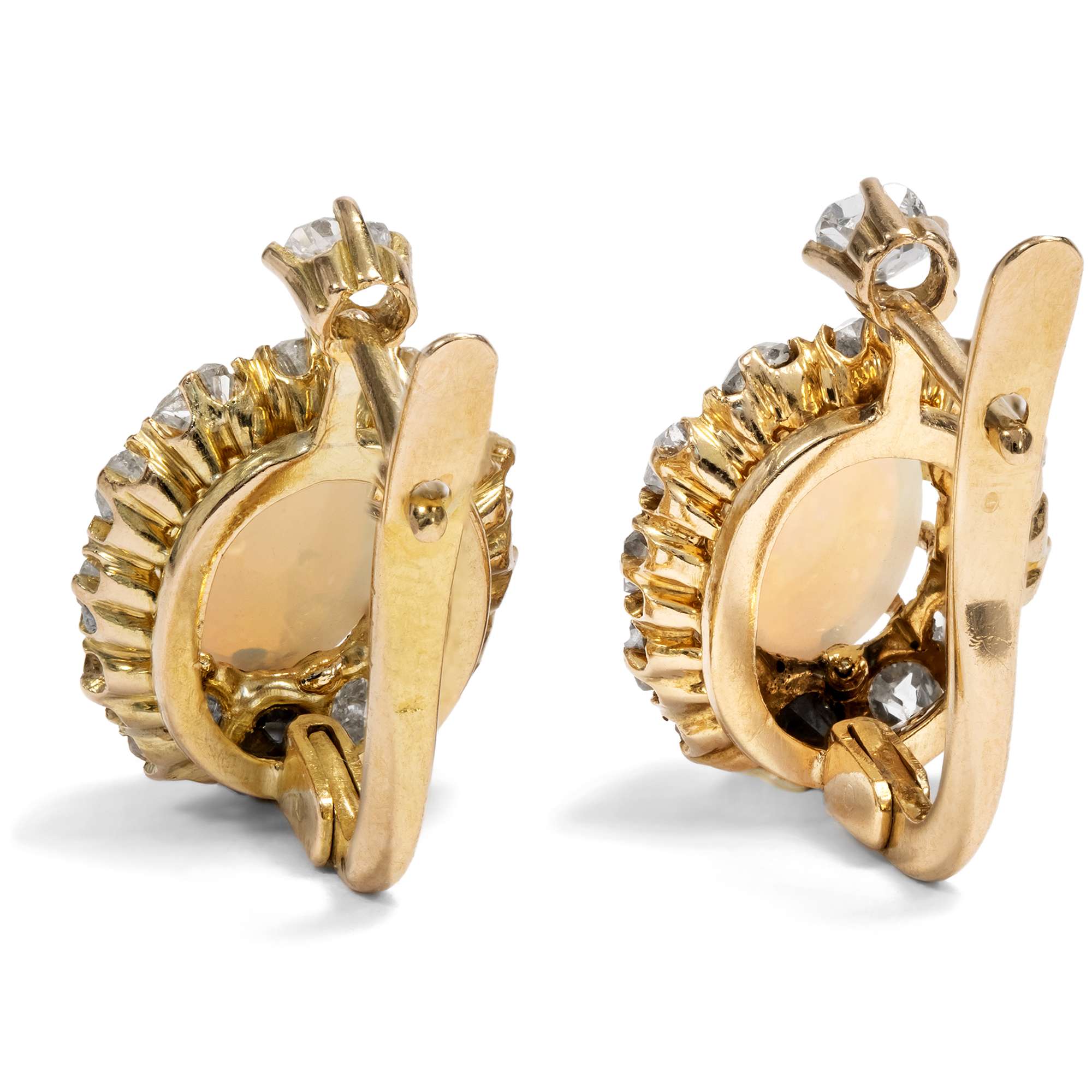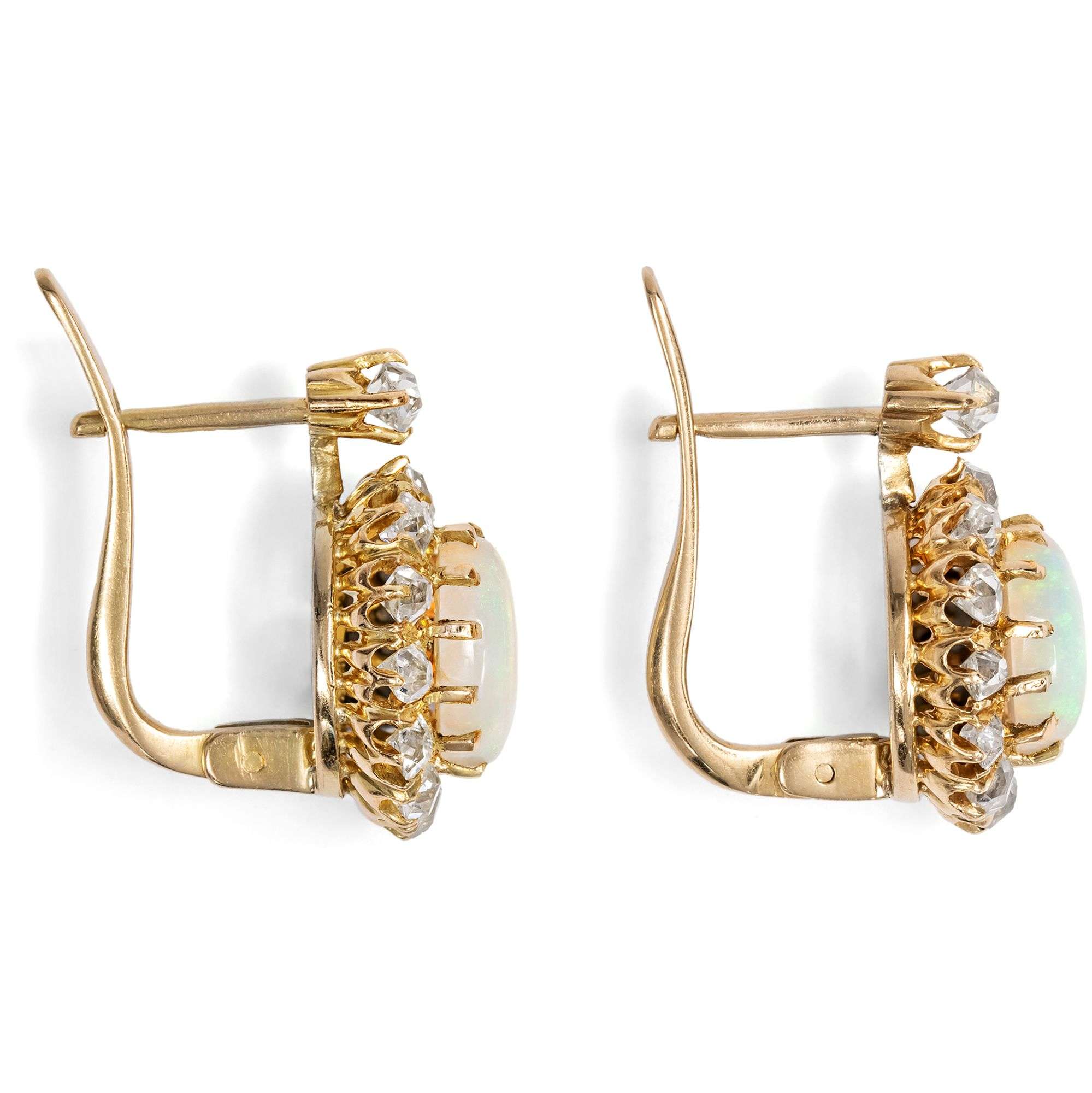 Schöne, gut erhaltene Ohrringe aus jener Zeit zu finden, ist daher eine Seltenheit! Umso größer ist die Freude, heute die hier vorliegenden Ohrringe anbieten zu können. Jeder der beiden Ohrringe trägt einen schimmernden Opal, dessen farbiges Spiel von einem Kranz aus Diamanten umrahmt wird. Die Diamanten zeigen historische Schliffe, die belegen, dass sie bereits im Barock geschliffen worden sind und hier eine Zweitverwendung erfahren haben.