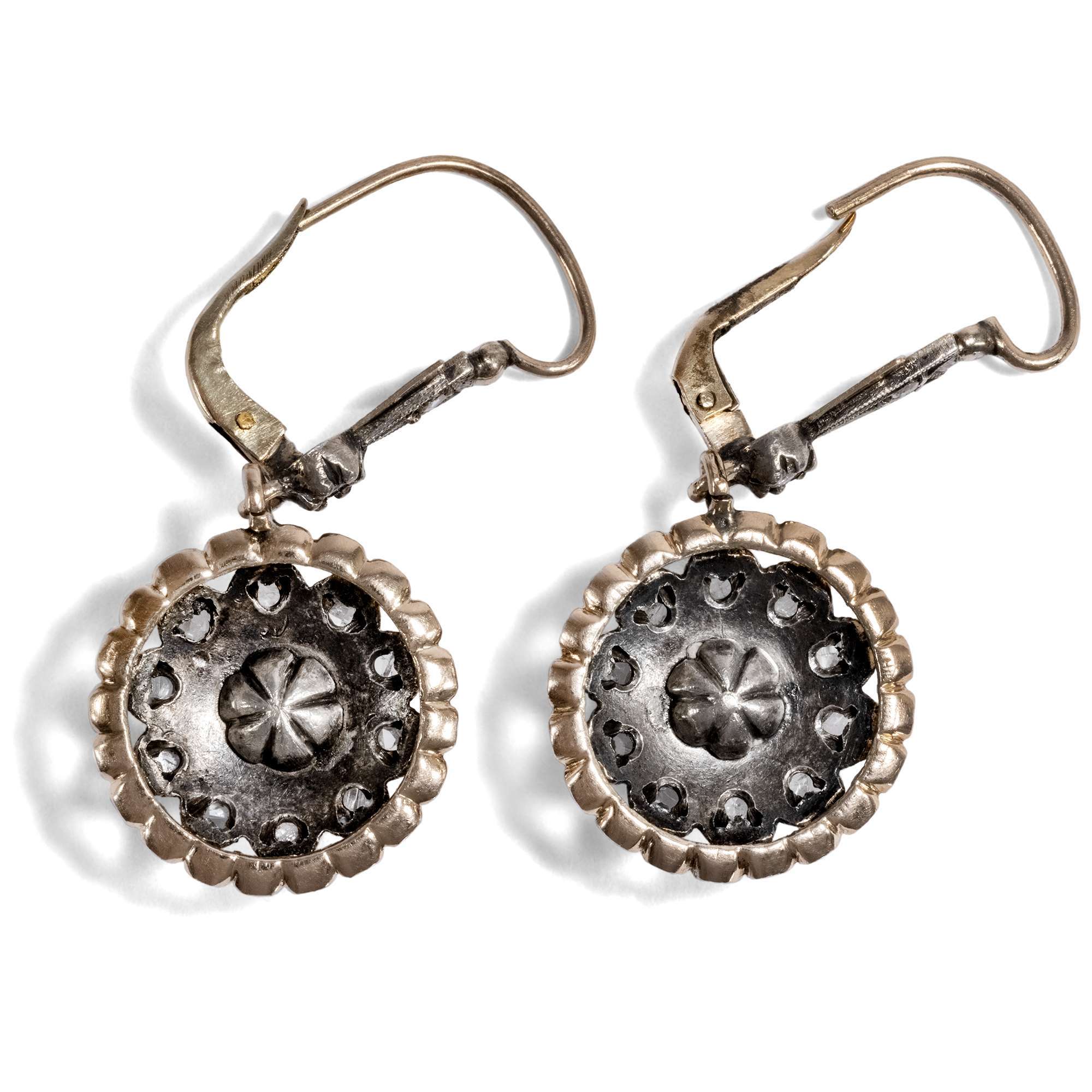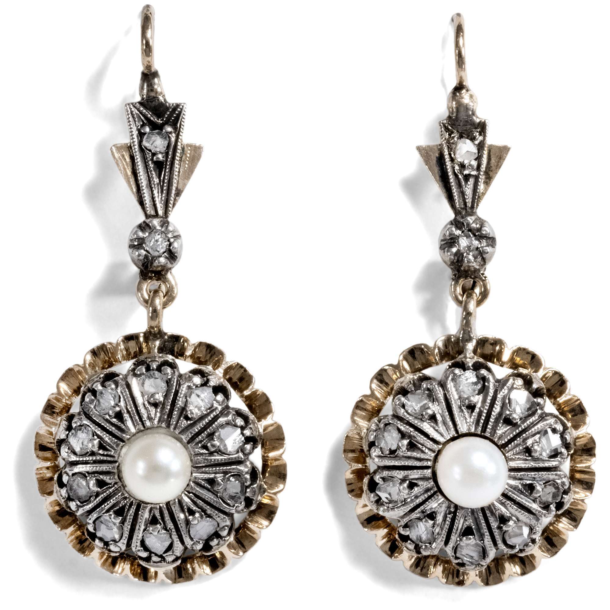 Die vorliegenden Ohrringe stammen aus dieser Epoche und zeigen sich als lange Hänger. Sie präsentieren sich als große Blüten, die beweglich unter den Brisuren abgehängt sind. In ihrer Mitte schimmert jeweils eine schöne Zuchtperle in einem Kranz aus Diamantrosen. Die Brisuren und Rahmungen der Ohrringe sind aus leicht rötlichen Gold gefertigt, während die Diamanten in Silber gefasst sind – ein subtiler Verweis auf den Diamantschmuck der viktorianischen Zeit.