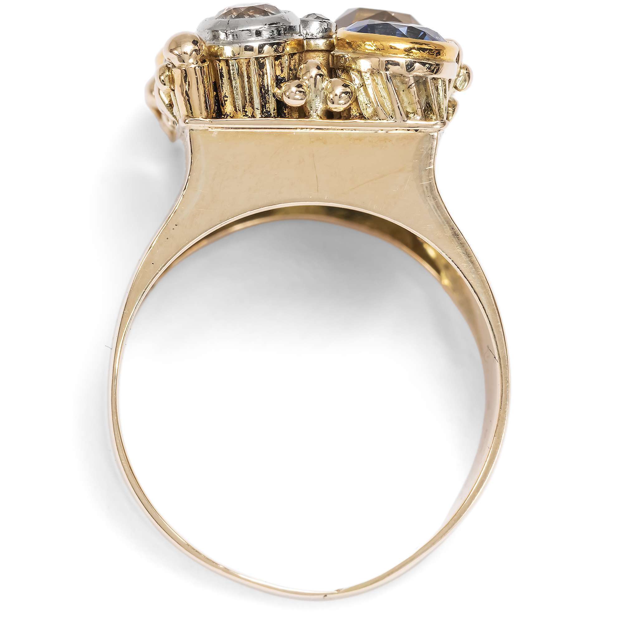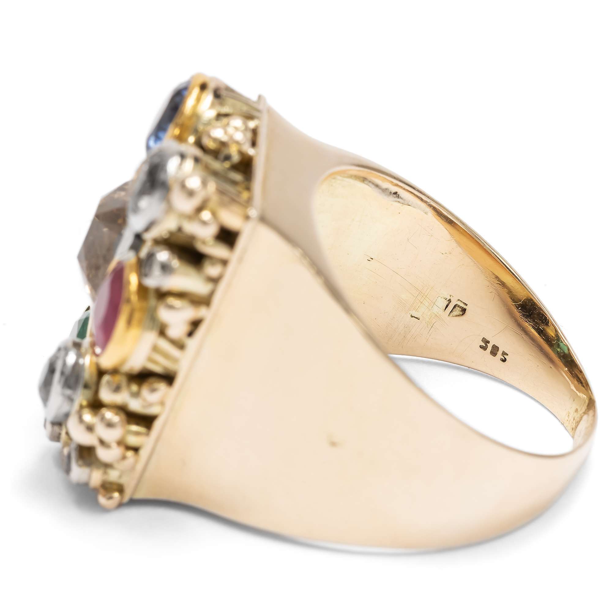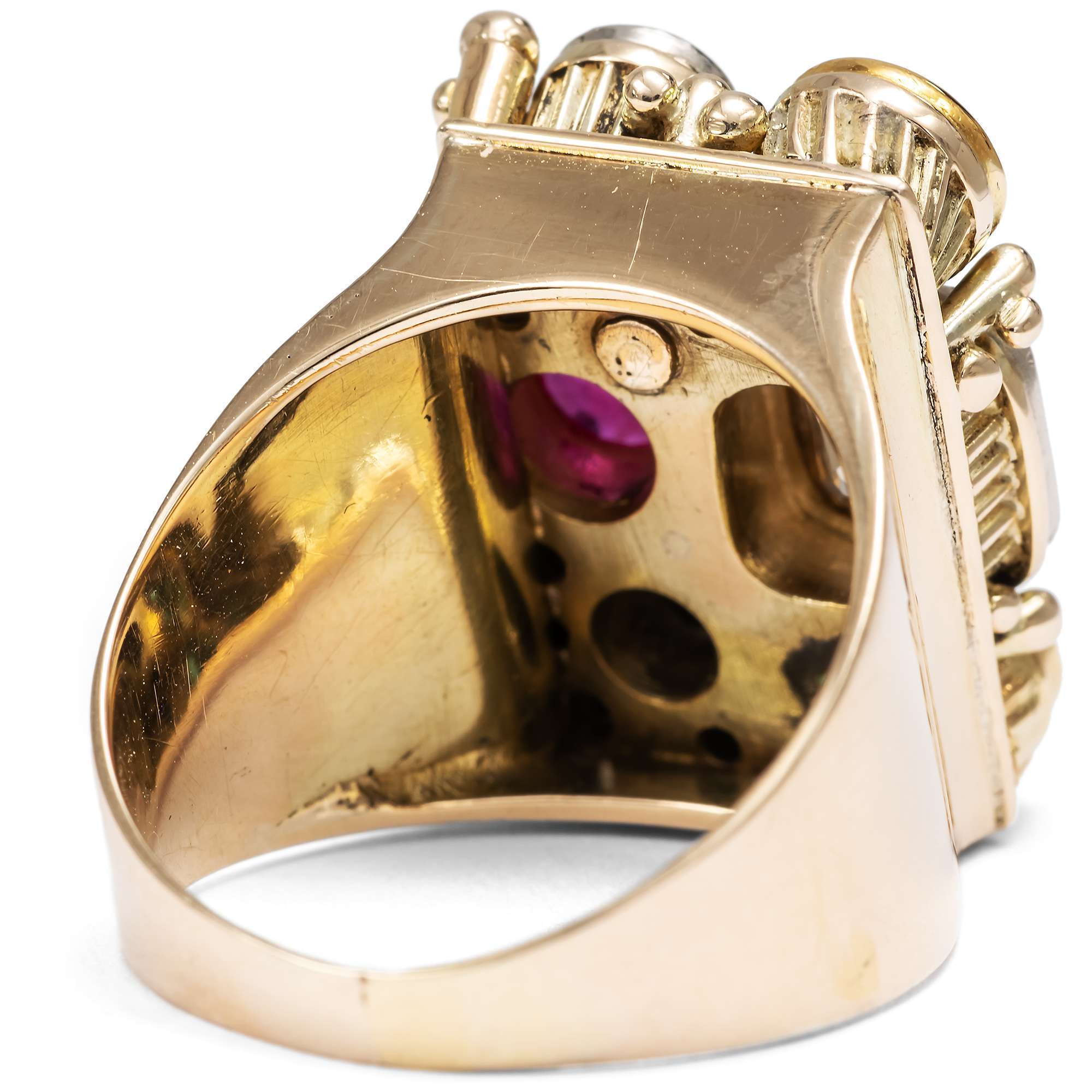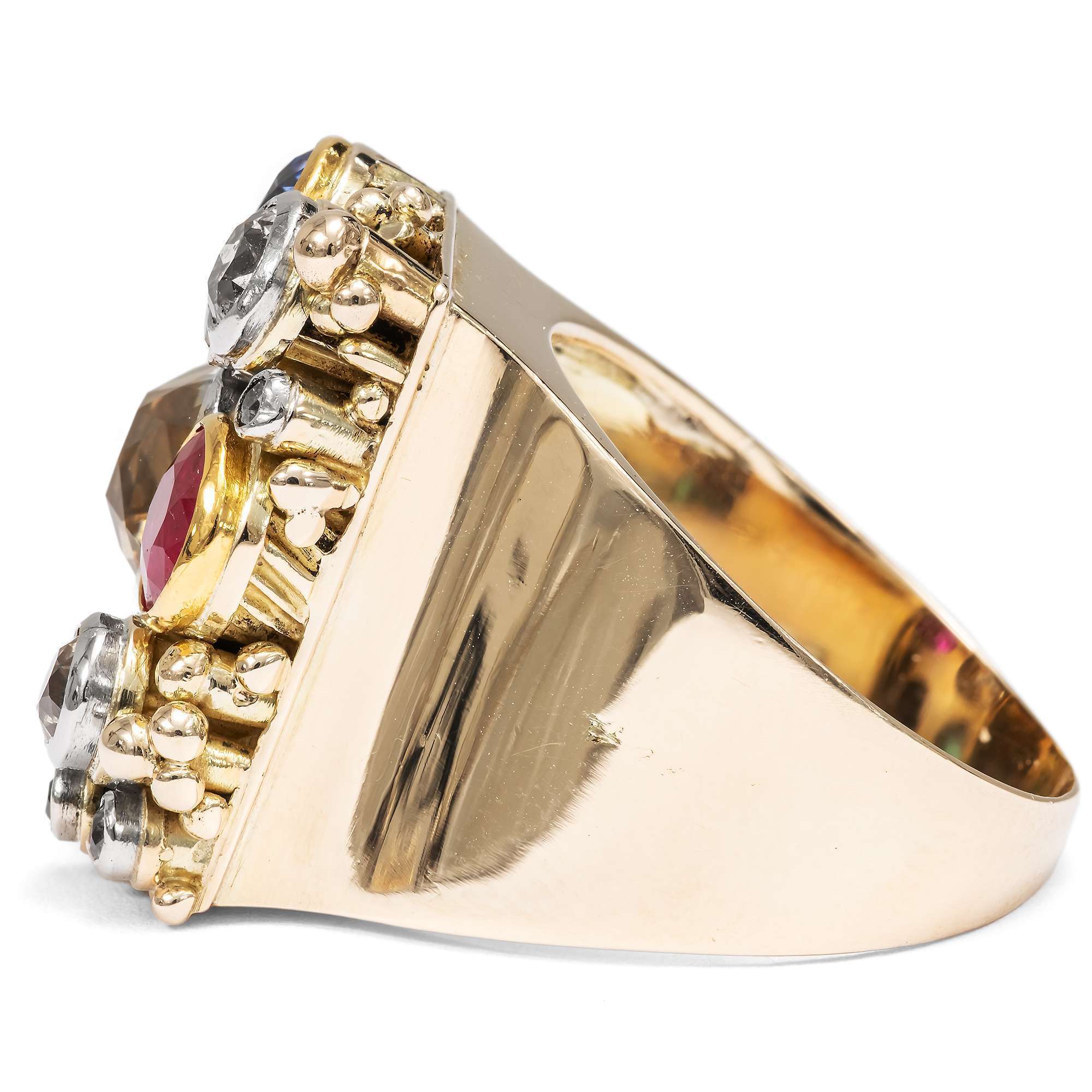 Der Ring ist im Deutschland der Weimarer Republik entstanden. Dies legt nicht nur der typische Entwurf nahe. Ein deutliches Zeichen für diese Entstehungszeit ist auch die Verwendung von ungewöhnlich niedrig legiertem Gold sowie die Verwendung deutlich älterer Edelsteine: Die Diamanten sind Steine des 19. Jahrhunderts, die in einer Zeit der wirtschaftlichen Beschränkung hier wiederverwendet wurden. Die Farbsteine haben wir in unserer Werkstatt erneuert. Es waren synthetische Edelsteine gefasst worden, die jedoch so stark getragen waren, dass sie nicht erhalten werden konnten.