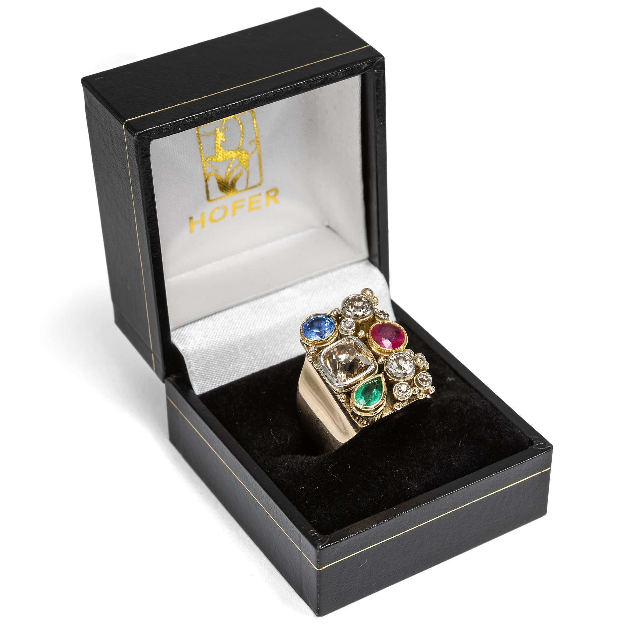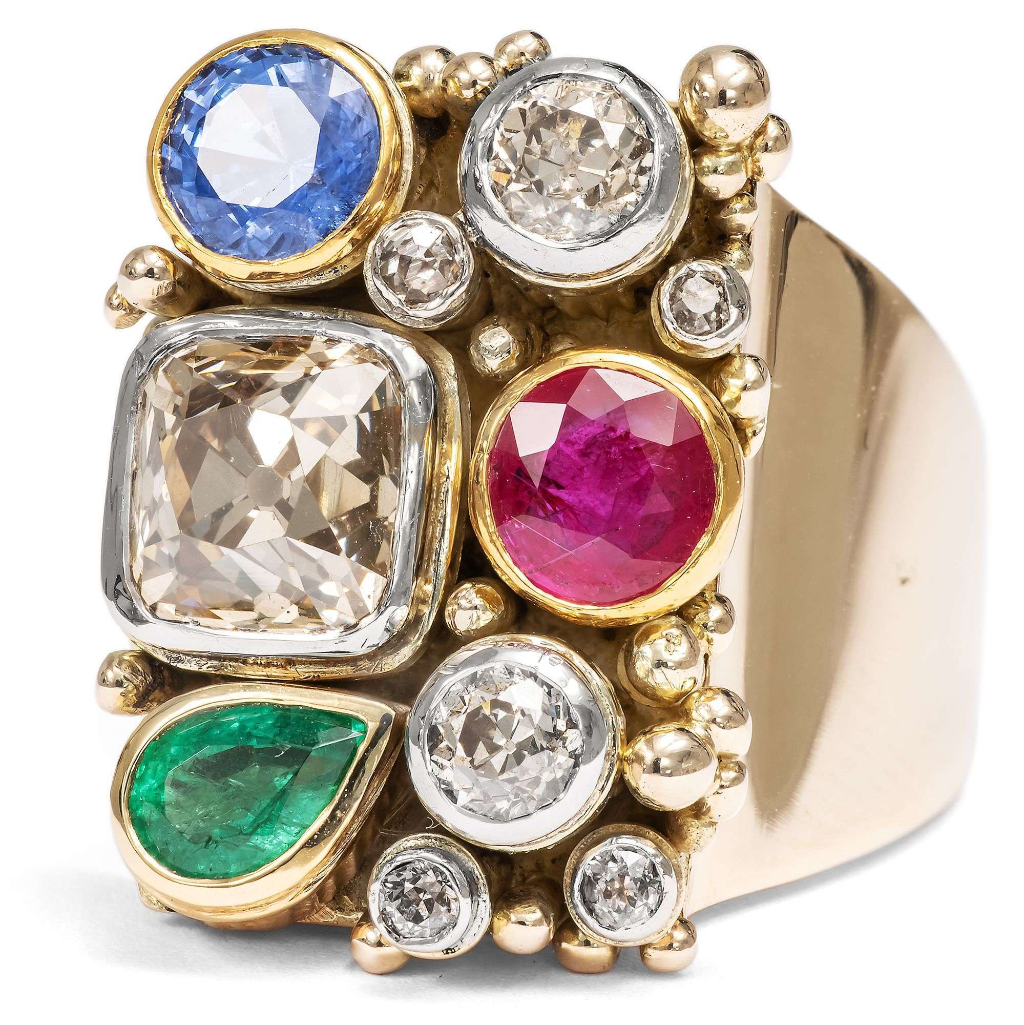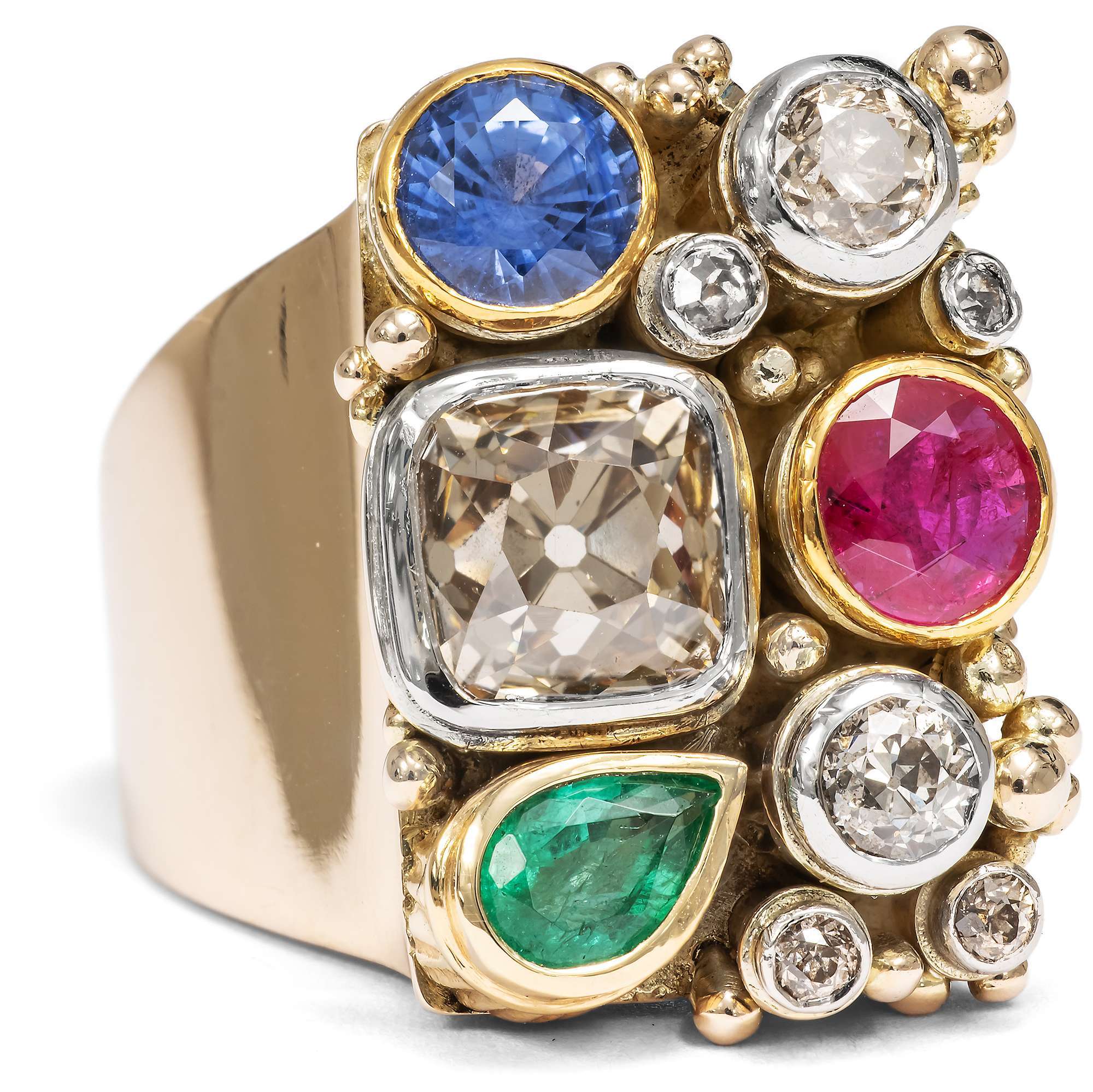 | Material: | Ein Diamant im Altschliff (Old Mine Cut), ca. 1,90 ct, 6,9 x 7,0 mm, Getönt„ light brown“ (Cape, S-Z), pi Sechs Diamanten im Altschliff (Old Mine Cut und Old European Cut), zus. ca. 0,50 ct, Getönt (Cape, M-R), si-pi Ein natürlicher Rubin im Sternschliff, rund, ca. 0,72 ct, 5,5 mm Durchmesser Ein natürlicher Saphir im Sternschliff, rund, ca. 0,80 ct, 5,1 mm Durchmesser Ein natürlicher Smaragd im Tropfenschliff, ca. 0,37 ct, ca. 4,2 x 5,6 mm Durchmesser Gelbgold und Weißgold 450/000, entspricht ca. 10,8 Karat |