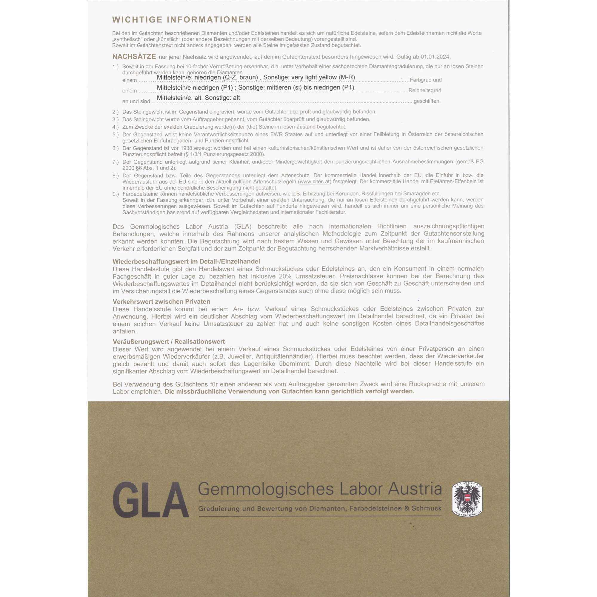 | Zertifikat: | Lieferung mit einem detaillierten Gutachten des Gemmologischen Labors Austria, Wien, vom 30. Juni 2025. Festgestellter Wiederbeschaffungswert: 12.500,- Euro. |