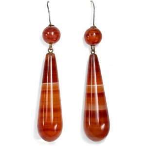 Damen sehen wir bei dem vorliegenden Paar antiker Ohrhänger. Die Gemmen zeigen zwei detailreiche Portraits im Profil. Geschmückt mit Weinlaub in ihren elegant frisierten Haaren, heben sie sich in marmornem Weiß schön von dem zweifarbig gestalteten Untergrund ab.