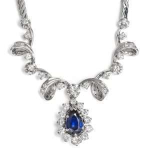 Fein getriebene Blattornamente umgeben den Edelstein, fünf kleine Diamanten in Fassungen aus Platin geben dem Entwurf zusätzliche Lichtpunkte. Der Anhänger ist von seiner Grundform ganz dem modernen Geschmack des 20. Jahrhunderts verpflichtet. Stellen wir uns die Arbeit in Weißgold oder Platin vor und mit ein wenig graphischerem Dekor, könnte die Form des großen Anhängers für das Art Déco der 1920er Jahre nicht typischer sein.